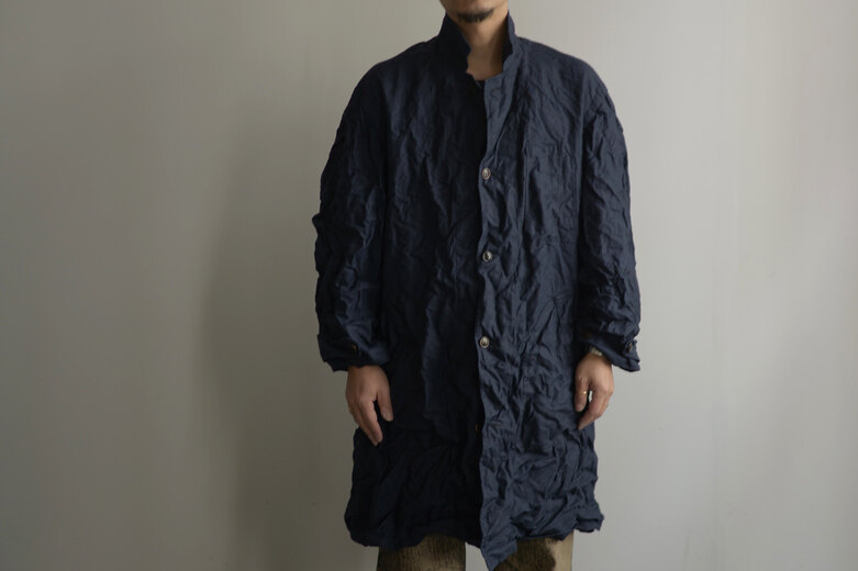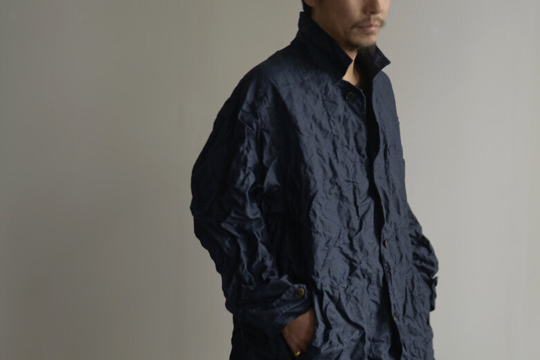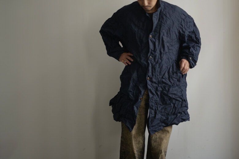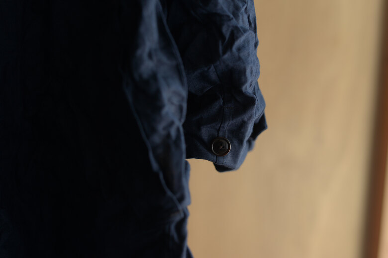 PROJECTbyH.のPOMPEII。独特な螺旋を描くようなパターンが特徴です。シャツとしても、シャツジャケットとしても使える優れもの。いつかデニムで・・と思っていたら前回のイベントで作られていました。自分も欲しかったこともあり、店頭用にもオーダーすることに。某ブランドの66モデルの生地を再現したデニムで、その上からお茶で染め、1から育てた鉄錆を使って染められています。アトリエに伺った時、本当に鉄錆を作っていました。初めから最後まで全て手作業。あえて大変な作業を経て作られています。だからこそ素晴らしい洋服が生まれるのだと確信しました。インディゴの上に染めるので、ほぼわからないかもしれません。しかし染めていないデニムと比べると全く異なる雰囲気になっていました。この染色のおかげで色落ちの仕方も変わってくると思います。ボタンは銅のタックボタン。デニム同様経年変化が期待できます。先がとても楽しみなデニムなのです。