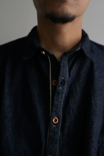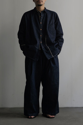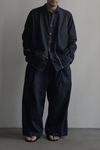 ここ2年は本当によく穿いています。デニム以上の満足感が得られています。茶色く見える理由は、経糸には硫化染めの黒糸、緯糸には茶綿を使用しているからとのこと。だから「真っ黒」ではなく、どこか温かみを感じる深みのある黒だったのかと納得。しかも、この黒×茶綿のデニムは旧式のシャトル織機でゆっくり丁寧に織り上げられたセルヴィッチ生地。ボタンは無垢の鉄、リベットにはアルミを使用。経年変化が楽しみな素材選びにもこだわりを感じます。穿いてみると、腰回りはダボつかず、むしろスッキリとフィット。想像していたよりもずっと洗練されたシルエットです。今までのデニムとはちょっと違う、新しい感覚です。