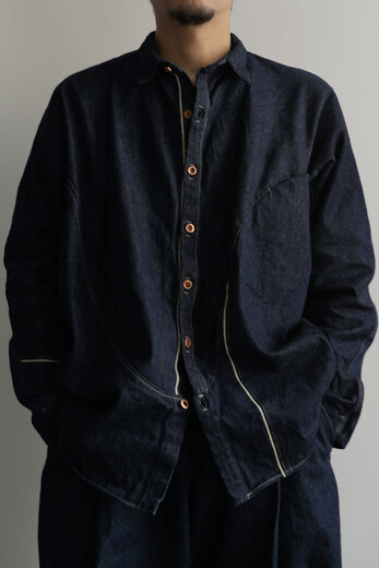 50年代のデニムの写真からビットマップのデータを作り、daisuke tanabeのデニムのパターンに無理やり合わせたジャガード。当時のものと大きさやパターンそのものが違うので、ずれている部分もあります。きっちり合わせるのではなく、あえてそのズレやダメージを柄として表現しています。その発想とプロセスにとても興味を持ちました。古びた色合い、でもそれは色褪せているわけではありません。その違和感がとても楽しく感じます。COFFEE BLACK DENIMとはまた違った気分が味わえます。