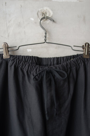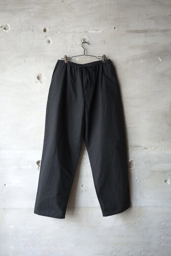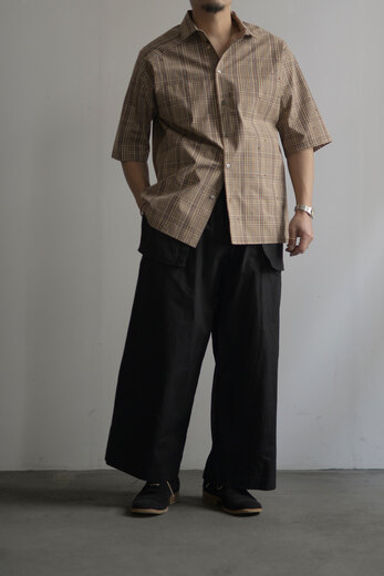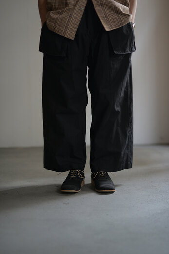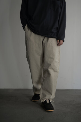 本を収納、持ち運ぶためのパンツ。今回のwritten byはポケットがテーマです。展示会にお伺いした際、洋服を手に持つとなんだか重いなと思っていたら全てのポケットに本が入っていました。本を読むことは好きです。いつも鞄に入っています。電車に乗って、座れたら座って、鞄を開けて本を取り出して読む。しかし、この動作が少し億劫な日もあります。ポケットに本が入れば、もっと気軽に本が読めるのでは?とコレクションを見て感じました。アメリカ軍の通称モンキーパンツから着想を得た新型。超高密度の馬布が使われています。ハリがあってドライな肌触り。ワイドシルエットなので、夏場も快適に過ごせます。手を入れるスラッシュポケットを付けるため?に少し前めに付いた両サイドのポケットは文庫本やハード本も収まります。もちろん漫画もです。大きなバックポケットは固定せずに独立した状態で縫われているので、特有のごわっとしたシルエットにはなりません。本を読むという事は、想像する力が高まり、思考するクセがつくような気がします。このパンツを穿いて、本をもっと身近に感じてもらえたらと思いました。