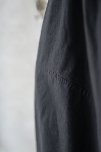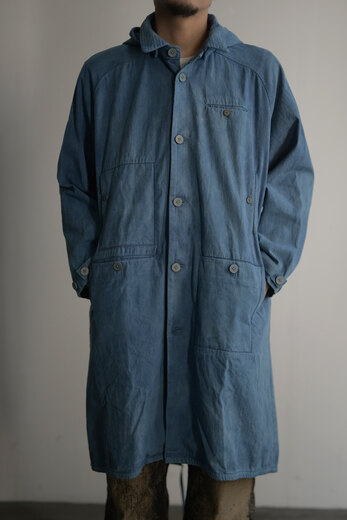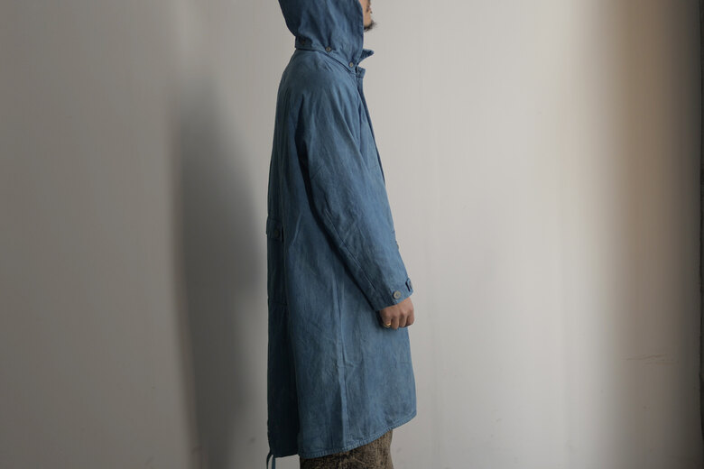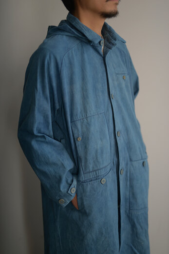 一昨年、このコートをお店で販売した。とても好評で自分の分を確保する事が出来なかった。着ると腑に落ちような格好良さ。それがどうしても忘れられず、今回オーダーする事に。”およそ100年経過したインディゴの色”をリクエストし、コットンシルクの生地を染めてもらう。初めに玉ねぎの皮で染め、その後にお茶で染め、最後にインディゴで3−4回染めたそうでそれを聞いただけで大変な事をお願いしてしまったけど、だからこそとても美しい色に仕上がりました。沢山のポケットがありフードが脱着できる機能的なDUNN。一枚仕立てでシーズンレスなコート。コットンシルクは着込んでいくとトロッと柔らかくなり、ここから褐色も楽しめる。冬は暖かいニットを着て、春や秋はシャツを着て。結局1番着た、と言えるコートになるのではないでしょうか。