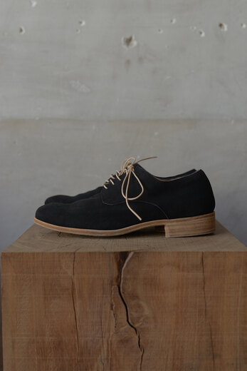 初めてPETROSOLAUMを手にしたのが10年前。その時のラストがこの02でした。この革を見た時に久しぶりに履きたいと思いました。ディアスキンに奄美大島で泥で染め、そこから藍を入れ、限りなく黒に近づけた革。染めては乾かし、染めては乾かし。とても手間のかかる作業。だからこそ素晴らしいプロダクトが生まれるのです。履いていくとどんな風に変化していくのか?聞くと少しずつ泥染めの茶色が出てくるそうです。履きこんだ先のそれを見てみたい!と思ってお店に並べることにしました。製品で洗いも掛けてあるので初めから良い雰囲気。軽やかで、柔らかく、歩いてみるととても快適でした。