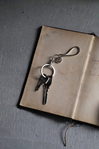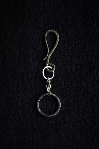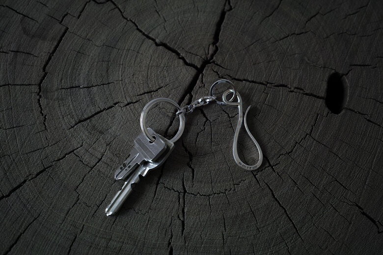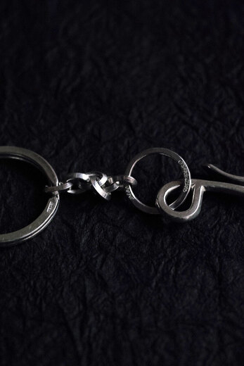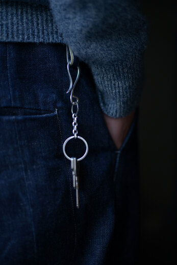 PROJECTbyH.のパンツ。どのデザインもとても気に入っていてキーリングを引っ掛ける様なループが付いている。これを見た時、どうしてもキーリングを付けたくなった。そしてAVMの古川さんにすぐに相談し製作して頂ける事になった。モデル名は『HOOK』、SILVER950で全て手作業で作られている。引っ掛けるフックが針の様に見え、それを繋ぐリングにTIGHT LINEの刻印があった。古川さんにフックや刻印の意味を伺うと『TIGHT LINEは釣り人の挨拶みたいなものですが、糸を張っておけみたいな意味です。引っ掛かるキーが落ちないようにと、アンテナを張っておくみたいな意味で彫りました。フックの形状は何となく釣り針のイメージで、大きな獲物を狙う=夢や何かを叶えるようなイメージですね。』との事。今の自分に凄くしっくりくるコンセプトだった。