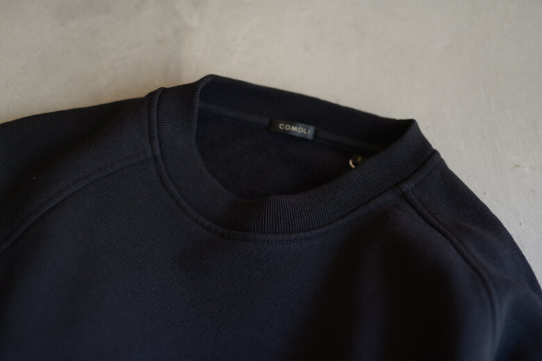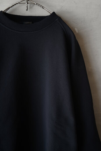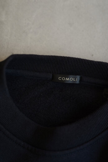 何気なく、気軽に、長く着れる(着たい)洋服。でも雰囲気があって・・・。COMOLIにはそういう物が多くある。いつもそこにあってとりあえず着とけば大丈夫。気分も上がるし格好良い、けど格好付けてない。そんなイメージの洋服。空紡糸を使った裏毛のスウェット。吊編み機でゆっくり、しっかりと織り上げられている。初めは少し硬めで着ていく内に柔らかくなり、どんどん気持ち良くなる。使い古したスウェットは昔からとても好きで、あの何ともいえないフェードした色と生地のクッタリ感、使い続けているといつの日かそんなスウェットになる気がします。