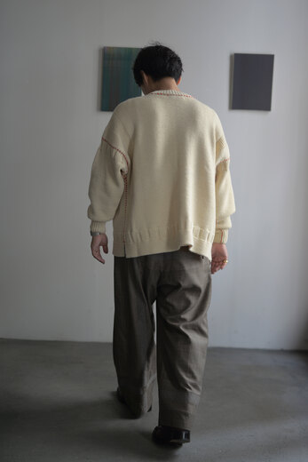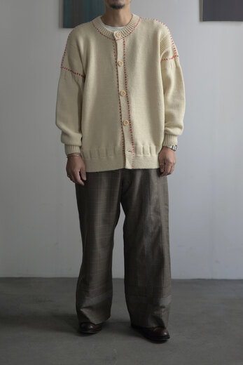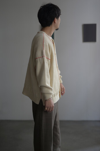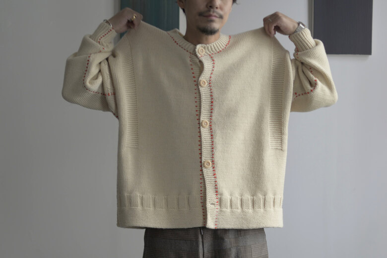 ガンジーセーターをイメージするとガチガチに固くて重たい。あの粗野な感じが魅力でもあります。このカーディガンの糸は染色されていない無垢な羊毛の色です。少し粗めのウール糸を梳毛と同じ紡績で作られているので、光沢があり、上品な雰囲気の糸になります。そして家庭機を使って編まれているので柔らかく、肌触りもすごく良いのです。赤い点々ステッチはハンドステッチにて施されています。この手仕事のニュアンス、とても良いなと思いました。