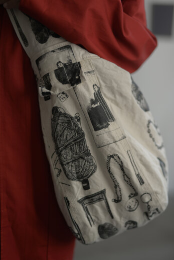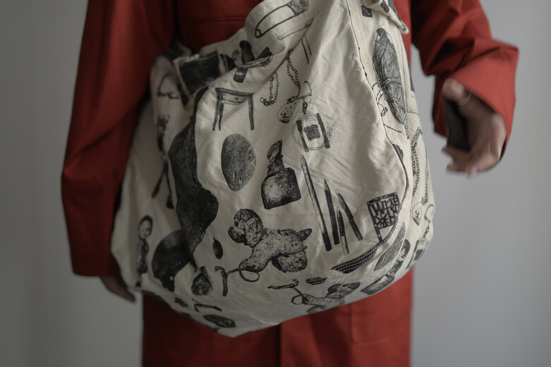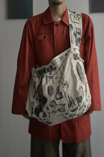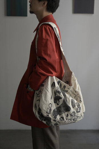 とにかくでかい鞄が好きなんです。たとえ財布一個だったとしても、鞄は持ちたいと思っています。その日のアクセサリーのような感覚です。もしかしたら荷物が増える場合があるかもという心配性な部分もあるかもしれません。このカバンは元々無地でした。良い雰囲気の帆布、中にはキルトが入っていて独特な膨らみがありました。僕には真っ白なキャンバスに見えました。そしてパッと閃いたのです。Tシャツにプリントされていたリサーチマーケットの柄を全面にプリントするのはどうかと。そんな僕たちの思い付きを形にしてくれました。使い込んで、汚れさえも柄の一部になっていくような・・。