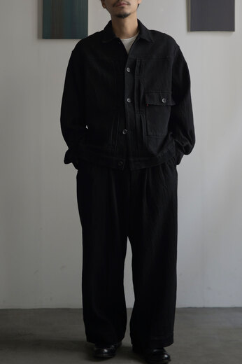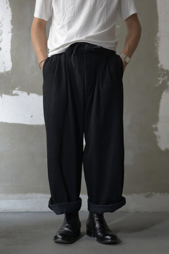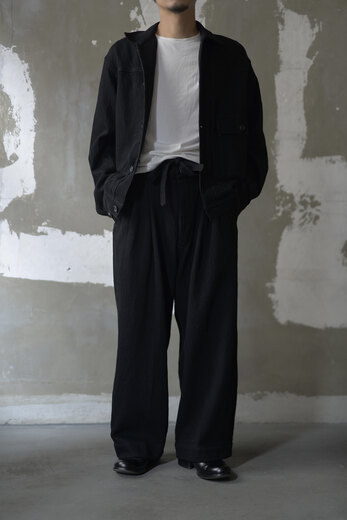 甘く織られた太綾のデニム、デニムとは思い浮かべる表情とは全く異なります。柔らかく、空気を孕むような膨らみがあり、体を優しく包み込んでくれます。全く頑張らなくて良いデニムパンツです。ウエストは大きめに作られていて、左右のベルトと紐で調整が出来ます。シャツやカットソーをインしたり出したり、少し食べ過ぎてしまった時などウエストが調整できるのは有り難いです。ワンタックでストンと落ちるキレイなワイドシルエット。ジャケットと同様にドローイングをイメージしたハンドステッチが施されています。