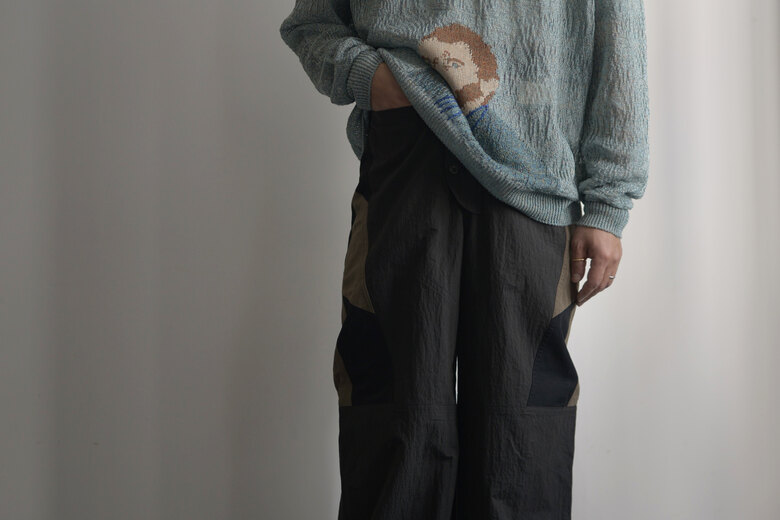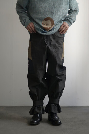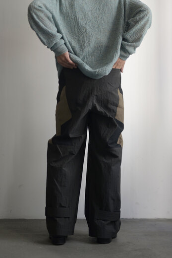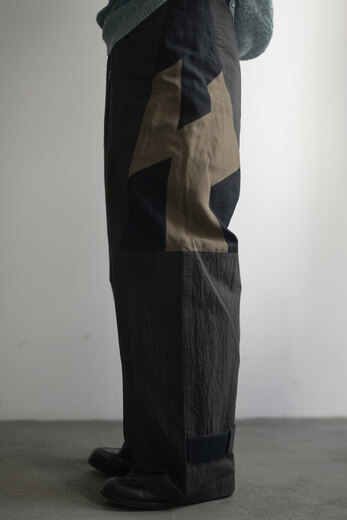 決してモチーフ通りの使い方が出来るわけではないけど、デザインとして日常に落とし込むからこそ、新しい景色が見えてくるような気がします。それはとても新鮮に感じられます。デザイナーがベトナムにてバイクタクシーに乗ったことがきっかけで生まれたライダースデザインのパンツです。本体はコットンナイロン。軽く、柔らかさがあり自然なシワが魅力的です。サイドに異素材でパッチワーク。ウエストはベルトで調整します。裾にもベルトがあり調整可能。