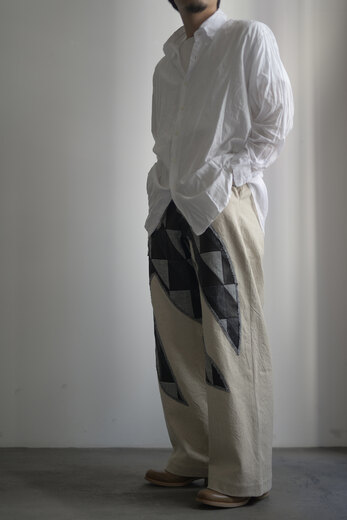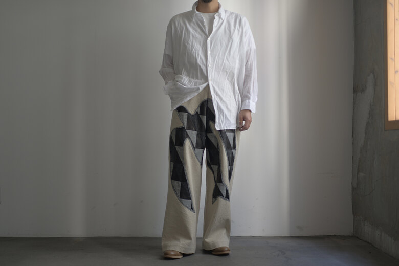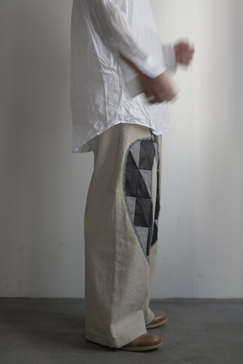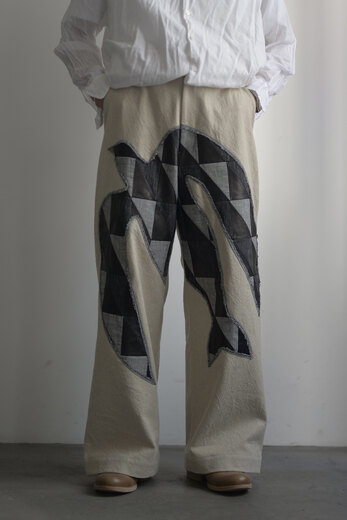 ど真ん中に羽ばたく鳥がいます。パンツという限られた場所に目一杯。カウレザー、ストライプやチェックで表現した鳥。ドローコードもレザーです。体が入ると不思議でした。妙に馴染むというか、この不自然な感じが心地よく思うのです。それは本体の生地が良さも要因かもしれません。コットンリネンでどこか使い古されたような雰囲気。粗野。ヴィンテージ。それは特殊な染料を使っているからだそうです。アトリエで時間を掛けて作られています。
