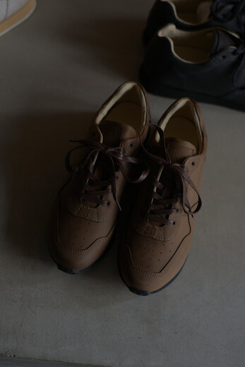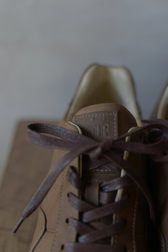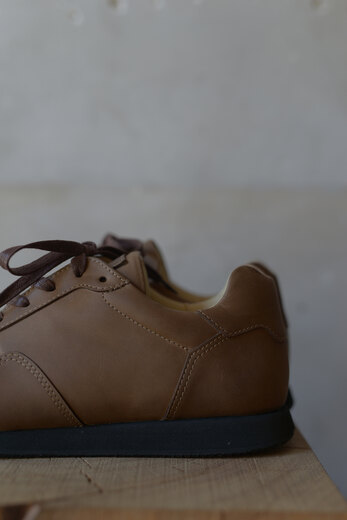 サンクトペテルブルクの工房にて手作りされているAFOURの革靴のようなスニーカー。特殊なマット加工を施した経年変化を楽しめるオイルドヌバックレザー。ライニングにはベジタブルタンニン鞣しのレザーを使っていて、優しく、しっかりと包まれる様な履き心地。ソールが固めなので長時間歩いても疲れにくく、どこまでも歩きたくなる様な、そんな気分にさせてくれます。防水加工も施されているので、雨の日も安心です。ふと足元を見た時に革靴を穿いているかのような、心の躍る感覚があり道具としての用途だけではなく高揚した気分を味わえる素晴らしい靴だと感じています。少し明るめなブラウン。履きこんでいく内に深く良い色になりそうです。