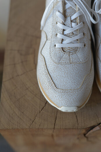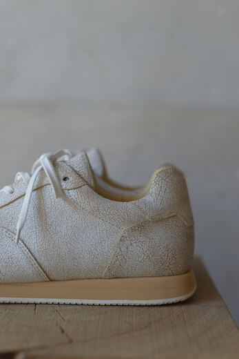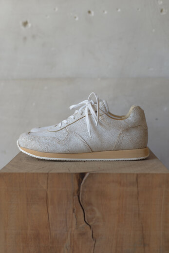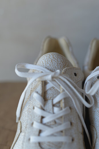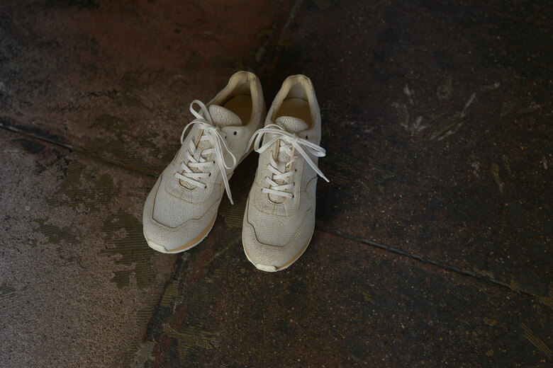 クラックレザーを使ったCODE。表面にクラック加工が施されていて、そのひび割れていくさまがまるで氷が割れていくようにも見えるとても雰囲気のある素材です。今回はベースがベージュ色。雪が溶け、地面が見えてくるようにベージュが少しずつ現れます。長く履き込むことで、普通のレザーとは違った経年変化が楽しめます。CODEのソールは固くしっかりとしているので、長時間歩いても疲れません。地面が足に伝わってくる、そんな感覚になります。