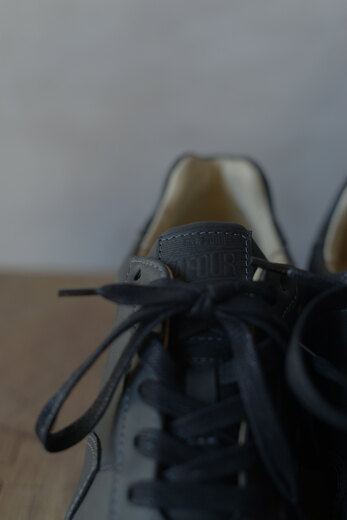 サンクトペテルブルクの工房にて手作りされているAFOURの革靴のようなスニーカー。特殊なマット加工を施した経年変化を楽しめるオイルドヌバックレザー。ライニングにはベジタブルタンニン鞣しのレザーを使っていて、優しく、しっかりと包まれる様な履き心地。ソールが固めなので長時間歩いても疲れにくく、どこまでも歩きたくなる様な、そんな気分にさせてくれます。防水加工も施されているので、雨の日も安心です。ふと足元を見た時に革靴を穿いているかのような、心の躍る感覚があり道具としての用途だけではなく高揚した気分を味わえる素晴らしい靴だと感じています。限りなく黒に近いチャコール。日光に当たると違いがわかります。