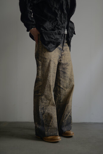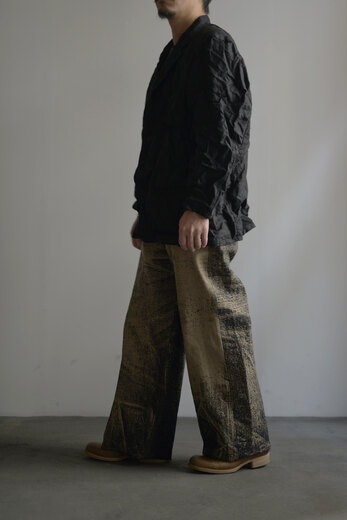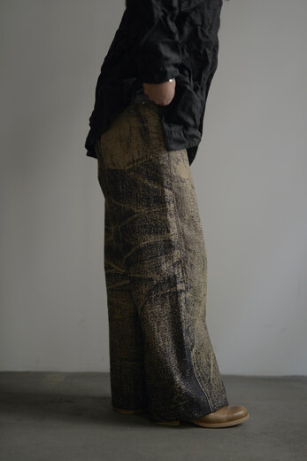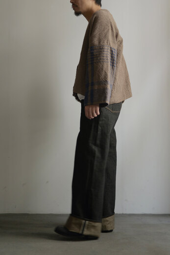 50年代のデニムの写真からビットマップのデータを作り、daisuke tanabeのデニムのパターンに無理やり合わせたジャガード。当時のものと大きさやパターンそのものが違うので、ずれている部分もあります。きっちり合わせるのではなく、あえてそのズレやダメージを柄として表現しています。その発想とプロセスにとても興味を持ちました。古びた色合い、でもそれは色褪せているわけではありません。その違和感がとても楽しく感じます。COFFEE BLACK DENIMとはまた違った気分が味わえます。