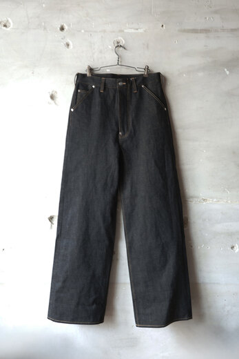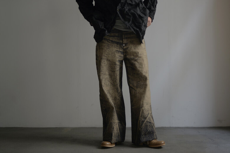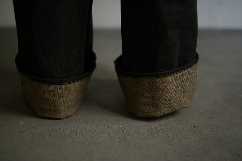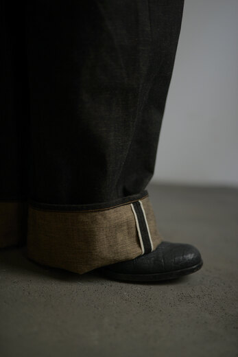 ここ2年は本当によく穿いています。デニム以上の満足感が得られています。茶色く見える理由は、経糸には硫化染めの黒糸、緯糸には茶綿を使用しているからとのこと。だから「真っ黒」ではなく、どこか温かみを感じる深みのある黒だったのかと納得。しかも、この黒×茶綿のデニムは旧式のシャトル織機でゆっくり丁寧に織り上げられたセルヴィッチ生地。ボタンは無垢の鉄、リベットにはアルミを使用。経年変化が楽しみな素材選びにもこだわりを感じます。穿いてみると、腰回りはダボつかず、むしろスッキリとフィット。想像していたよりもずっと洗練されたシルエットです。今までのデニムとはちょっと違う、新しい感覚です。
