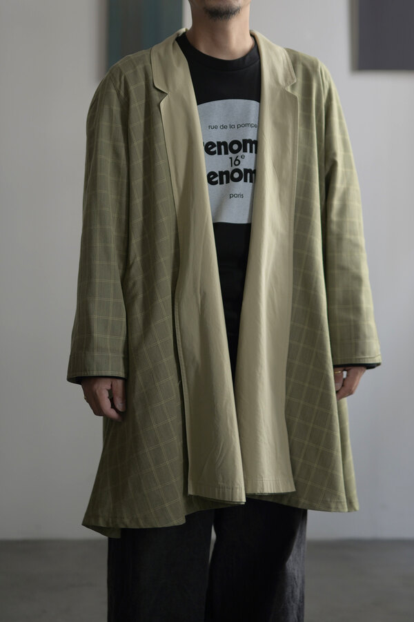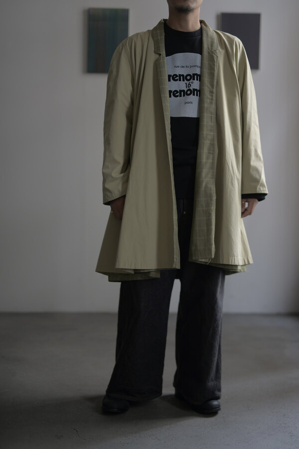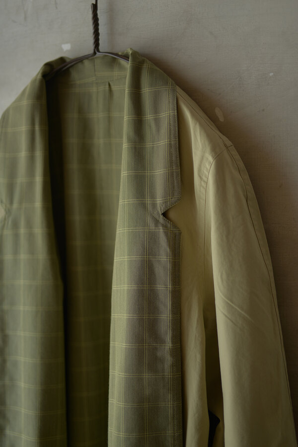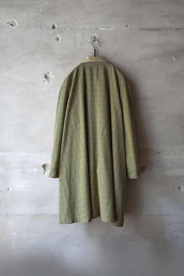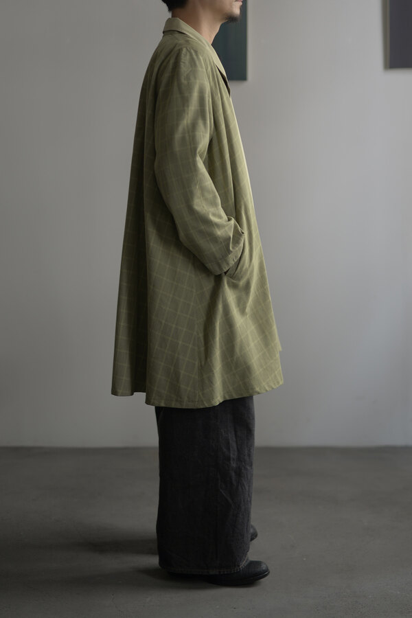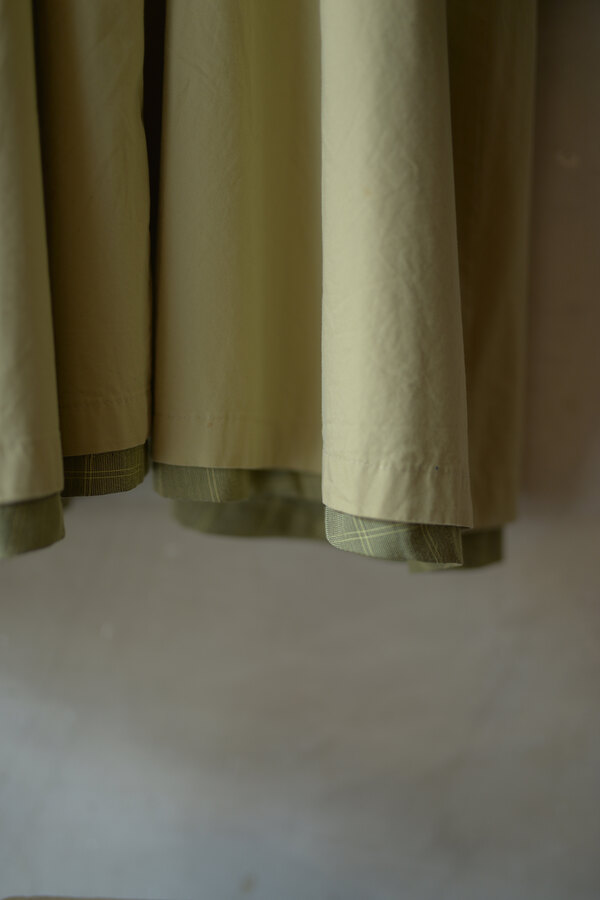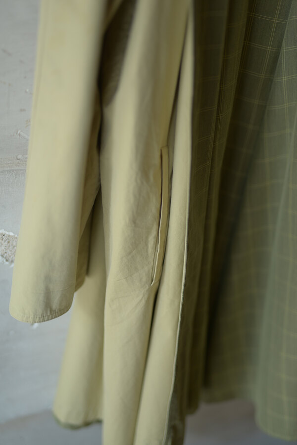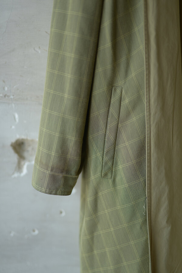 1980年代ー90年代のイタリアのダブルフェイスコート。 大胆なAラインシルエットのパターンで、着た際の緩やかで美しいドレープが特徴的。テー ラー顔負けの美しい仕立てで独特の肩つけが丸みのある肩線、現代性を生んでいます。”胸の大きなシミは美しいものではありませんが、前着用者のトラブル、ちょっとした物語性を想像できる面白いフックになる可能性を考慮したご提案です。”と伝えられた。時々シミや傷など本来では良しとしないものが時に何かを考えさせられたり、柄に見えたり、これもよいのではないか?と思えてくる不思議なものがある。そういう提案の仕方が凝り固まってしまった思想をぐにゃぐにゃに緩めてくれるのがLILY1ST VINTAGEだなと思う。無地を前にした時に裾から見えるチェックがとても綺麗で好きな箇所です。今きている上からパサっと羽織る。冬はセーターにストールなどで色合わせを楽しめる1着です。