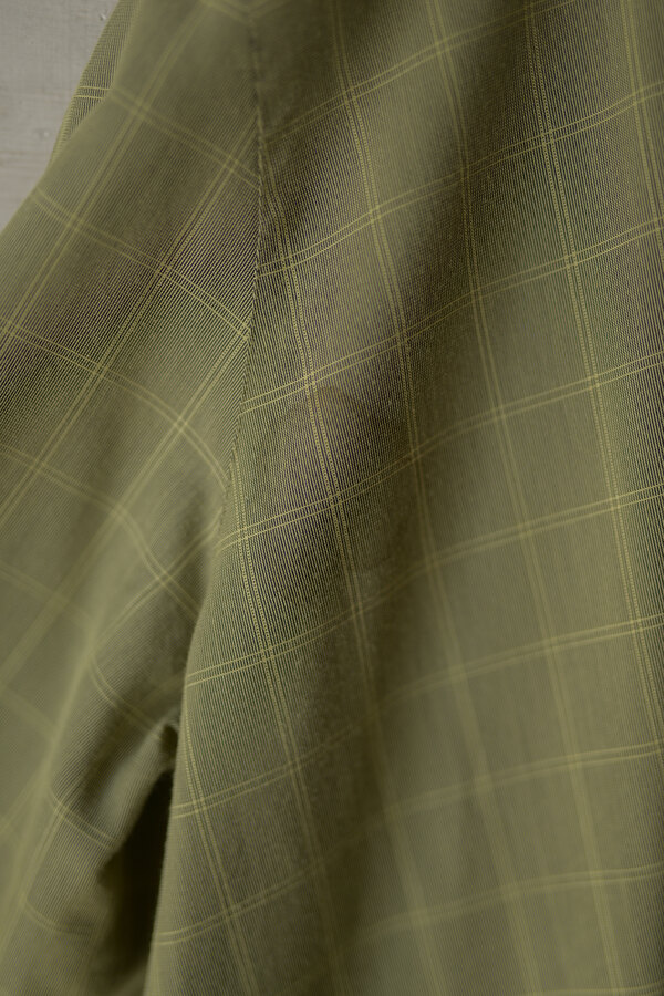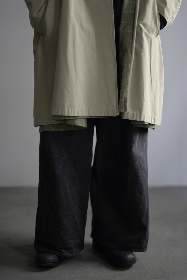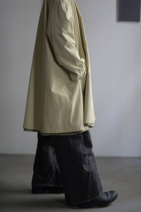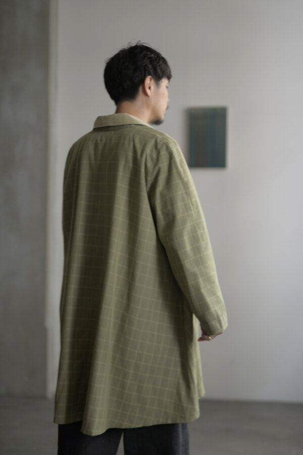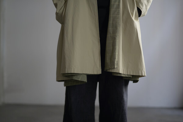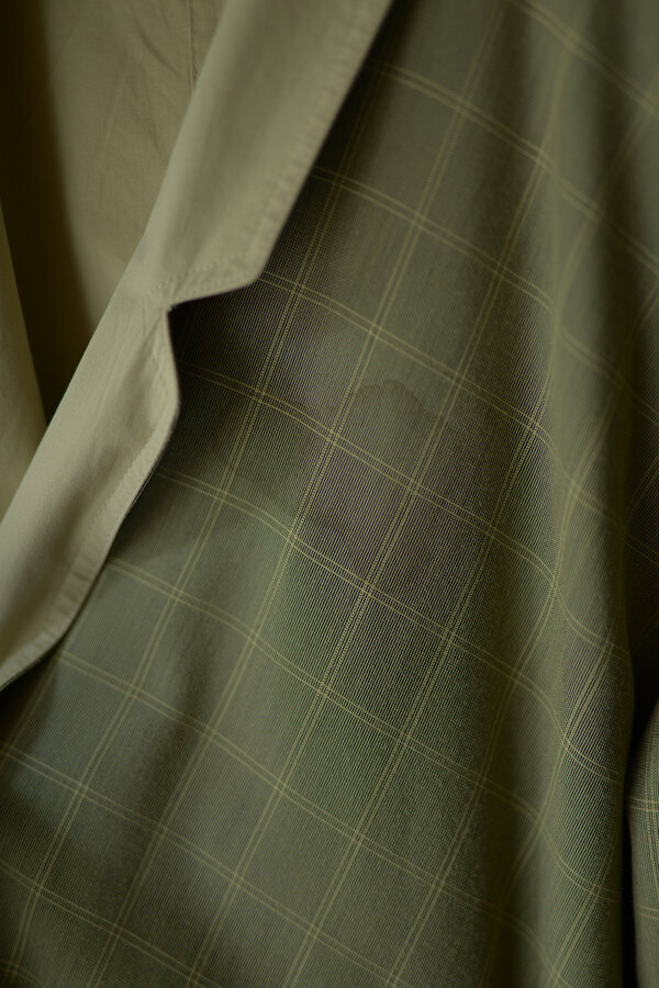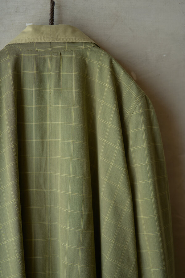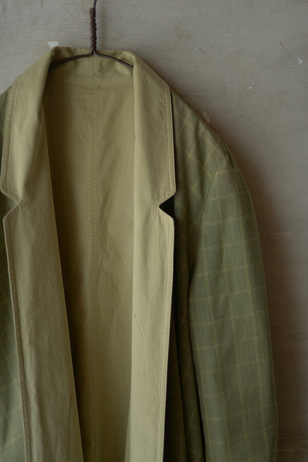 1980年代ー90年代のイタリアのダブルフェイスコート。 大胆なAラインシルエットのパターンで、着た際の緩やかで美しいドレープが特徴的。テー ラー顔負けの美しい仕立てで独特の肩つけが丸みのある肩線、現代性を生んでいます。”胸の大きなシミは美しいものではありませんが、前着用者のトラブル、ちょっとした物語性を想像できる面白いフックになる可能性を考慮したご提案です。”と伝えられた。時々シミや傷など本来では良しとしないものが時に何かを考えさせられたり、柄に見えたり、これもよいのではないか?と思えてくる不思議なものがある。そういう提案の仕方が凝り固まってしまった思想をぐにゃぐにゃに緩めてくれるのがLILY1ST VINTAGEだなと思う。無地を前にした時に裾から見えるチェックがとても綺麗で好きな箇所です。今きている上からパサっと羽織る。冬はセーターにストールなどで色合わせを楽しめる1着です。