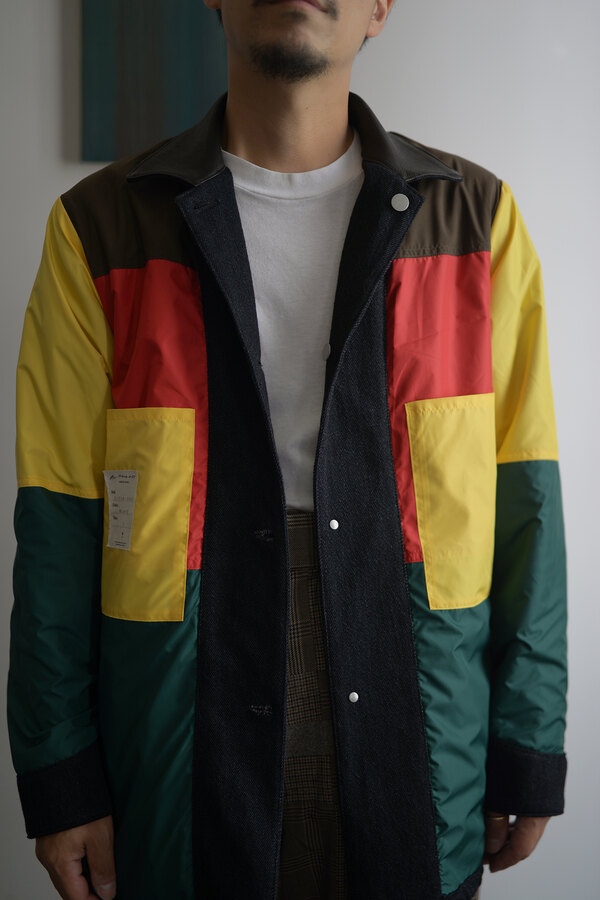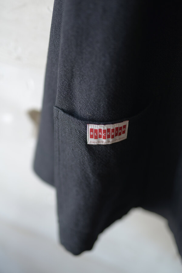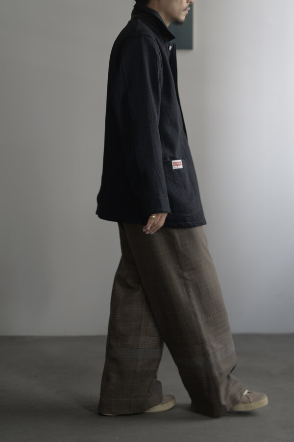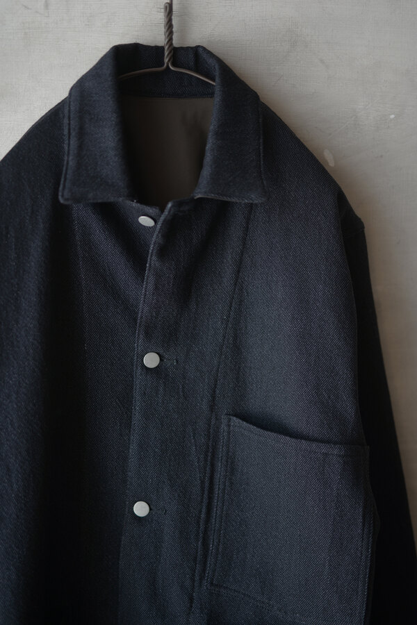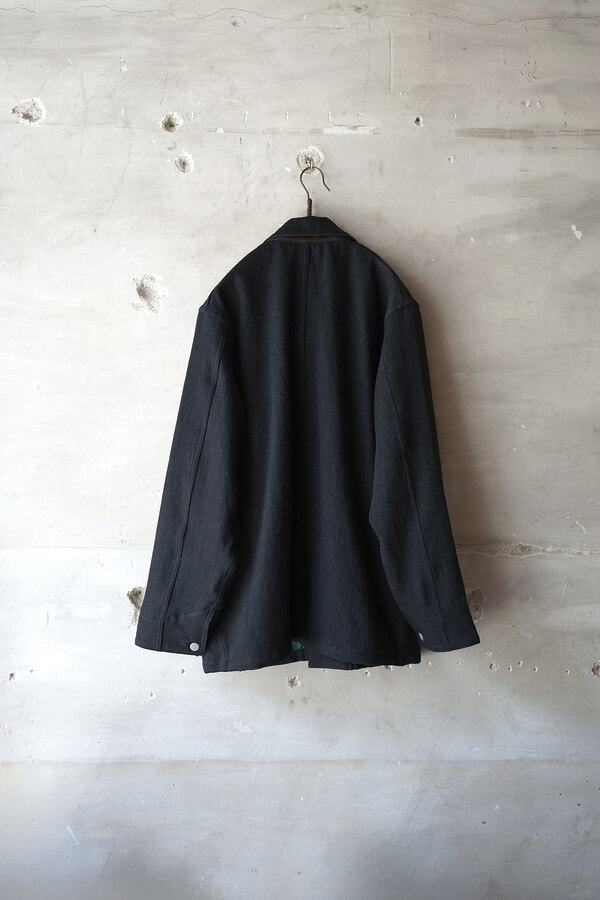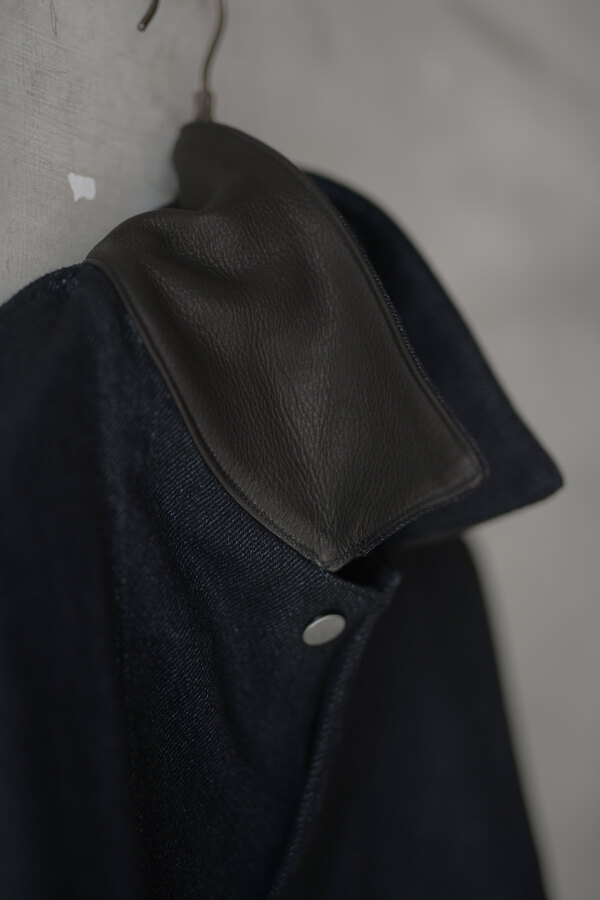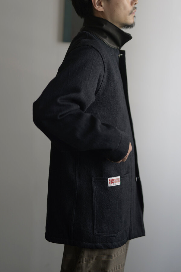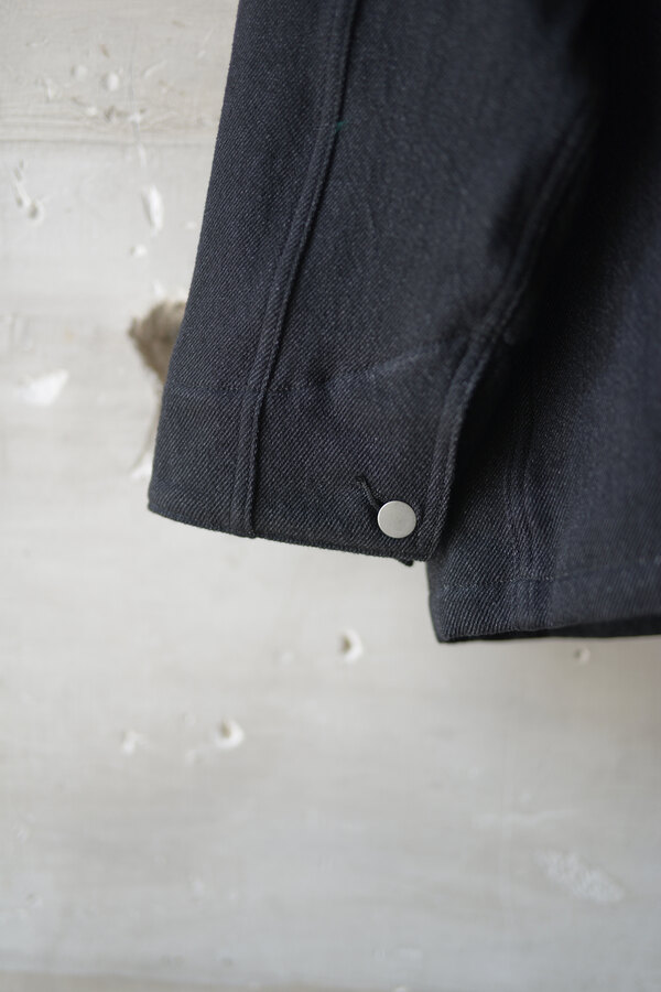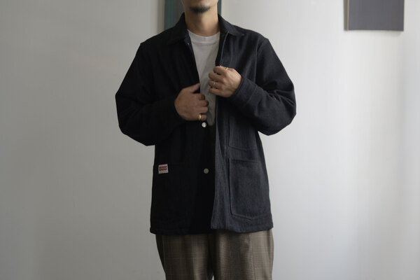 去年バックにハンドペイントを施してあったデザインと同じでペイントのないシンプルなカバーオールです。お客さんが『ペイントの無いものもあったら良いなぁ』と言われていて、実際に展示会に行くとあったのでびっくりしました。甘織のブラックデニム。デニムとは思えないほど柔らかくて初めから体に馴染む感じがします。襟裏は黒いレザーが使われていて、立てても雰囲気が良いです。ライニングはナイロンでとても滑りが良いです。気分を変えたい時、たまには裏っ返して着るのも良いかもしれません。クラシックながら遊びのきいたカバーオールです。