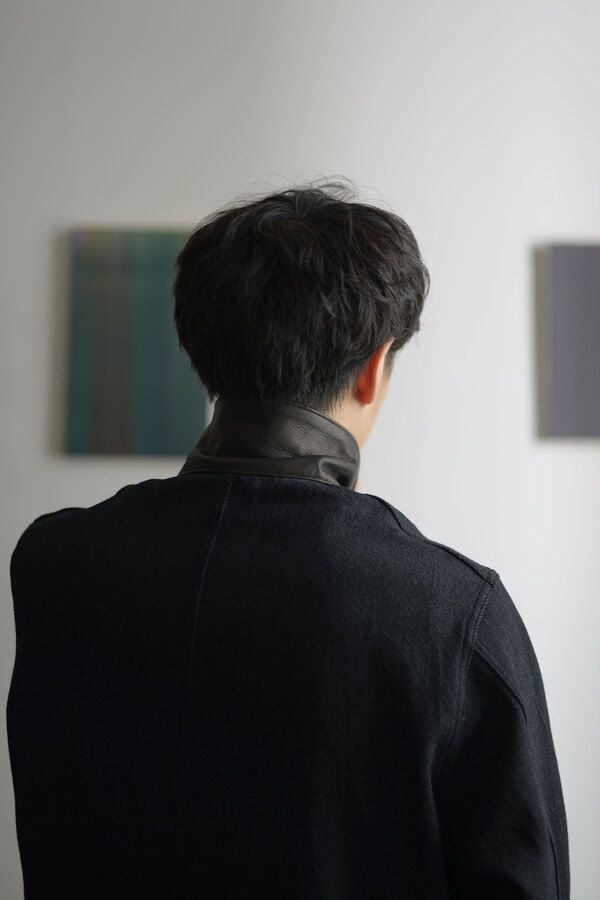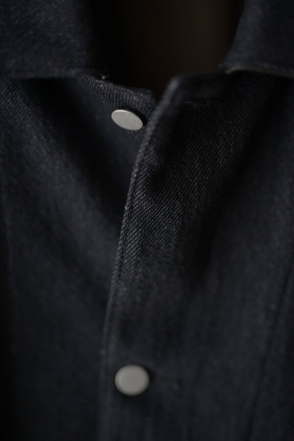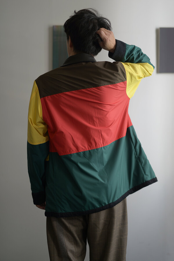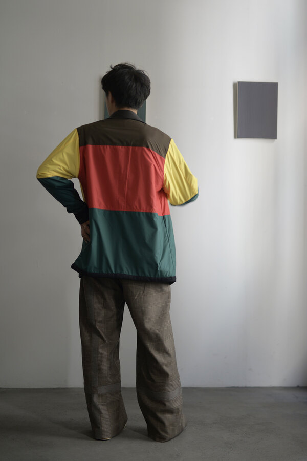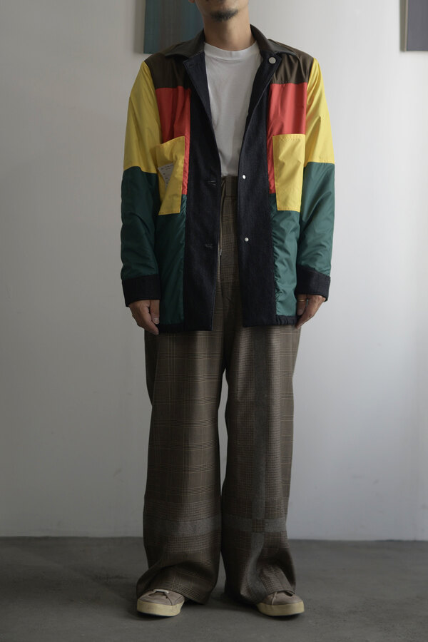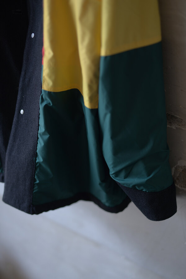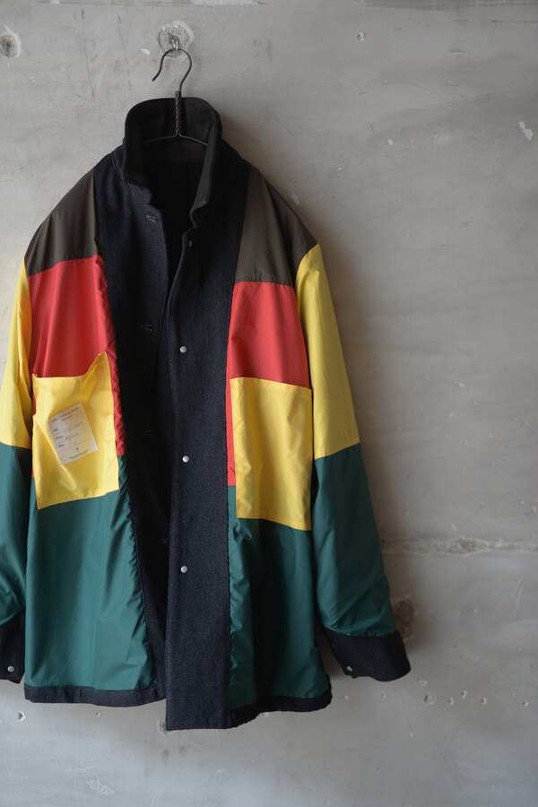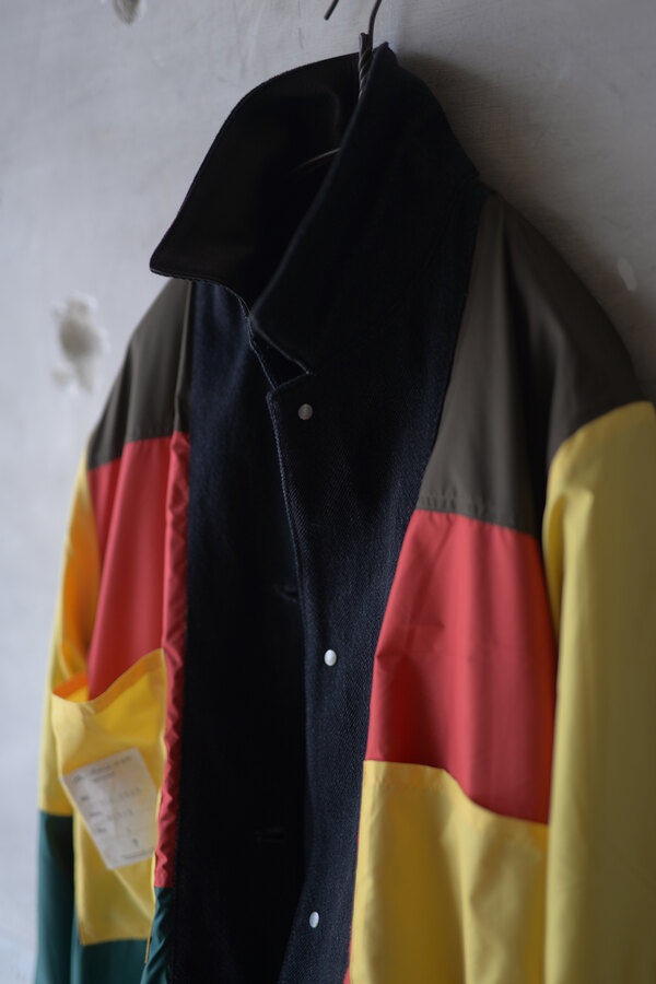 去年バックにハンドペイントを施してあったデザインと同じでペイントのないシンプルなカバーオールです。お客さんが『ペイントの無いものもあったら良いなぁ』と言われていて、実際に展示会に行くとあったのでびっくりしました。甘織のブラックデニム。デニムとは思えないほど柔らかくて初めから体に馴染む感じがします。襟裏は黒いレザーが使われていて、立てても雰囲気が良いです。ライニングはナイロンでとても滑りが良いです。気分を変えたい時、たまには裏っ返して着るのも良いかもしれません。クラシックながら遊びのきいたカバーオールです。