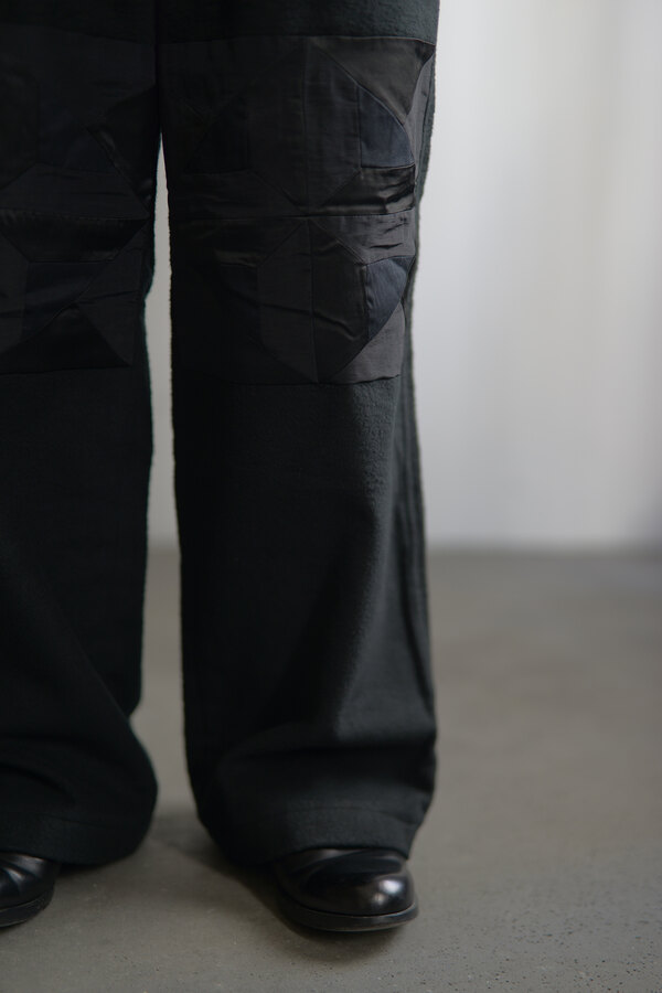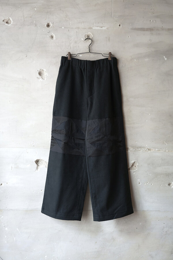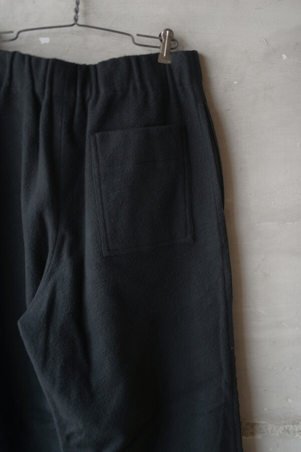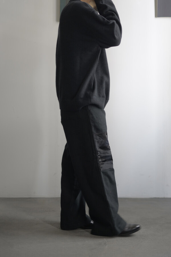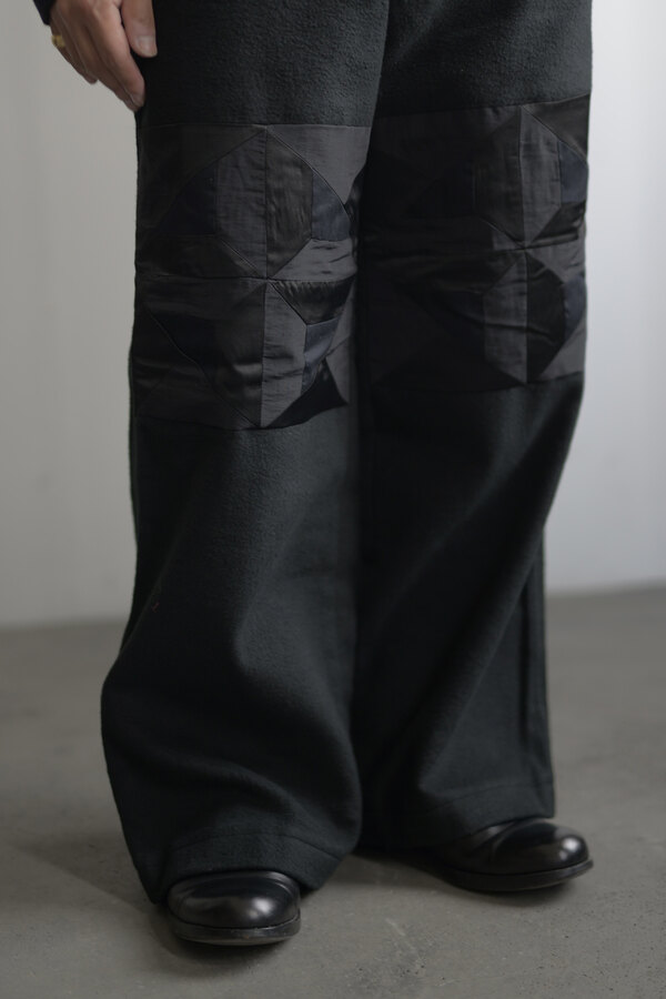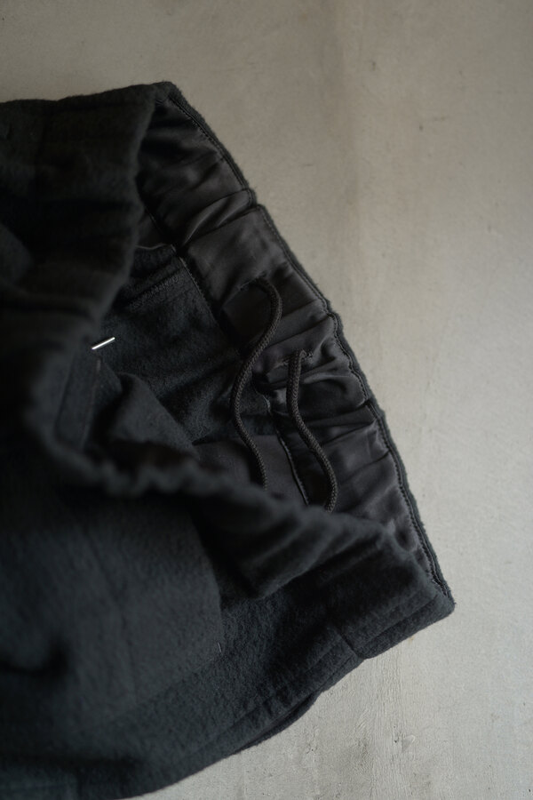 ただただ黒いパンツ、と思いきやパッチワークが施されています。シンプルだけどちょっと遊びがある。その塩梅が心地よく感じるのがスポメニックです。今回のテーマでもある木の床の寄木張りから着想を得た柄をパッチワークしています。パンツ本体の素材はポリエステルではありません。分厚いコットンを両面から起毛させたというその生地はまるでウールのようなぬくもりを感じました。着用すると肌がフリースに包まれる感覚になり、コットンなのにコットンではないような。そんな矛盾が妙に心地よく感じます。ストンと落ちるシルエット、穿き心地はまるでスウェットパンツです。