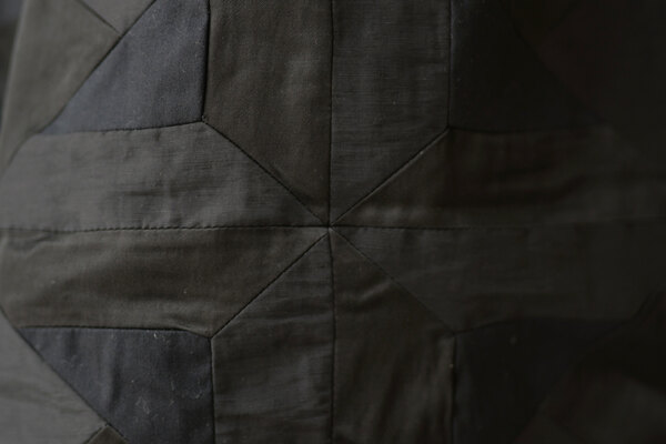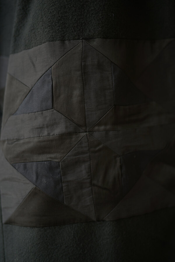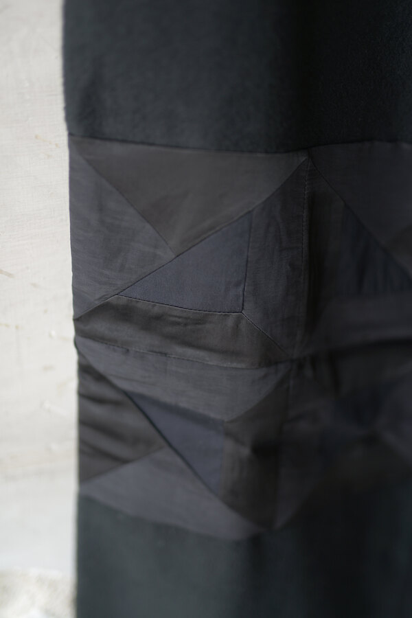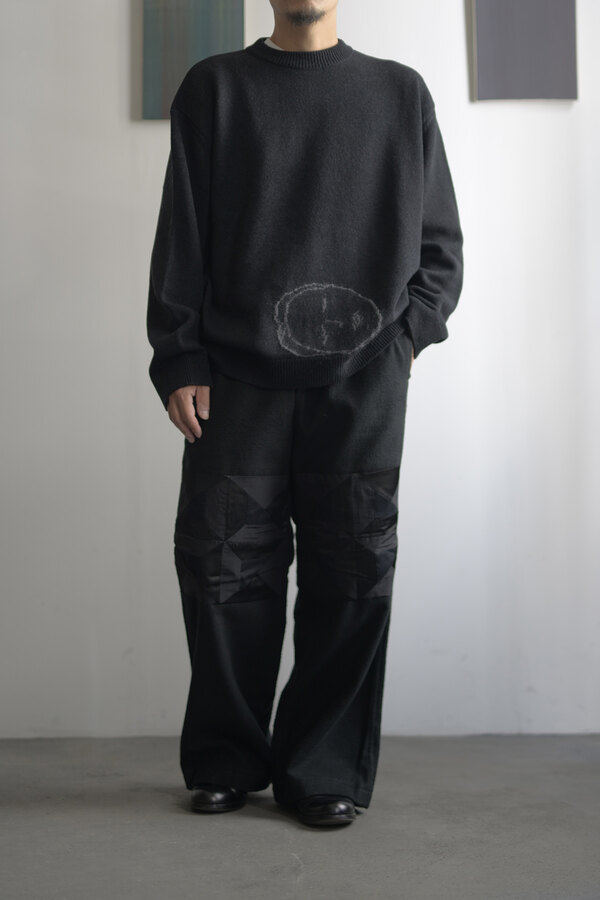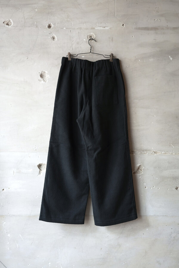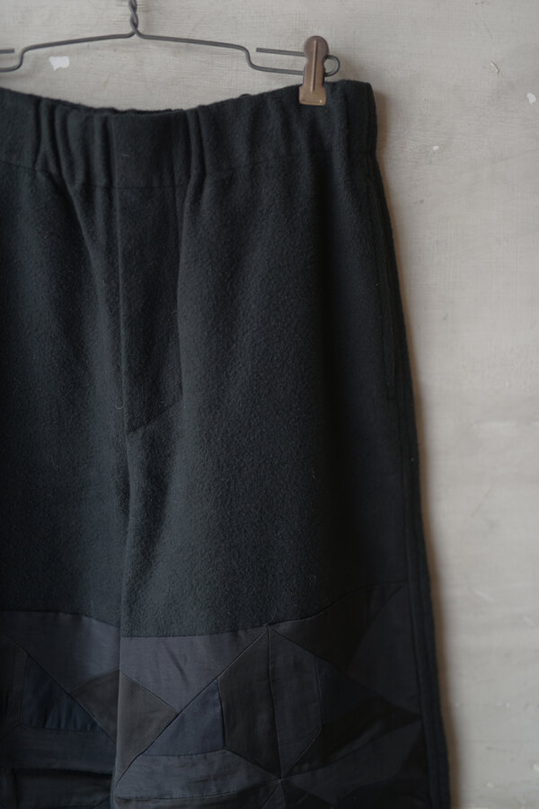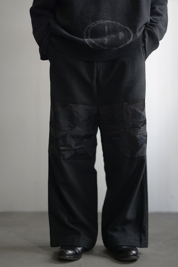 ただただ黒いパンツ、と思いきやパッチワークが施されています。シンプルだけどちょっと遊びがある。その塩梅が心地よく感じるのがスポメニックです。今回のテーマでもある木の床の寄木張りから着想を得た柄をパッチワークしています。パンツ本体の素材はポリエステルではありません。分厚いコットンを両面から起毛させたというその生地はまるでウールのようなぬくもりを感じました。着用すると肌がフリースに包まれる感覚になり、コットンなのにコットンではないような。そんな矛盾が妙に心地よく感じます。ストンと落ちるシルエット、穿き心地はまるでスウェットパンツです。