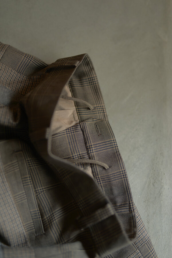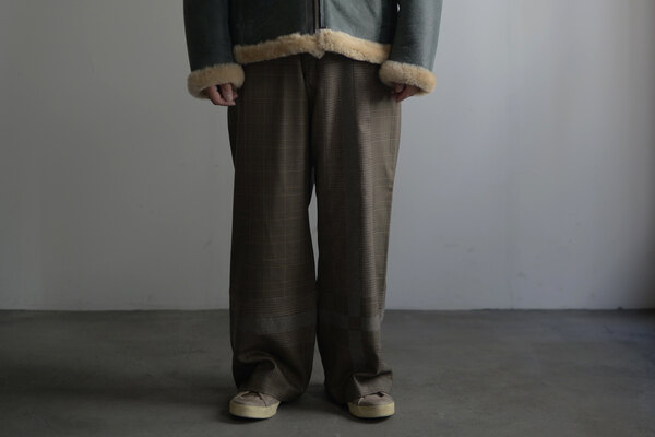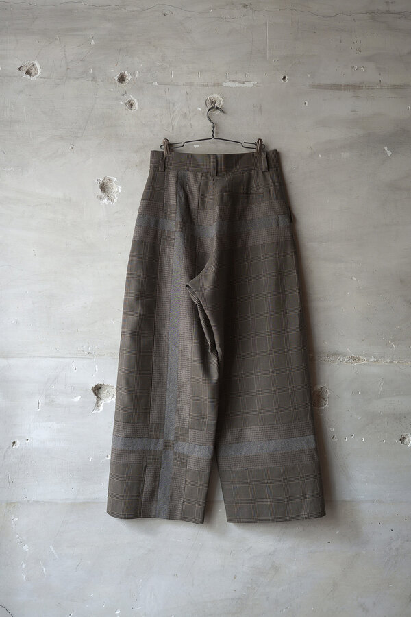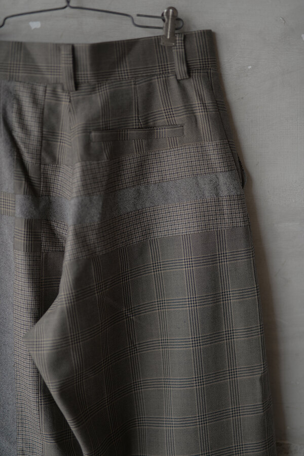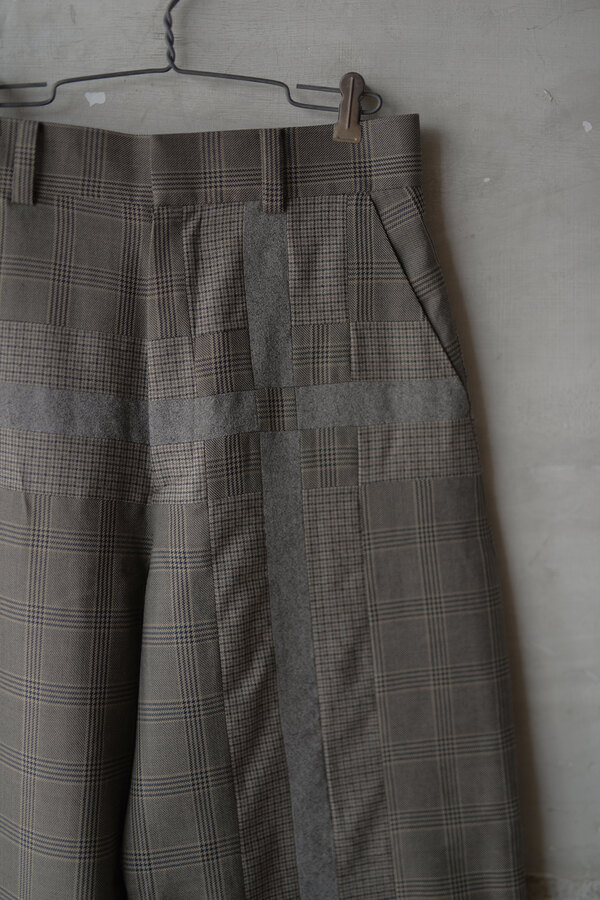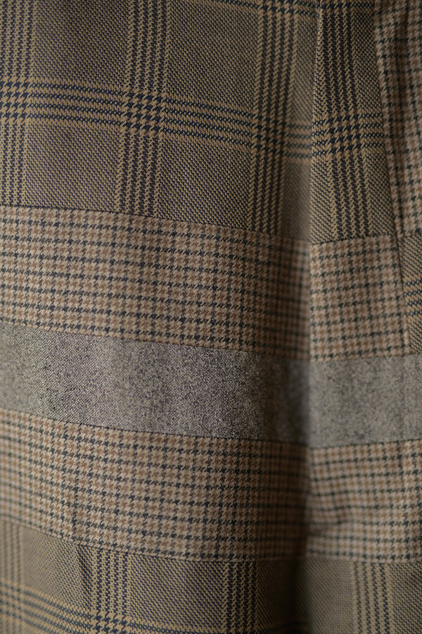 一見シンプルなスラックスに見えました。ドレープが効きそうな柔らかい生地でその雰囲気に先ず惹かれました。よく見ると近い色調の異素材が使われていてチェックが重なっているように見えました。初めにオリジナルのチェック柄を作り、パンツの大きさいっぱいに拡大します。そして異素材を使い前後にチェックを施したそうです。小さなチェックと大きなチェックが視覚的に交差し、調和の取れたスラックスです。総パーツ数98という想像できない工程を経て完成しました。
