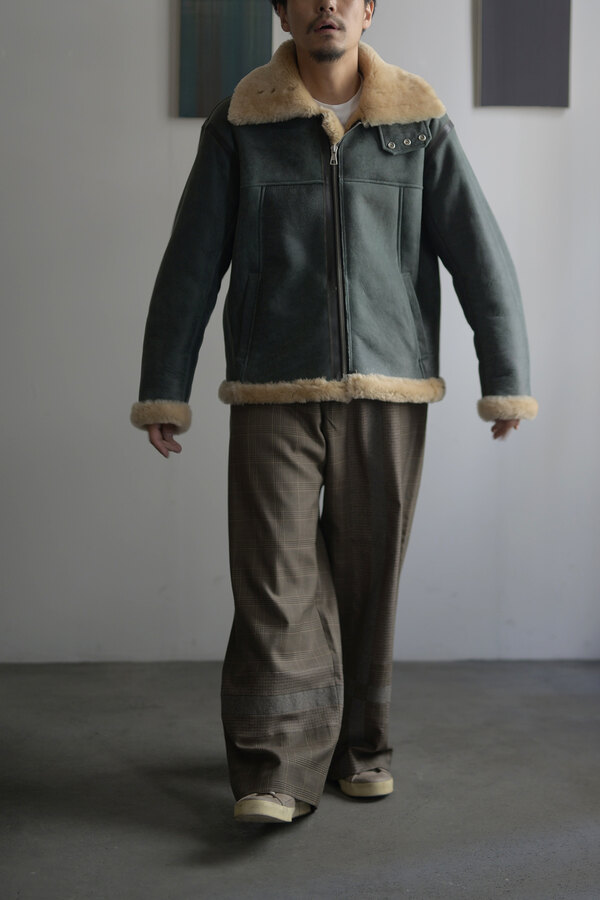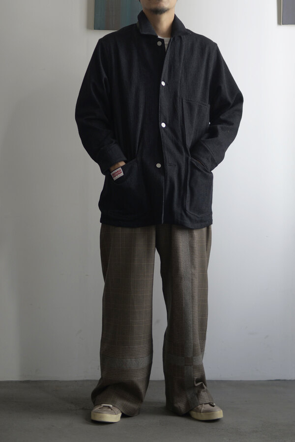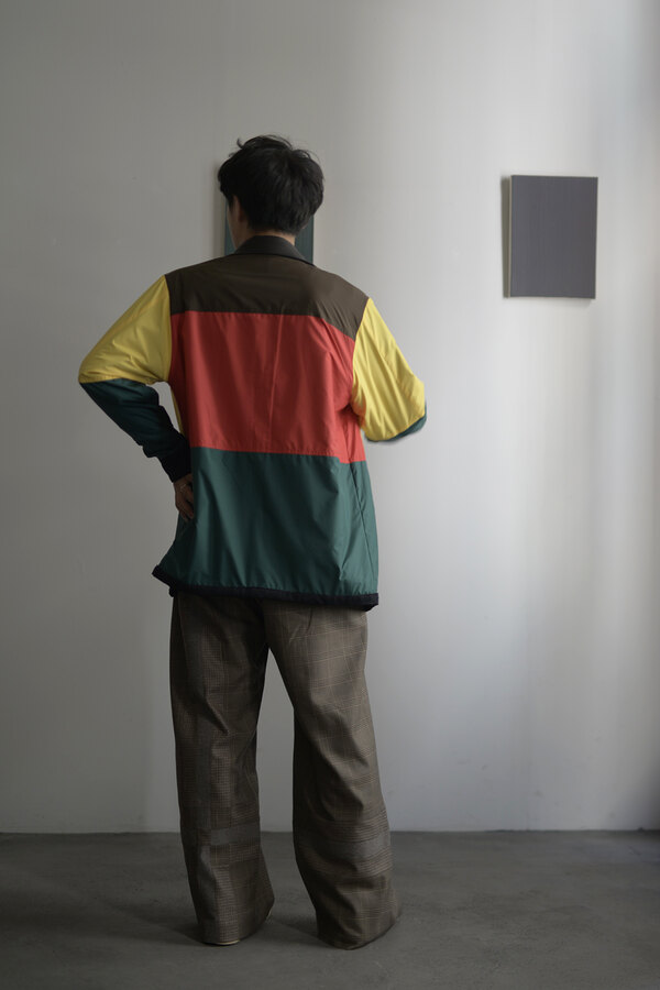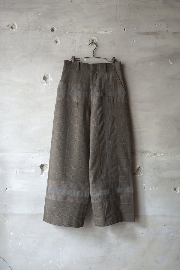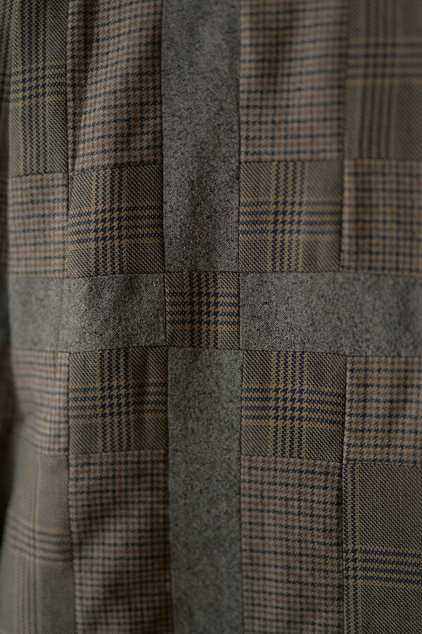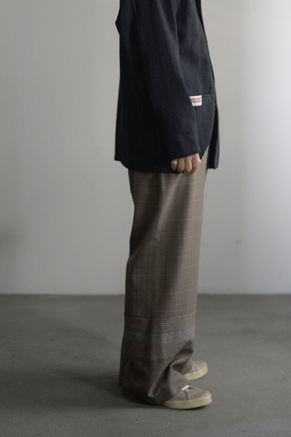一見シンプルなスラックスに見えました。ドレープが効きそうな柔らかい生地でその雰囲気に先ず惹かれました。よく見ると近い色調の異素材が使われていてチェックが重なっているように見えました。初めにオリジナルのチェック柄を作り、パンツの大きさいっぱいに拡大します。そして異素材を使い前後にチェックを施したそうです。小さなチェックと大きなチェックが視覚的に交差し、調和の取れたスラックスです。総パーツ数98という想像できない工程を経て完成しました。
