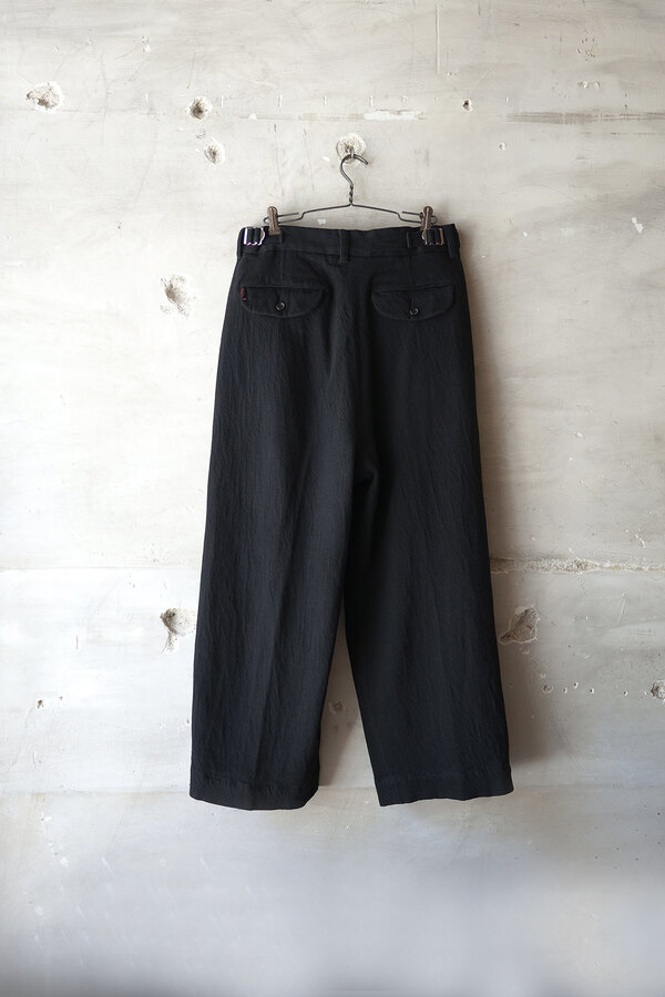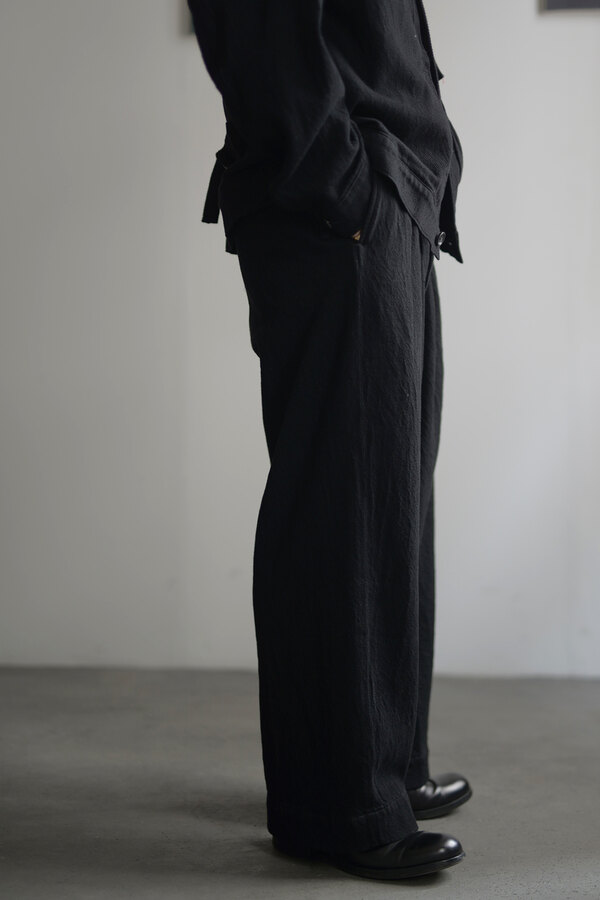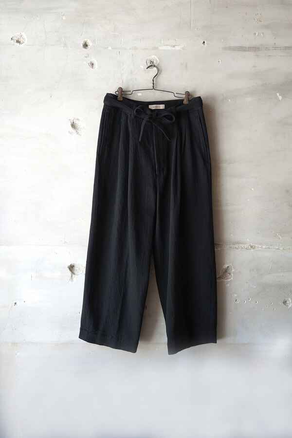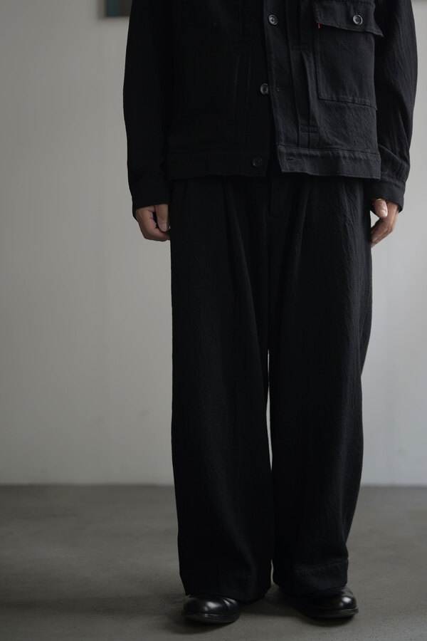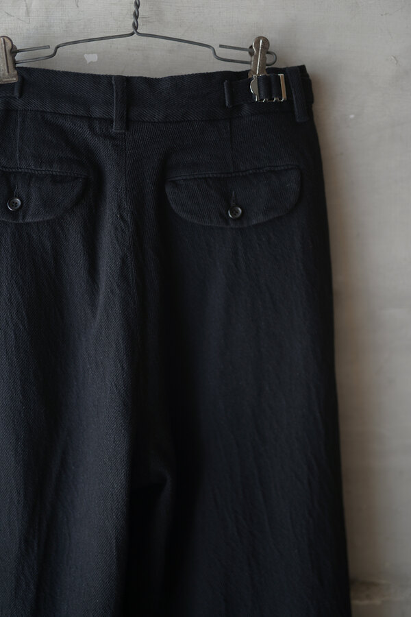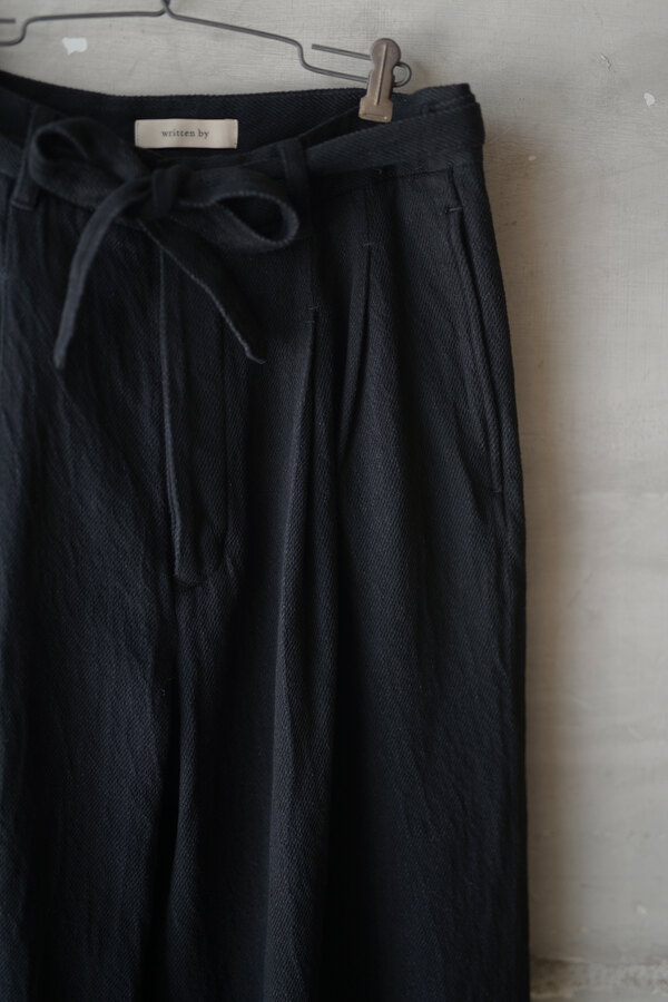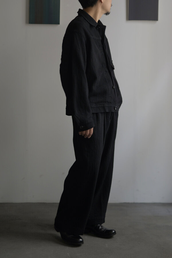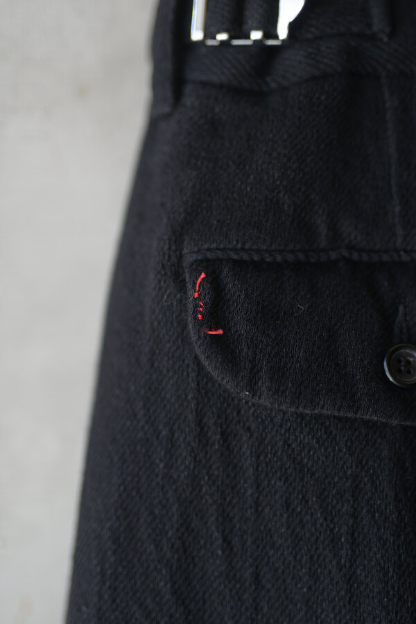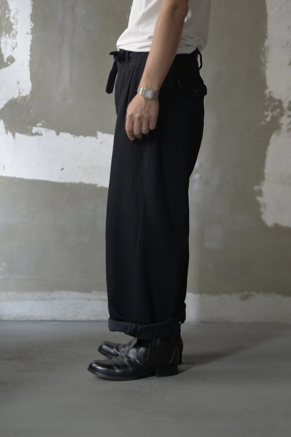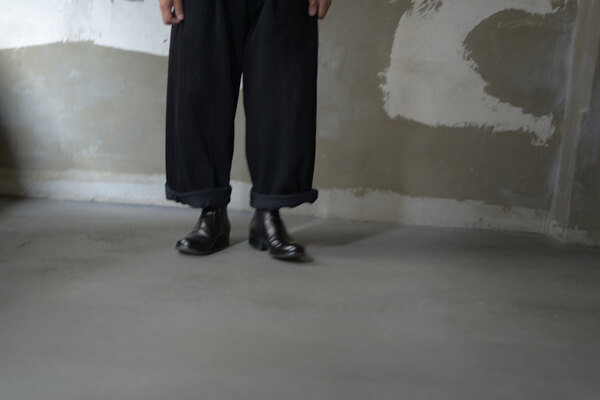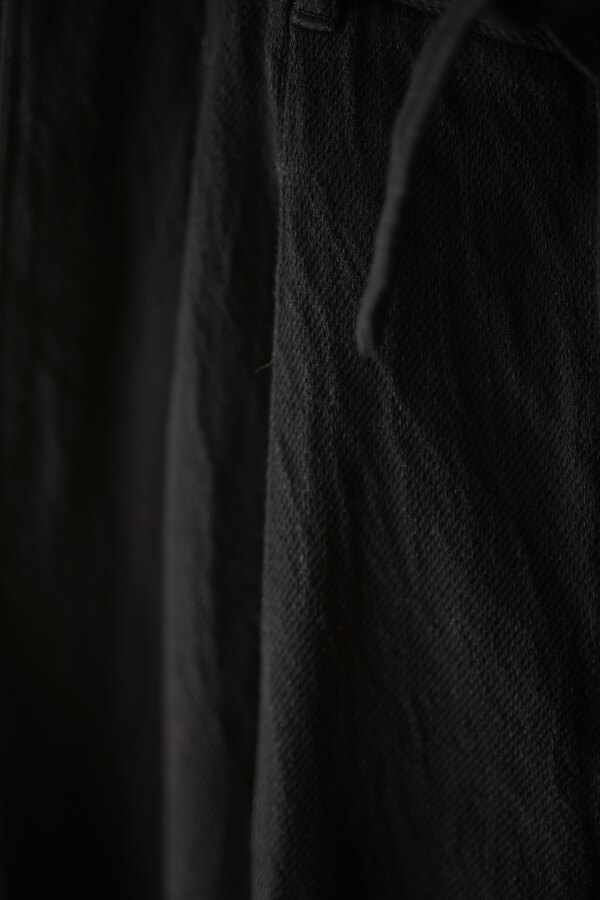 甘く織られた太綾のデニム、デニムとは思い浮かべる表情とは全く異なります。柔らかく、空気を孕むような膨らみがあり、体を優しく包み込んでくれます。全く頑張らなくて良いデニムパンツです。ウエストは大きめに作られていて、左右のベルトと紐で調整が出来ます。シャツやカットソーをインしたり出したり、少し食べ過ぎてしまった時などウエストが調整できるのは有り難いです。ワンタックでストンと落ちるキレイなワイドシルエット。ジャケットと同様にドローイングをイメージしたハンドステッチが施されています。