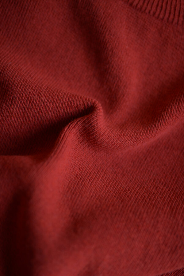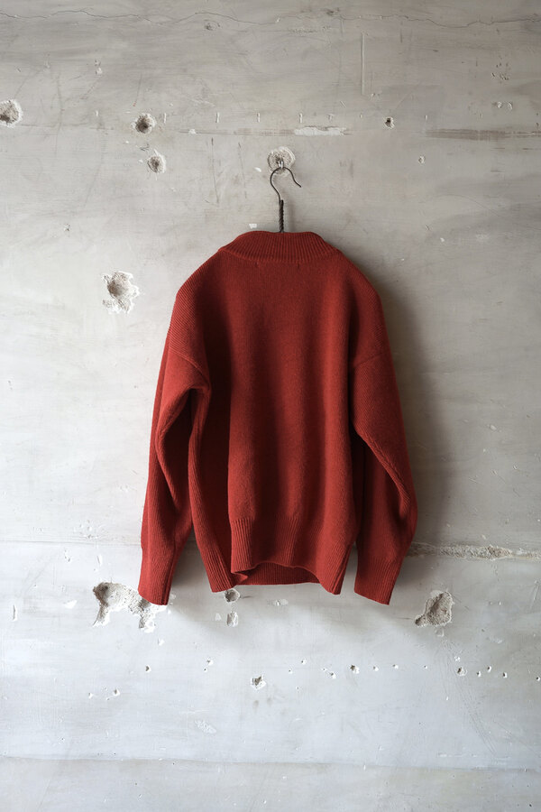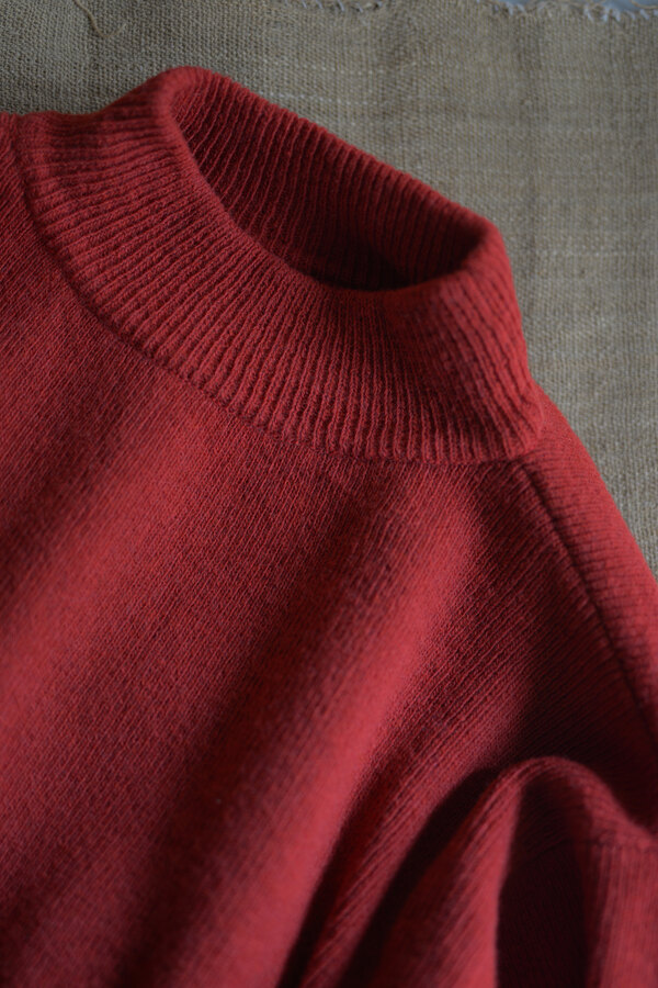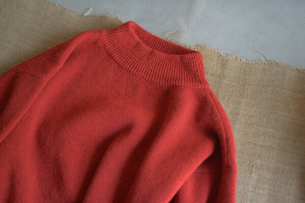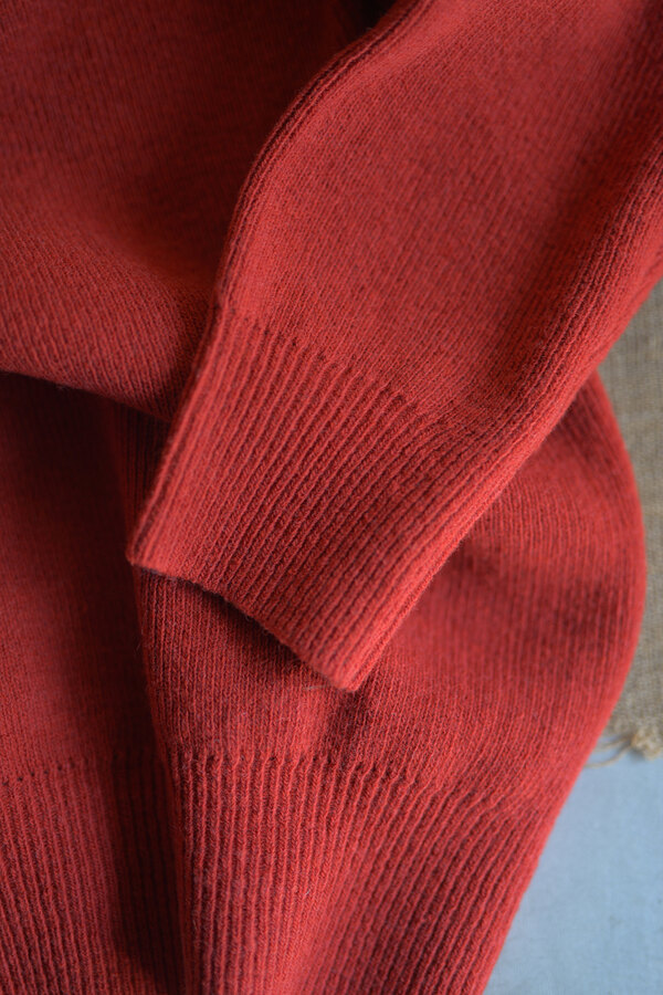 シェットランドウールと聞くと暖かいと想像します。防寒性がありしっかりしているイメージです。毛がしっかりしているからこそ、チクチクするのは避けられません。しかし、このシェットランドウールは思っているチクチクがありませんでした。あえて強く撚りをかける事でドライタッチにして、チクチクの原因となる差し毛を少なくしているそうです。元々丈夫な糸がさらに丈夫になって、肌あたりが良くなる。素材の特性を活かしながら異なる側面を生み出す。ただただ凄いなと感じました。デザインはアメリカ海軍のGOBセーター、この落ち着いた赤が目に止まりました。