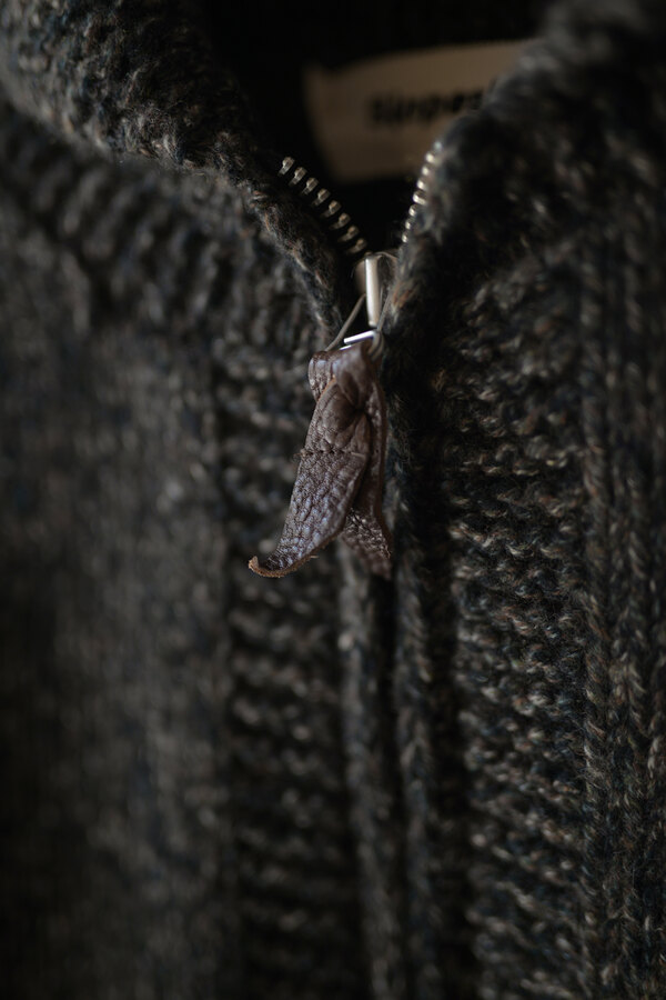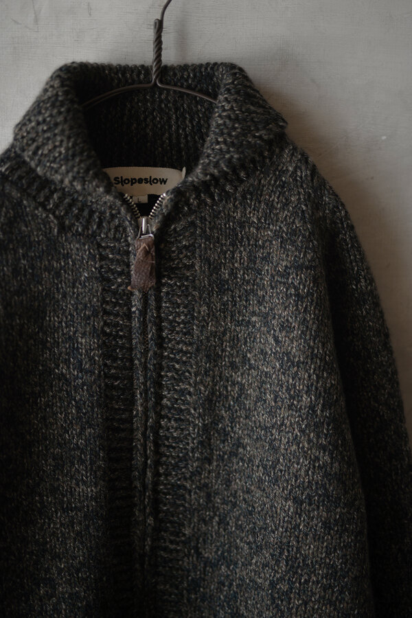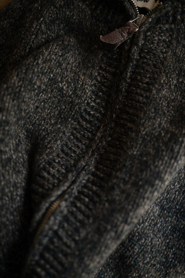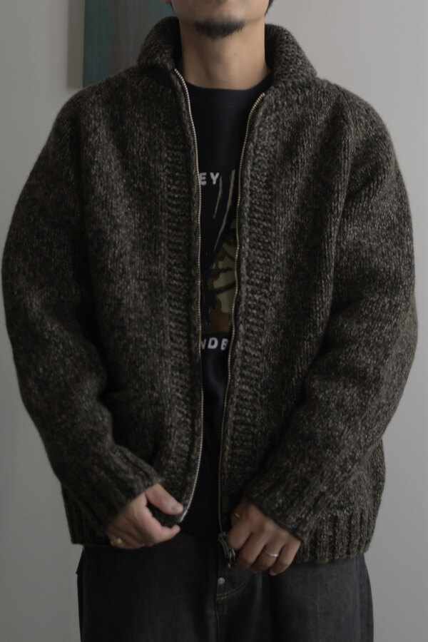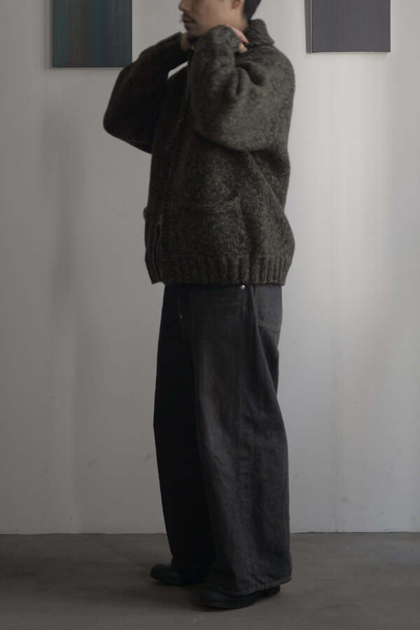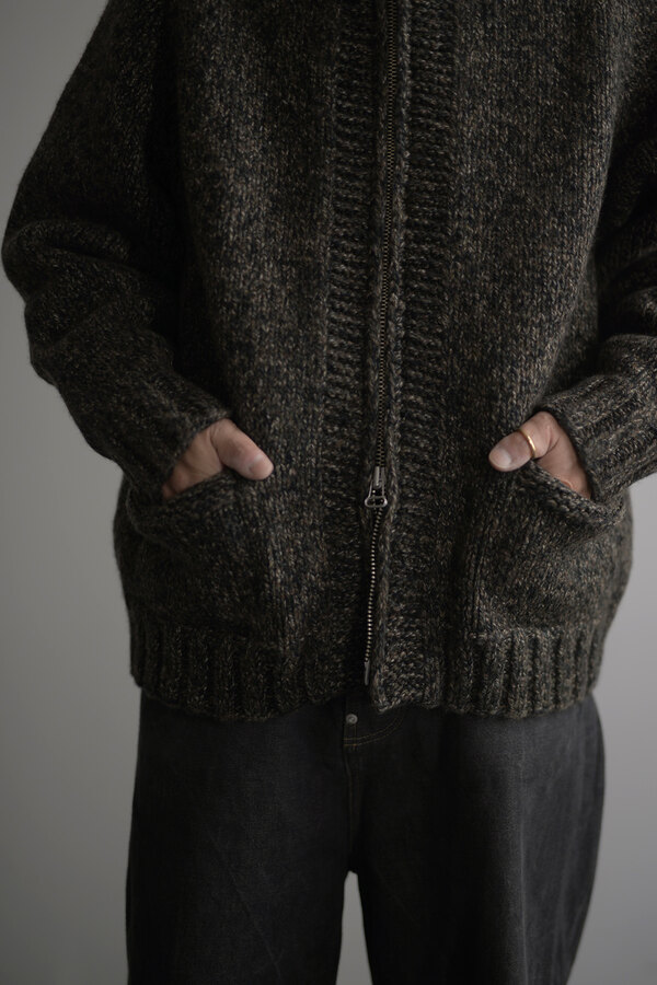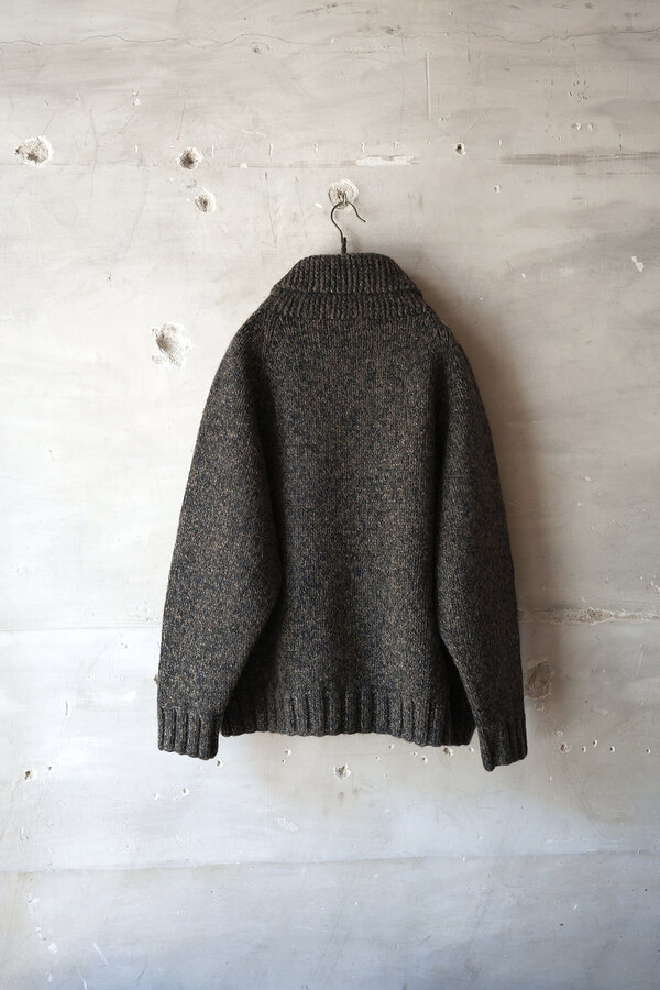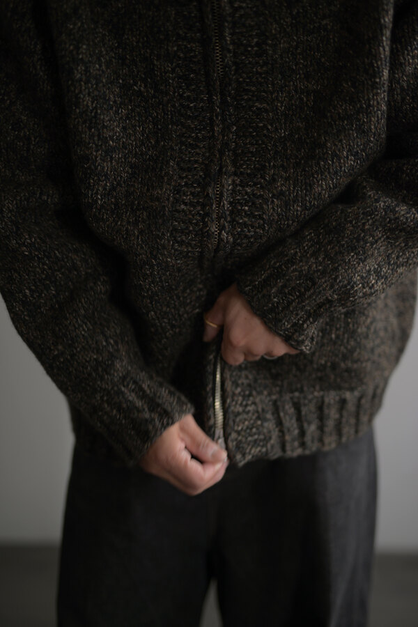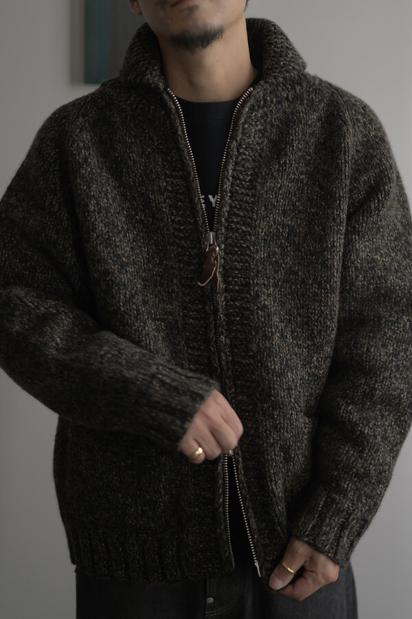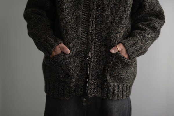 様々な色の糸が複雑に絡まり合うことで生まれる色。まるで絵の具みたいだなぁと思います。ヤク12本、ラムウール24本。それを掛け合わせ、限界まで目を詰めて、手編みで作られています。ずっしり、がっちり。肌触りはまるでカシミアです。こんな作り方なので、暖かいのはもちろん、自重で垂れずにメルトン並みの保形力があるそうです。だから着用してもその重さを感じないのです。レザーのように、とても着込み甲斐があります。毎年、冬が楽しみになりそうです。