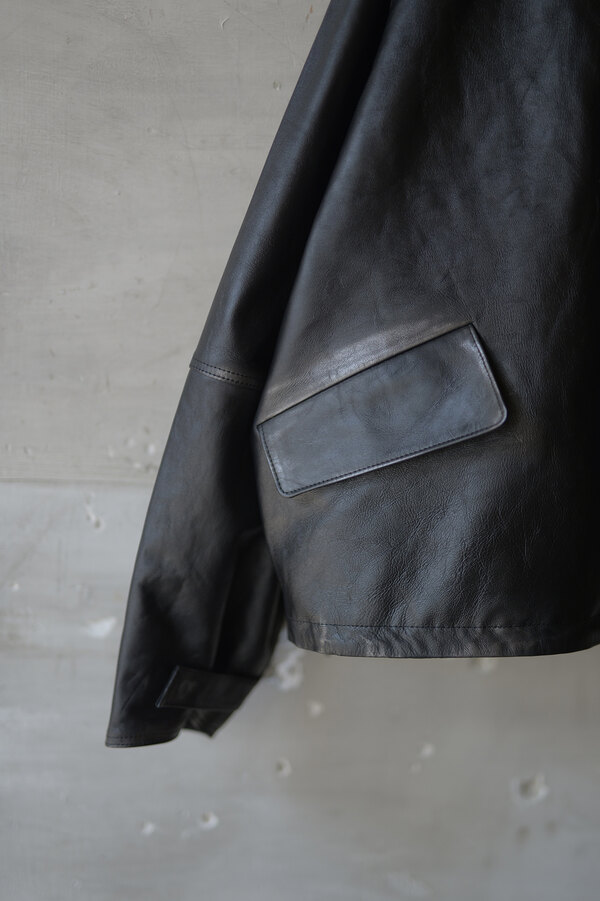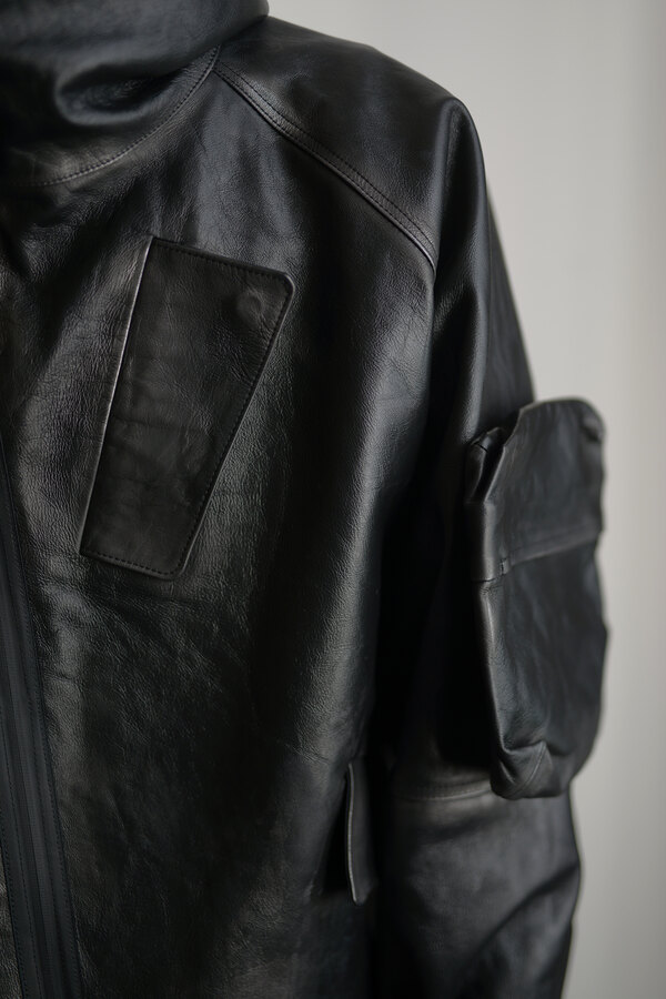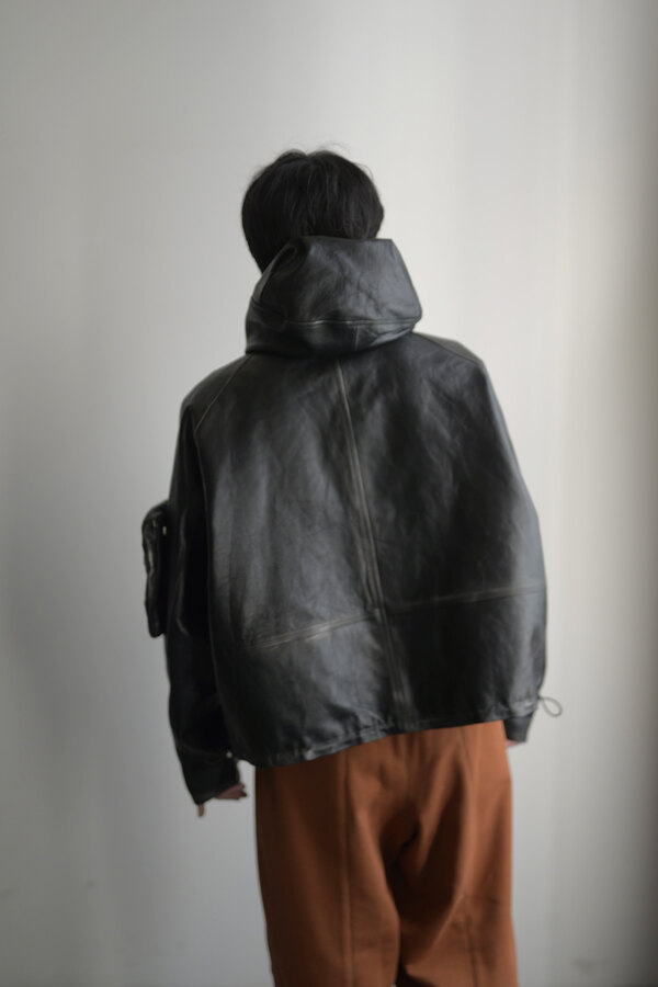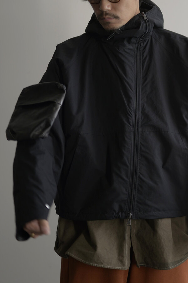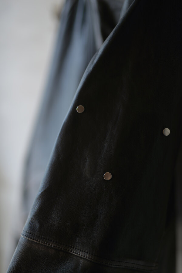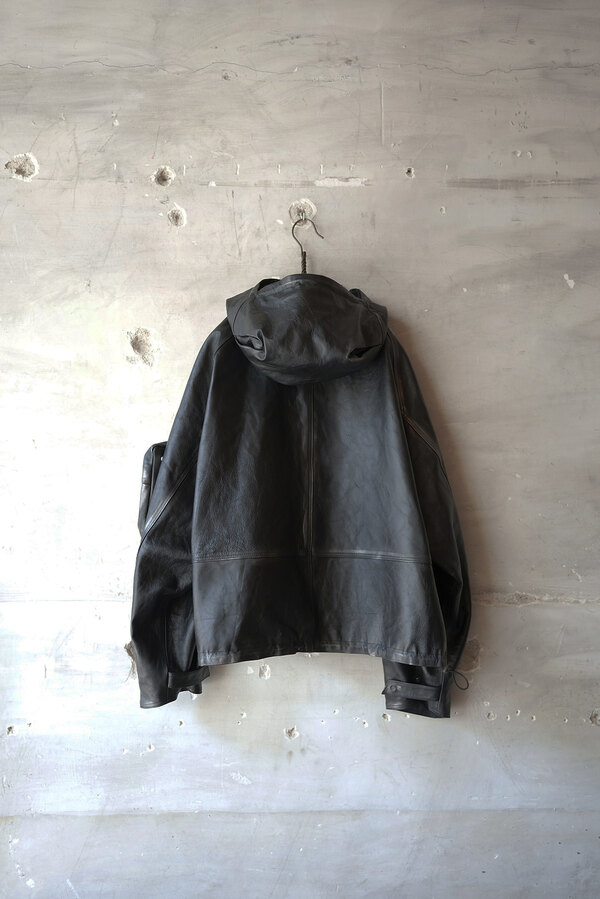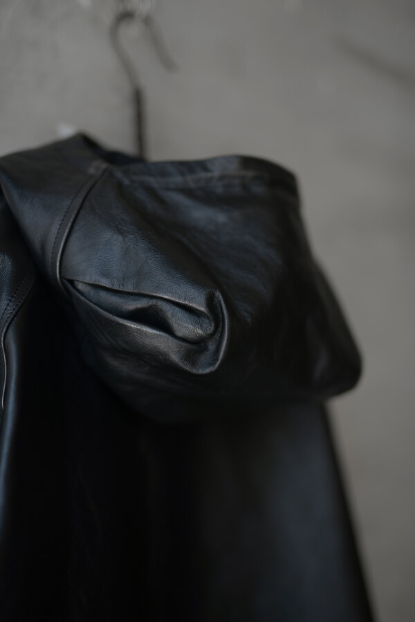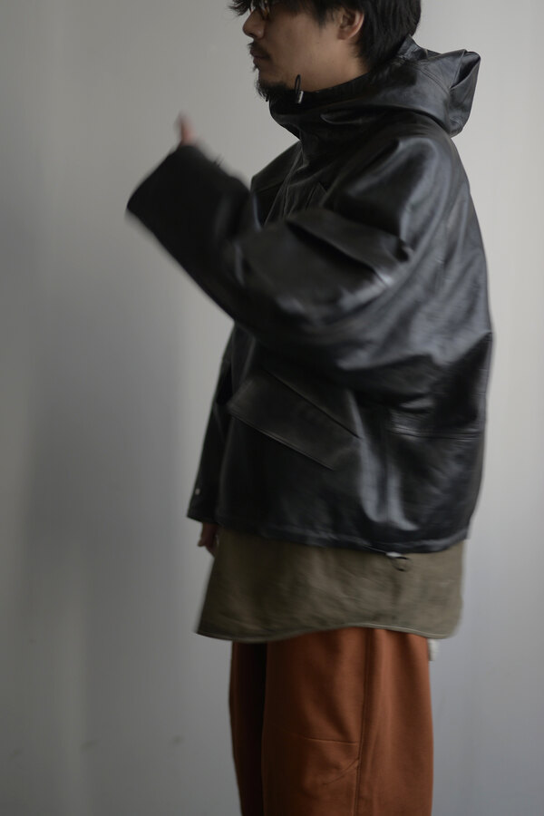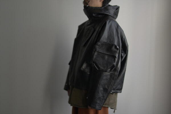 洋服を選ぶ際に、意外な面があるとそこに引っ掛かり抜け出せなくなることがあります。覚悟を決めて向き合うとさっきまで見えなかったところが見えてくる。どんどんその洋服が気になっていきます。daisuke tanabeの今回のレザーはトスカーナで開発したゴートレザーで作られたマウンテンパーカ。シルバーで染色した表面に黒い顔料を重ねています。着用を繰り返すと少しずつシルバーが浮かび上がってくる。そんな経年変化が面白いと思いました。裏はライトウェイトのベンタイルコットン。なんとリバーシブルなので、急な雨もひっくり返せば安心です。レザーとベンタイル、異なる二面性を楽しめるパーカです。