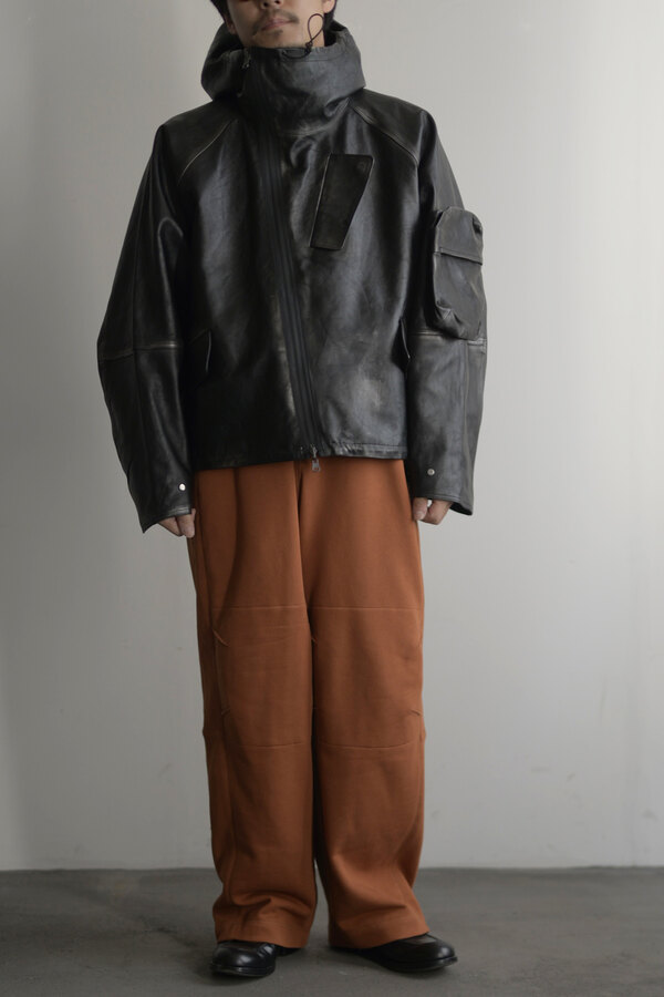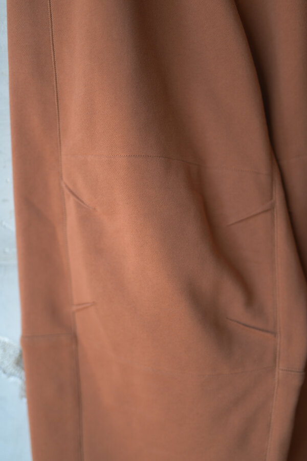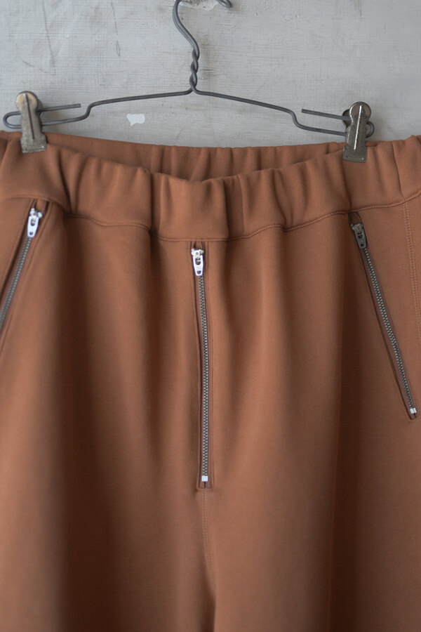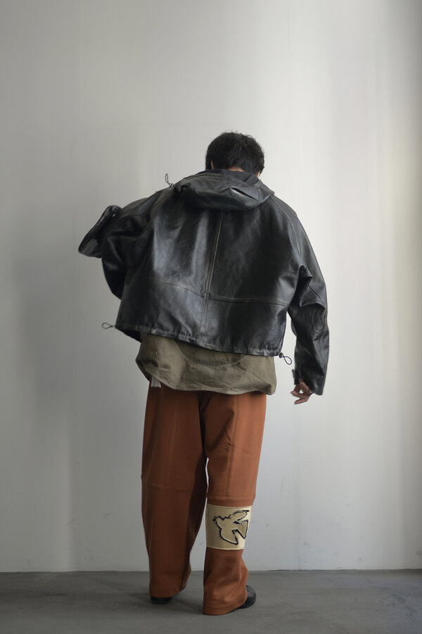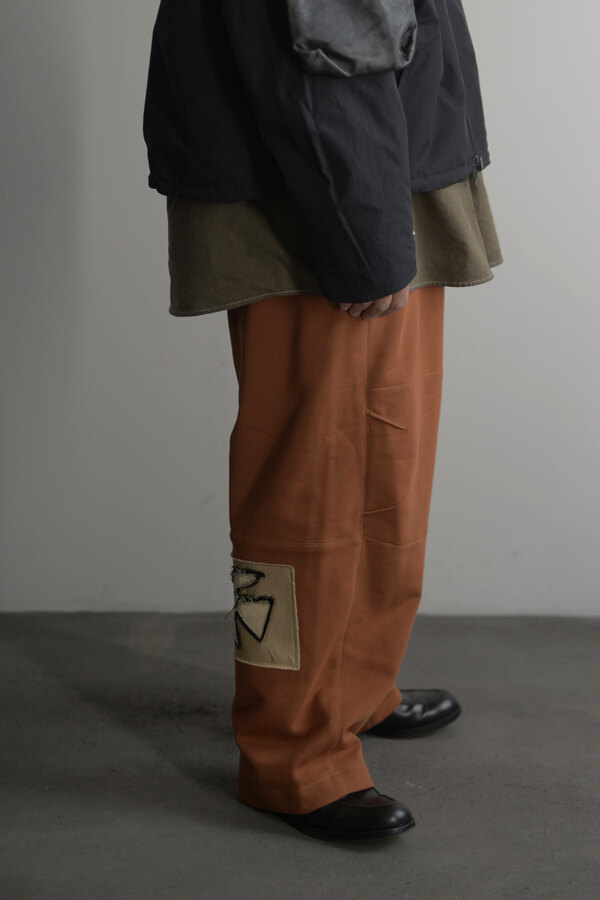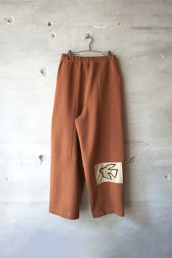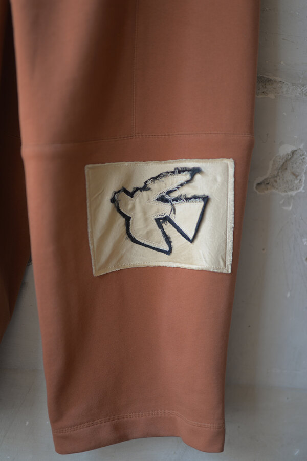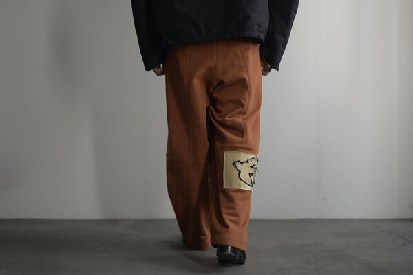 今回はベトナムでデザイナーが気になったモチーフ(風や鳥、ワッペン、バイク)が散りばめられています。このスウェットパンツには跨った時、物が落ちないようにポケットにジップが付いています。膝裏には当て布を。別にバイクに乗らなくても良いけど、そんなモチーフがデザインとして活きている。そう感じました。程よい厚みの裏毛、とても穿き心地が良く、当たり前ですが動きやすいです。後ろ姿が気に入りました。金の鳥が飛んでいます。