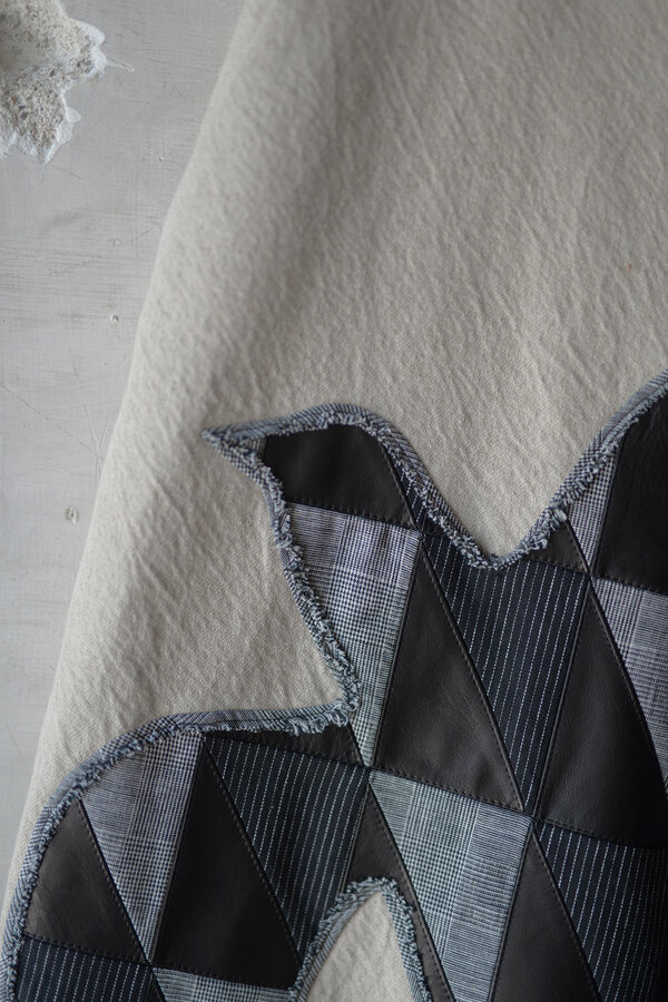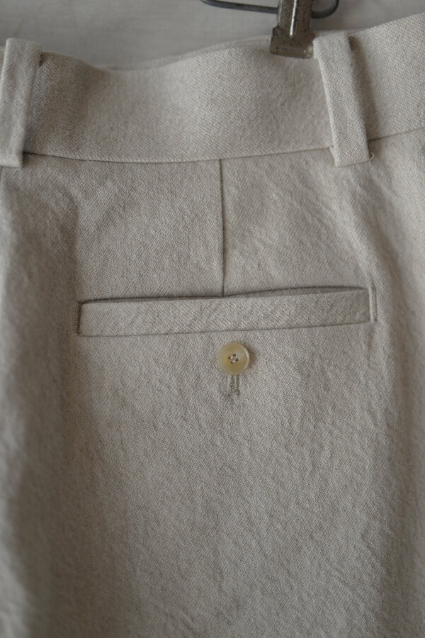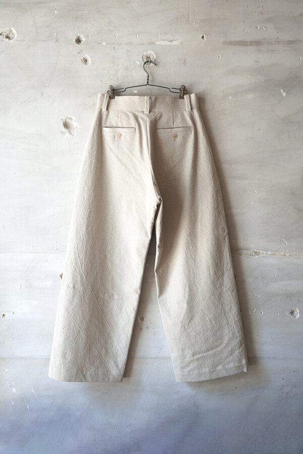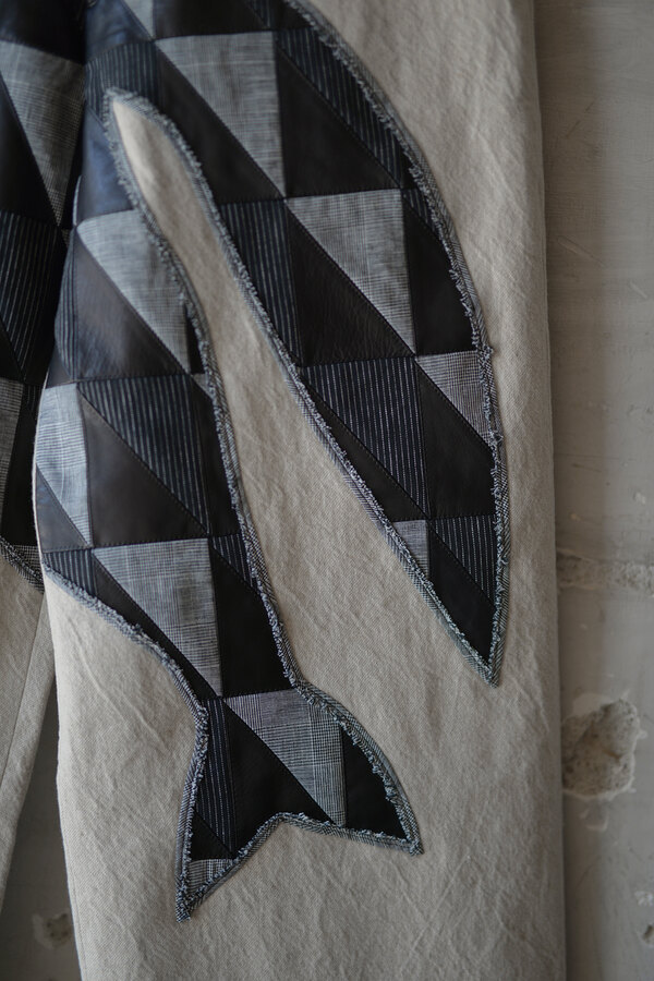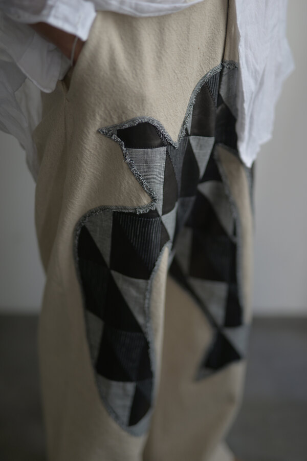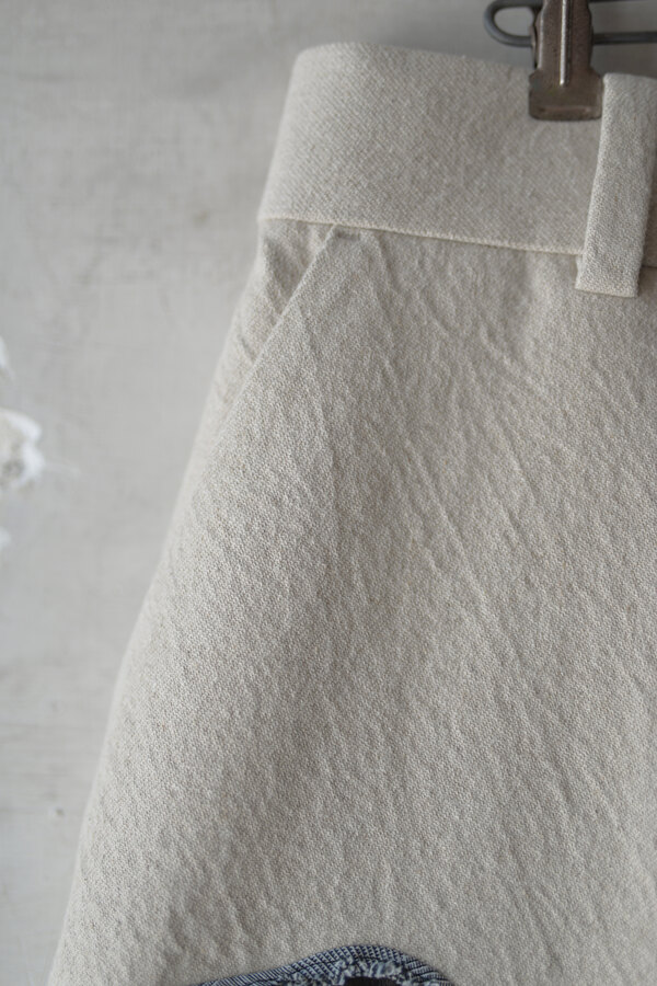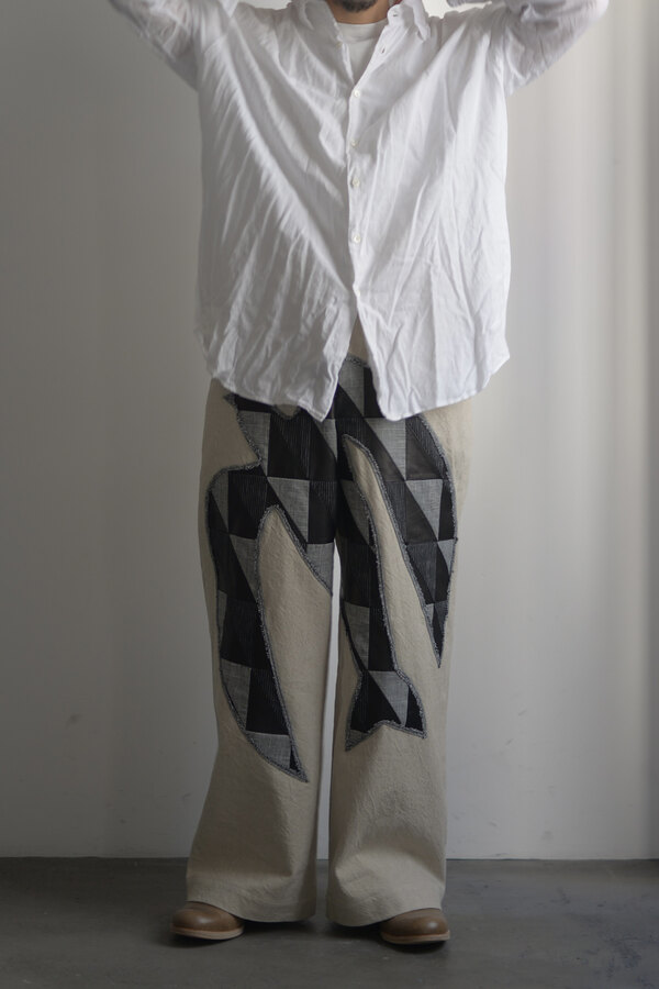 ど真ん中に羽ばたく鳥がいます。パンツという限られた場所に目一杯。カウレザー、ストライプやチェックで表現した鳥。ドローコードもレザーです。体が入ると不思議でした。妙に馴染むというか、この不自然な感じが心地よく思うのです。それは本体の生地が良さも要因かもしれません。コットンリネンでどこか使い古されたような雰囲気。粗野。ヴィンテージ。それは特殊な染料を使っているからだそうです。アトリエで時間を掛けて作られています。
