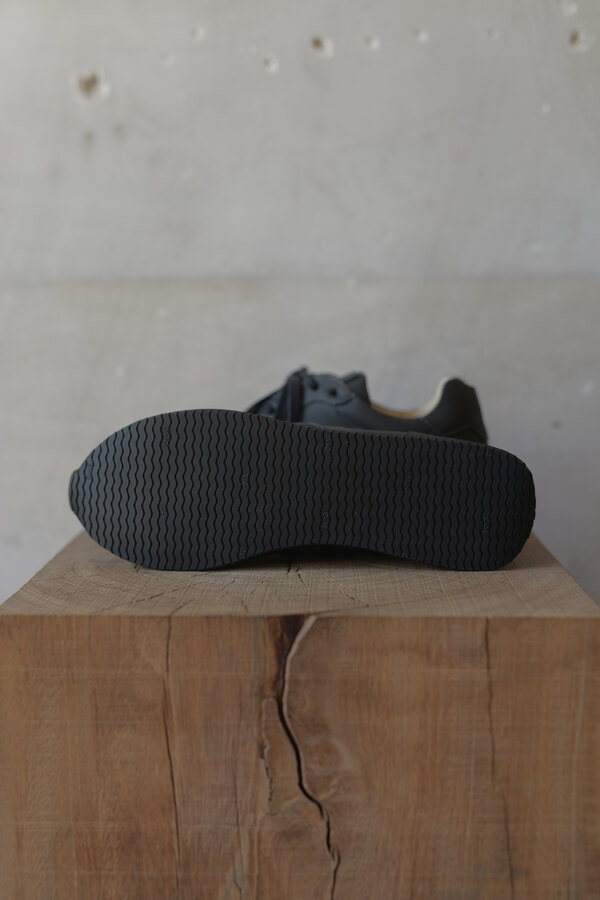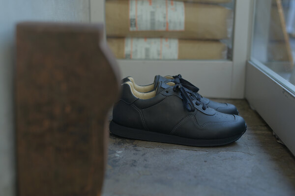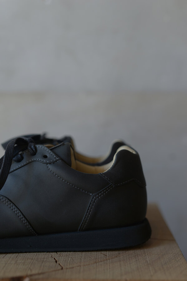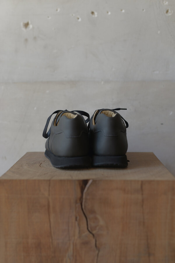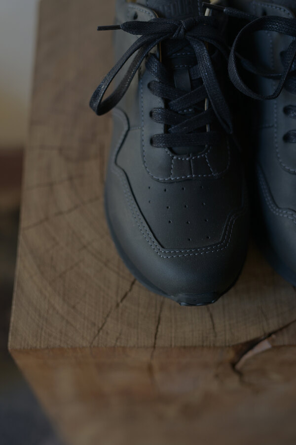 サンクトペテルブルクの工房にて手作りされているAFOURの革靴のようなスニーカー。特殊なマット加工を施した経年変化を楽しめるオイルドヌバックレザー。ライニングにはベジタブルタンニン鞣しのレザーを使っていて、優しく、しっかりと包まれる様な履き心地。ソールが固めなので長時間歩いても疲れにくく、どこまでも歩きたくなる様な、そんな気分にさせてくれます。防水加工も施されているので、雨の日も安心です。ふと足元を見た時に革靴を穿いているかのような、心の躍る感覚があり道具としての用途だけではなく高揚した気分を味わえる素晴らしい靴だと感じています。限りなく黒に近いチャコール。日光に当たると違いがわかります。