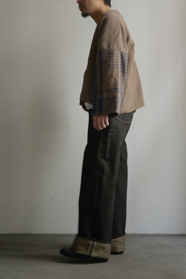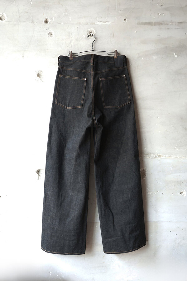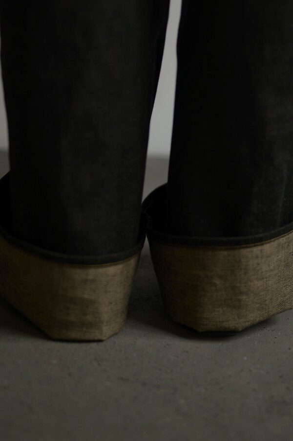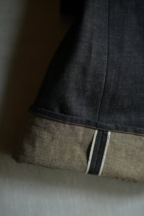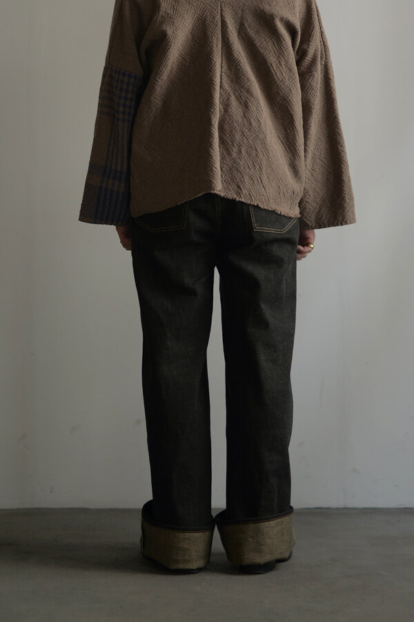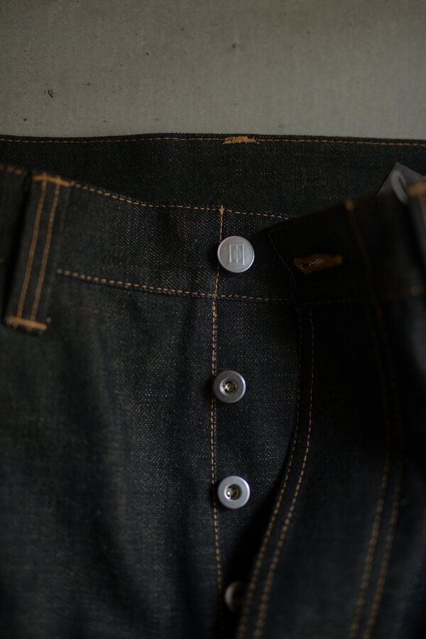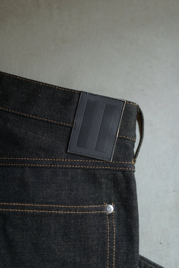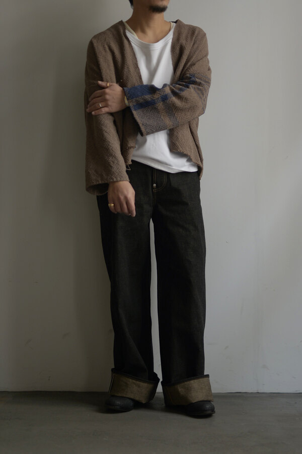 ここ2年は本当によく穿いています。デニム以上の満足感が得られています。茶色く見える理由は、経糸には硫化染めの黒糸、緯糸には茶綿を使用しているからとのこと。だから「真っ黒」ではなく、どこか温かみを感じる深みのある黒だったのかと納得。しかも、この黒×茶綿のデニムは旧式のシャトル織機でゆっくり丁寧に織り上げられたセルヴィッチ生地。ボタンは無垢の鉄、リベットにはアルミを使用。経年変化が楽しみな素材選びにもこだわりを感じます。穿いてみると、腰回りはダボつかず、むしろスッキリとフィット。想像していたよりもずっと洗練されたシルエットです。今までのデニムとはちょっと違う、新しい感覚です。