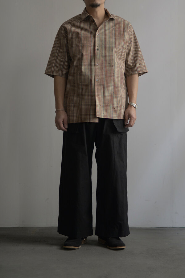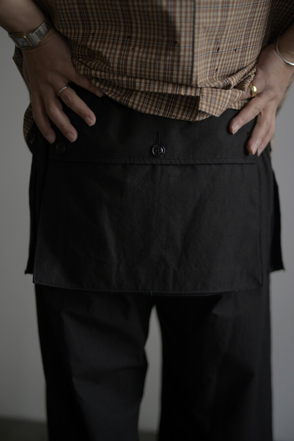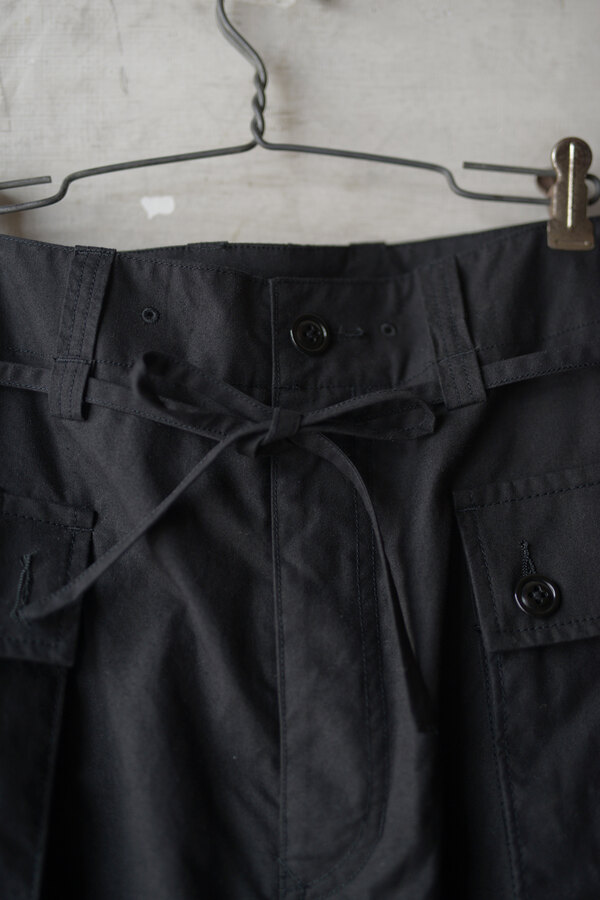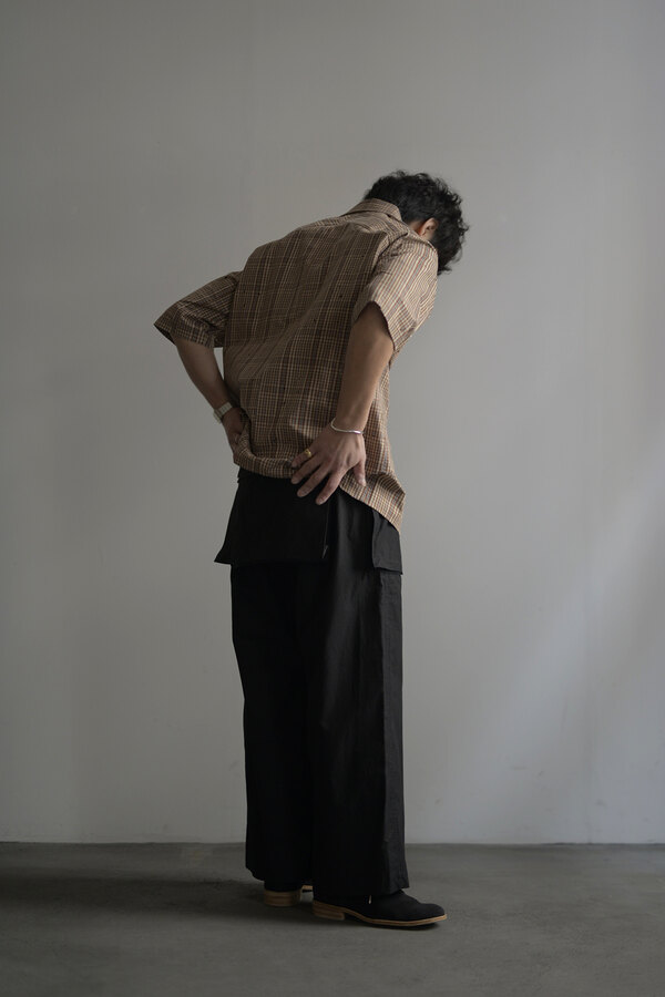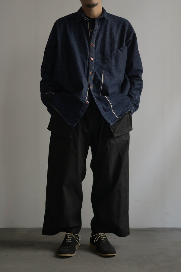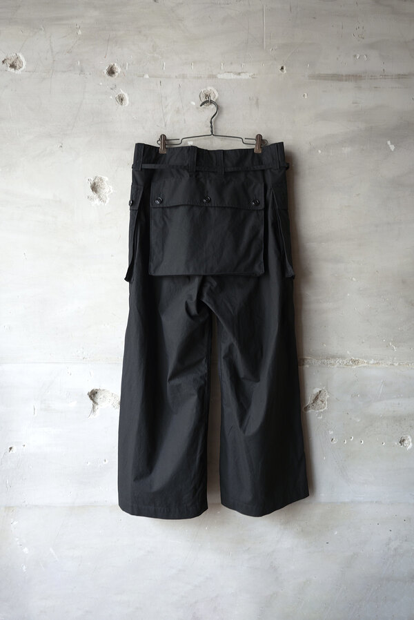 本を収納、持ち運ぶためのパンツ。今回のwritten byはポケットがテーマです。展示会にお伺いした際、洋服を手に持つとなんだか重いなと思っていたら全てのポケットに本が入っていました。本を読むことは好きです。いつも鞄に入っています。電車に乗って、座れたら座って、鞄を開けて本を取り出して読む。しかし、この動作が少し億劫な日もあります。ポケットに本が入れば、もっと気軽に本が読めるのでは?とコレクションを見て感じました。アメリカ軍の通称モンキーパンツから着想を得た新型。超高密度の馬布が使われています。ハリがあってドライな肌触り。ワイドシルエットなので、夏場も快適に過ごせます。手を入れるスラッシュポケットを付けるため?に少し前めに付いた両サイドのポケットは文庫本やハード本も収まります。もちろん漫画もです。大きなバックポケットは固定せずに独立した状態で縫われているので、特有のごわっとしたシルエットにはなりません。本を読むという事は、想像する力が高まり、思考するクセがつくような気がします。このパンツを穿いて、本をもっと身近に感じてもらえたらと思いました。