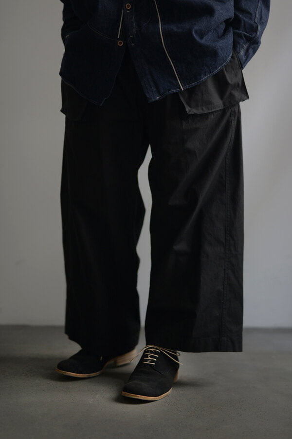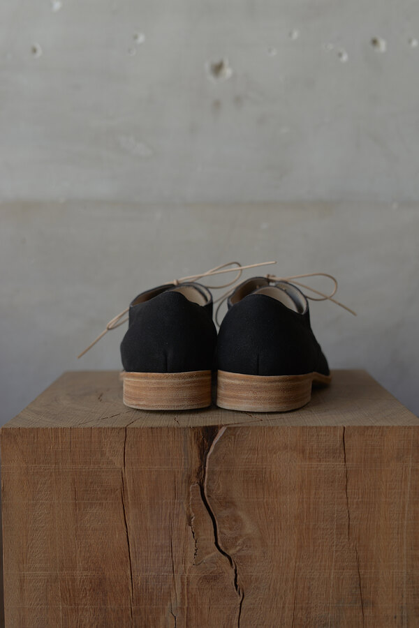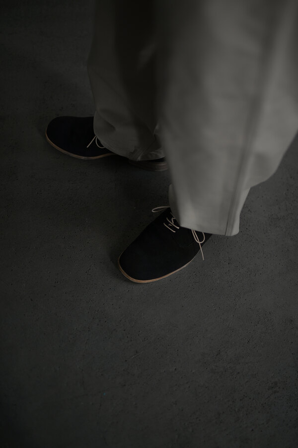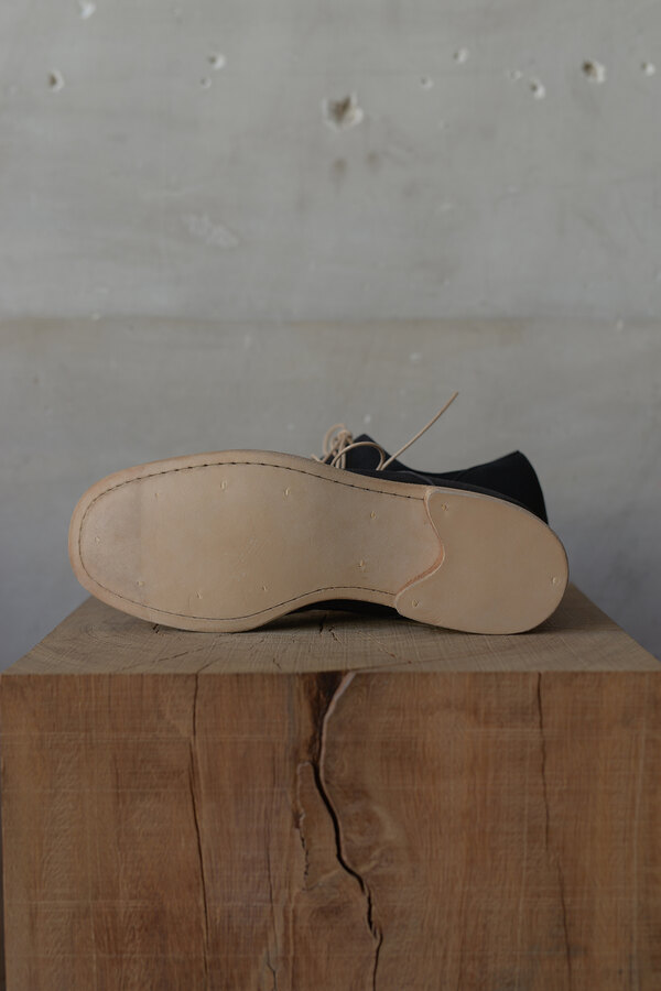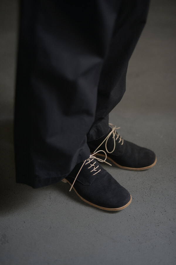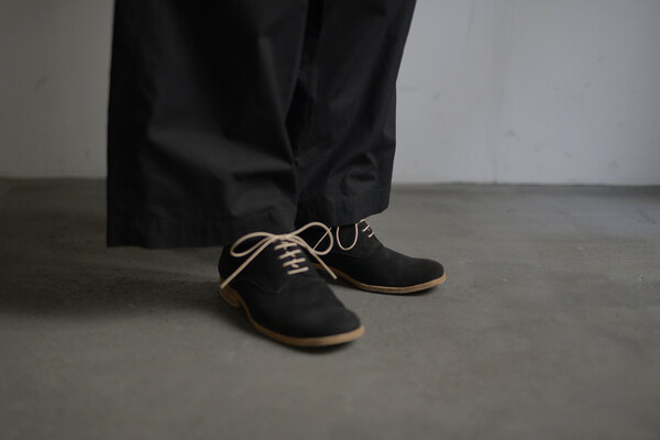 初めてPETROSOLAUMを手にしたのが10年前。その時のラストがこの02でした。この革を見た時に久しぶりに履きたいと思いました。ディアスキンに奄美大島で泥で染め、そこから藍を入れ、限りなく黒に近づけた革。染めては乾かし、染めては乾かし。とても手間のかかる作業。だからこそ素晴らしいプロダクトが生まれるのです。履いていくとどんな風に変化していくのか?聞くと少しずつ泥染めの茶色が出てくるそうです。履きこんだ先のそれを見てみたい!と思ってお店に並べることにしました。製品で洗いも掛けてあるので初めから良い雰囲気。軽やかで、柔らかく、歩いてみるととても快適でした。