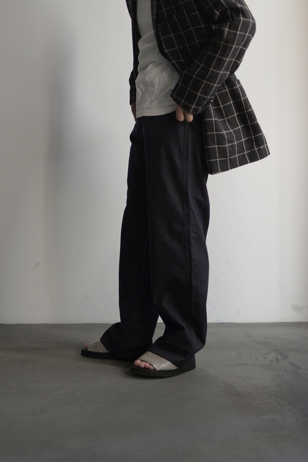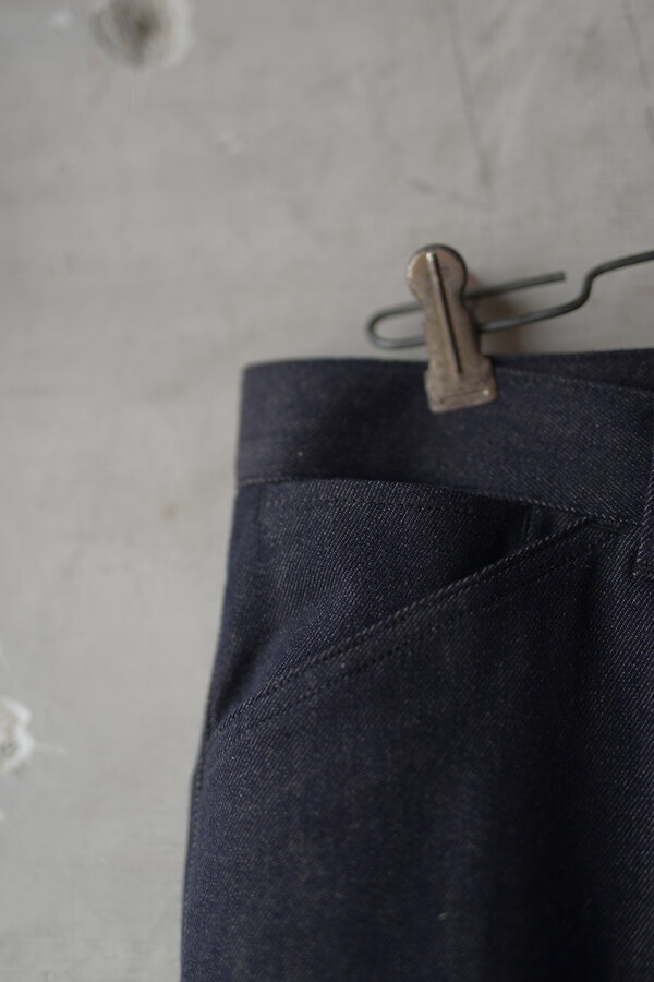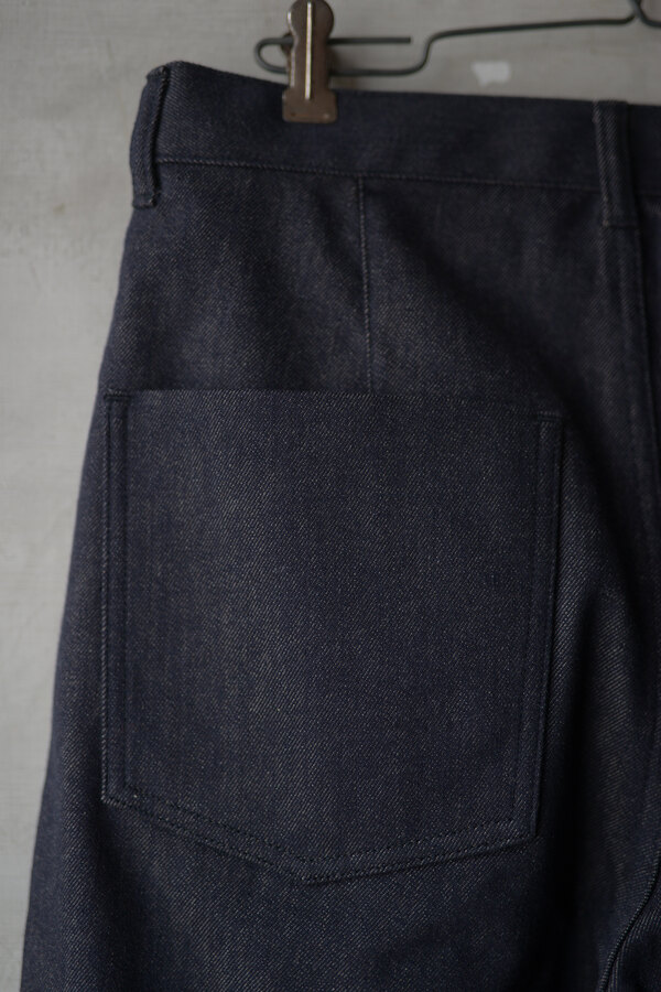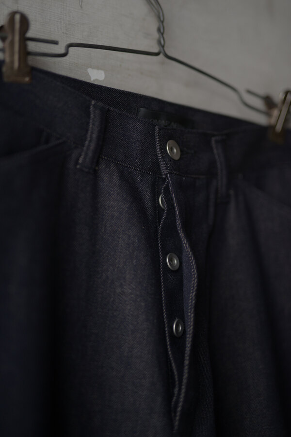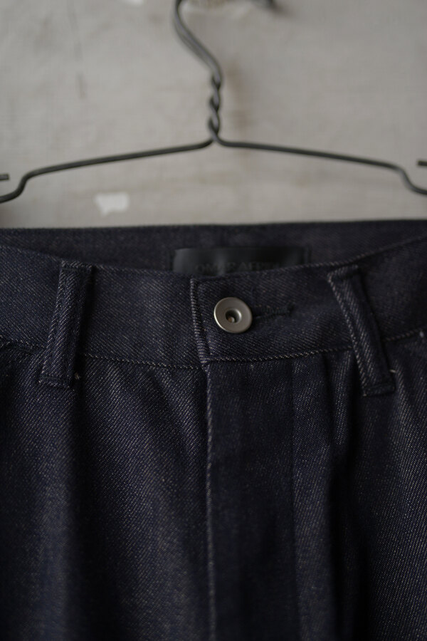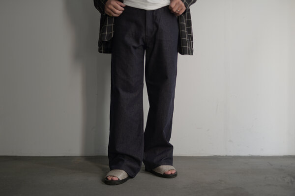 『普通は10%くらいしか入ってないと思うけど20%かぁ、だからこんなに柔らかいんやね。』とこのデニムを触ったお客様が言われていました。カシミアが入っています。デニムなのに肌が喜んでいる、そんな感じです。オンスはそこまで高くありません。軽やかに、心地よく穿けます。形は定番の5 PKT TROUSERS、太過ぎず、細過ぎず。腰回りはすっきりと。少し足長に見える気がして気分が良いです。同色のステッチでミニマムなデニム。どんな風に変化していくのか楽しみです。