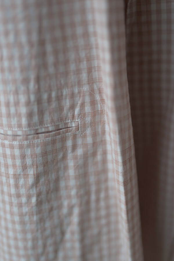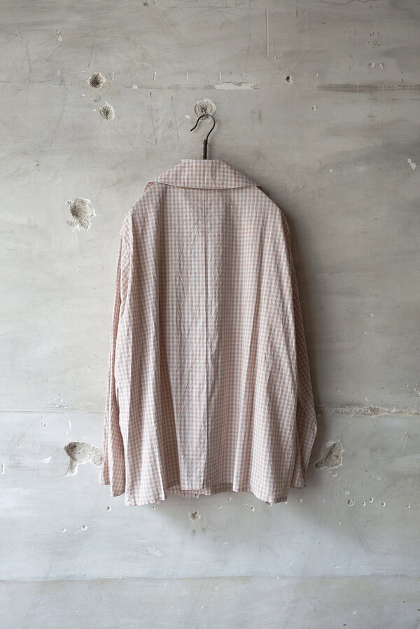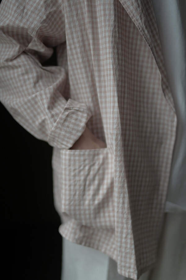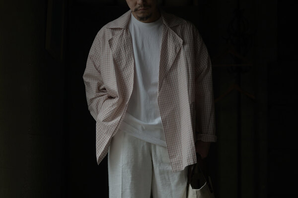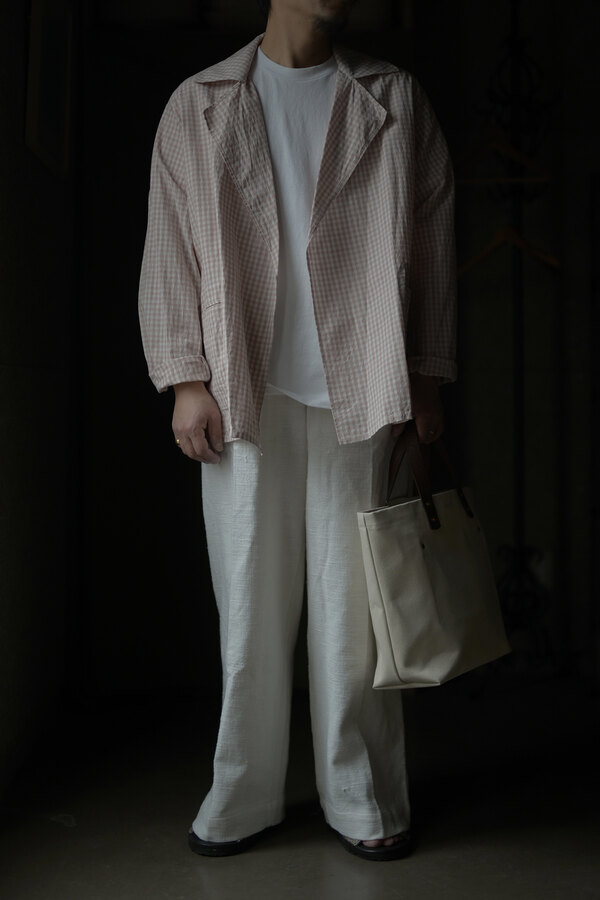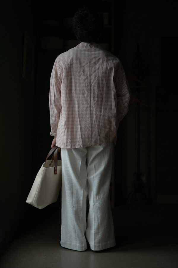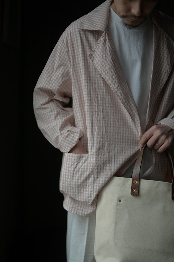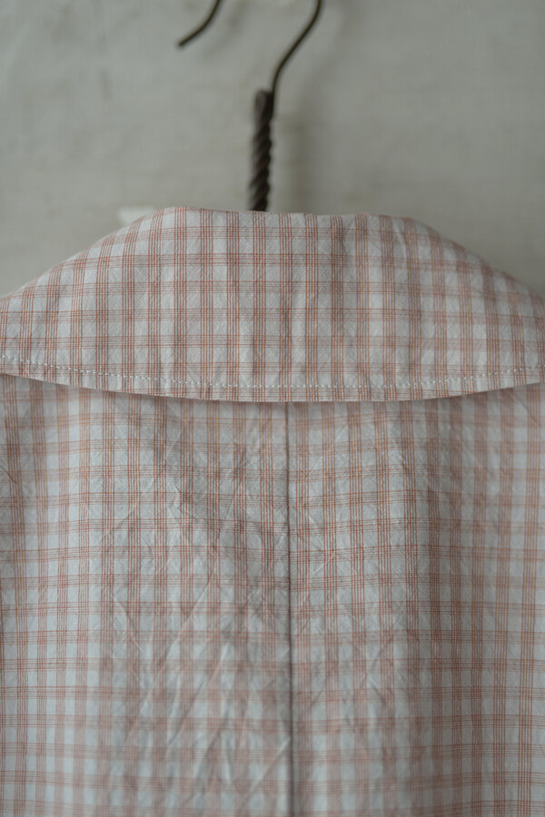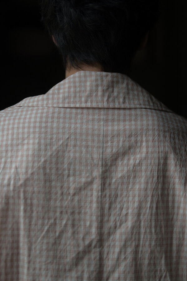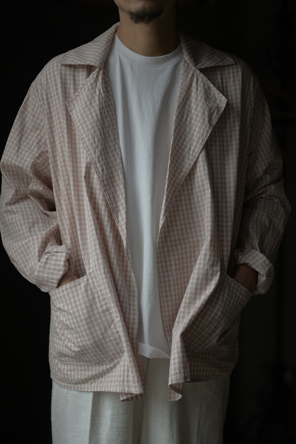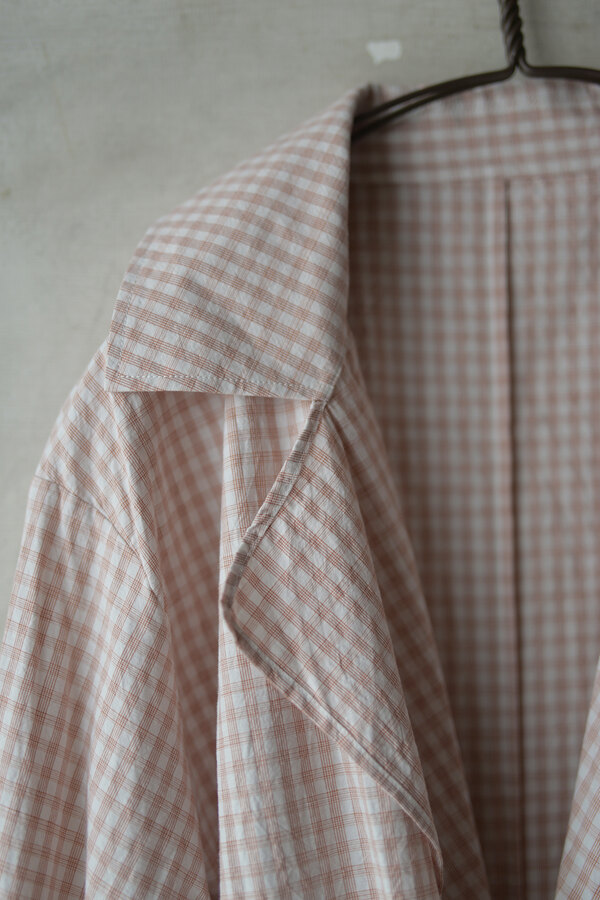 シャツでもあって、羽織でもあるTOILE SHIRT。赤という人、オレンジという人、ピンクという人。人によって感じ方が異っていました。そんなチェックはフランスのアンティーククロスを想起させられました。暑くなると結局Tシャツを着てしまいます。でもちょっと物足りなく感じる時や室内が寒いことが多くあります。そういう時に羽織たいと思いました。暑い時はカバンに忍ばせます。