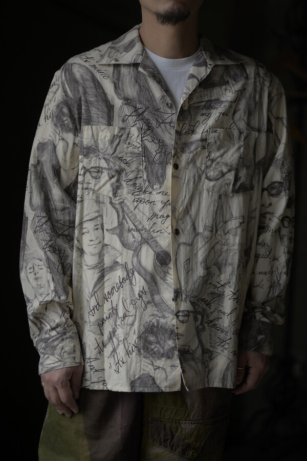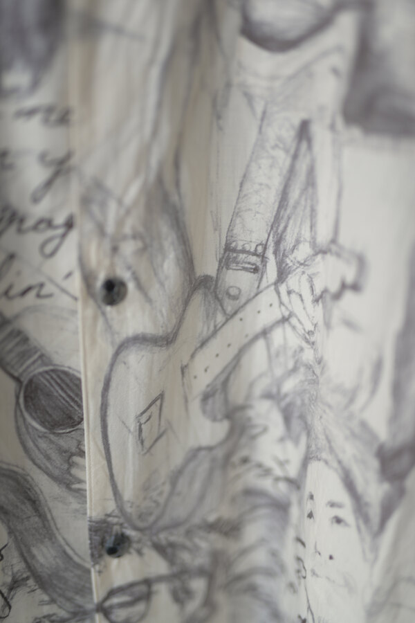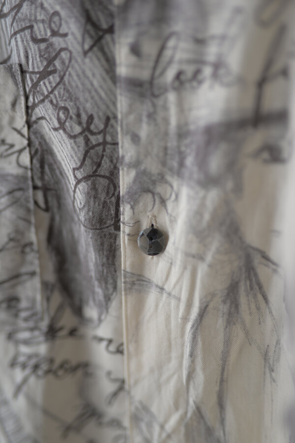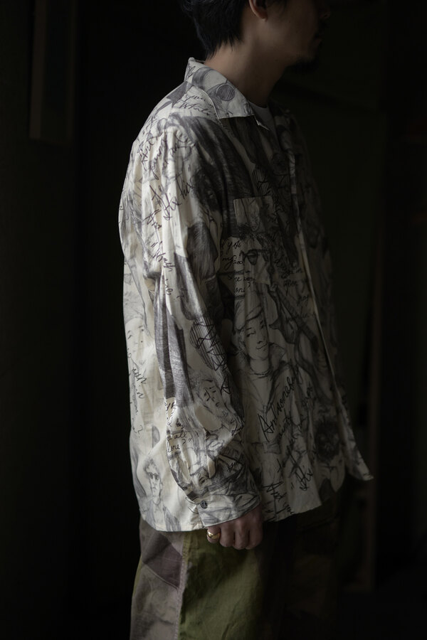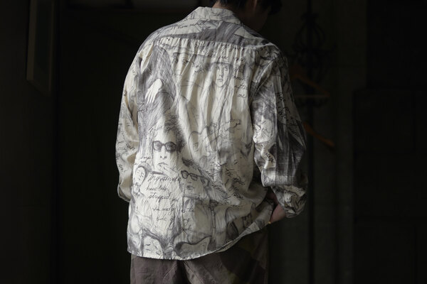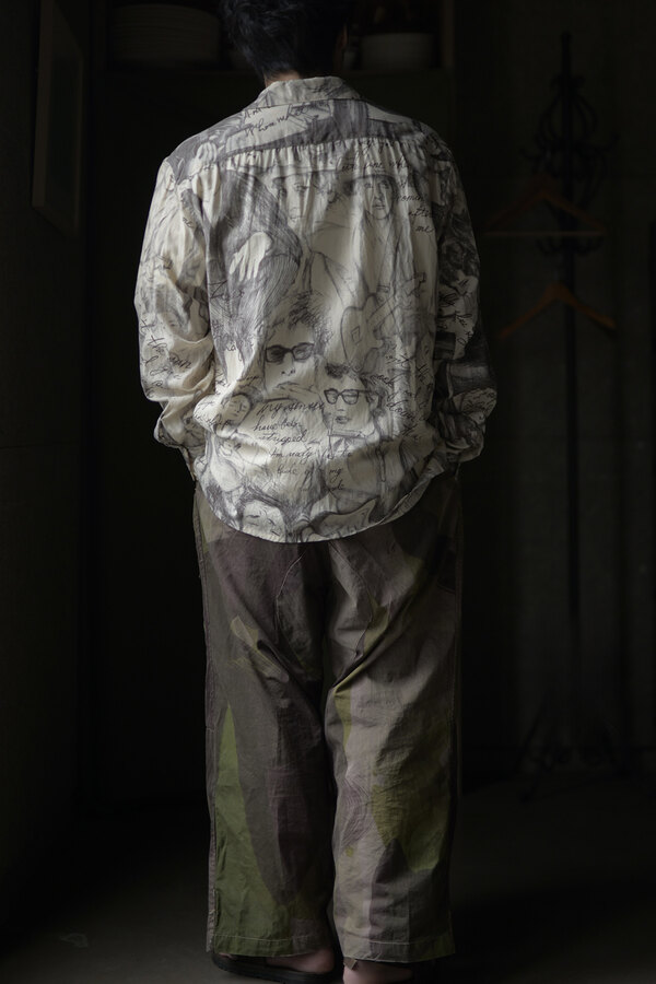 お客様とこの洋服を見上げて、模様に見えるわけでもなく、しっかりと描かれているのにごちゃごちゃしていないというか、なんというか….?と眺めていた。きっと色を使っていなかったり筆圧だったり全てのバランスとかなのかな?”好き”って最強だなと思って私も眺めた。すっごく心地よい生地はコットンとシルクが混ざっていて、柔らかい。オープンカラーなところが緊張感の無さみたいなところもそのバランスに混ざっている。