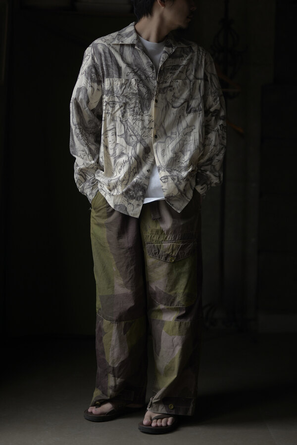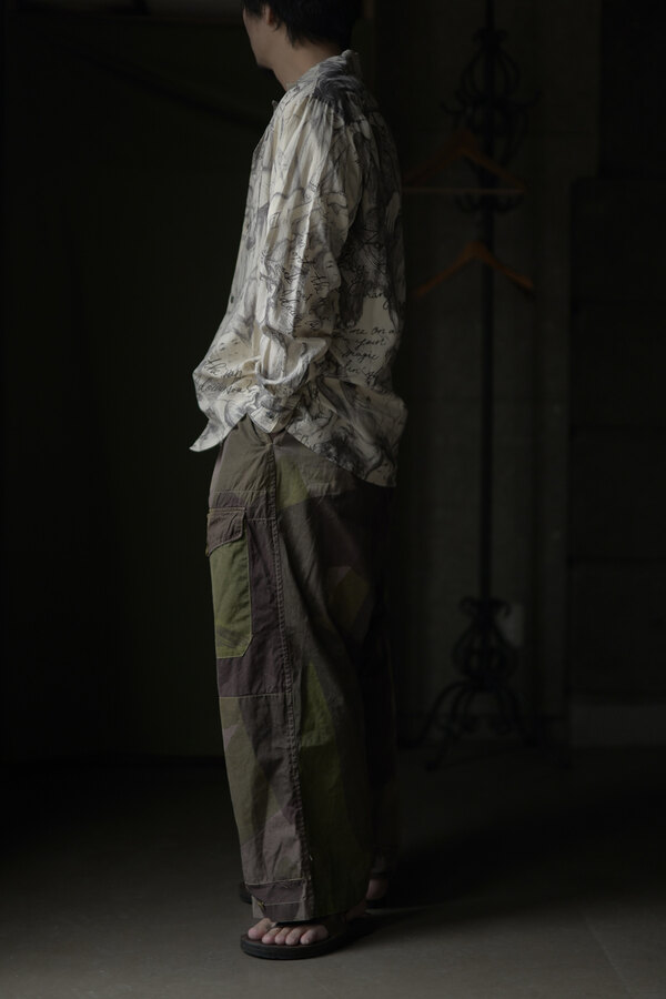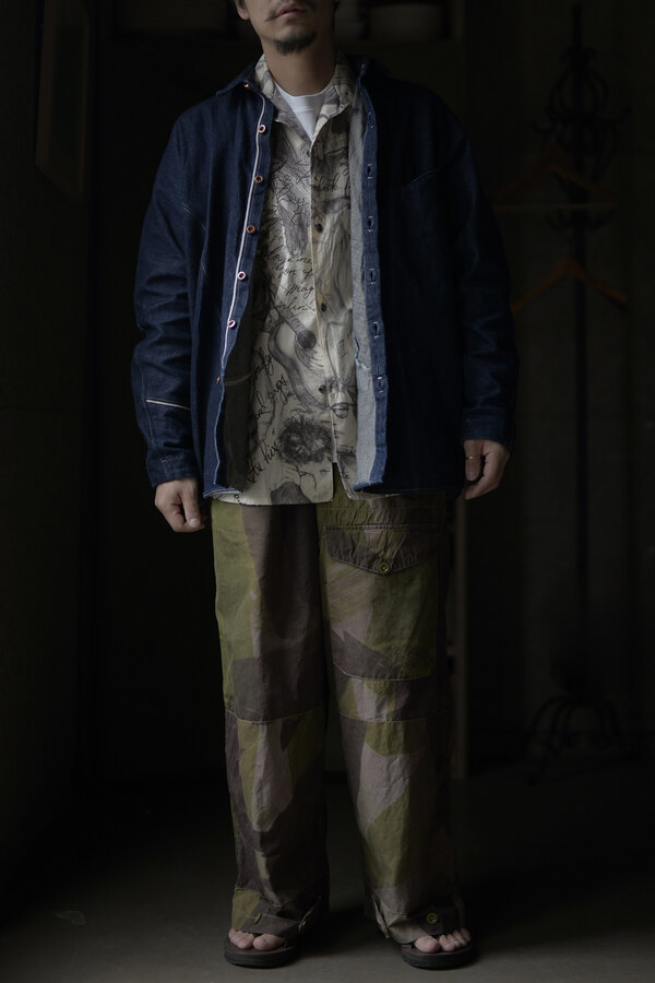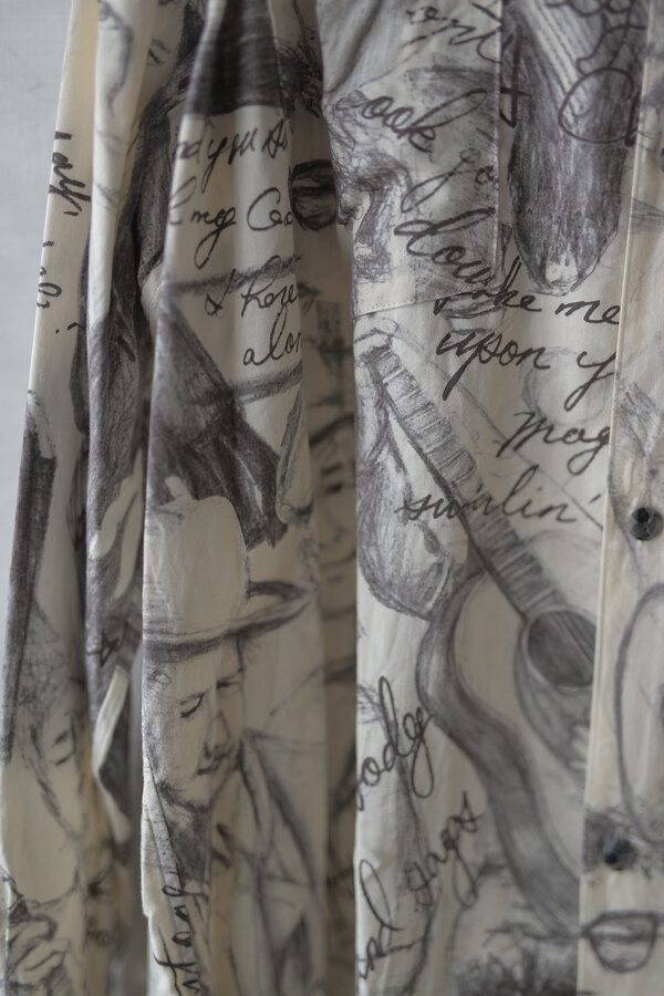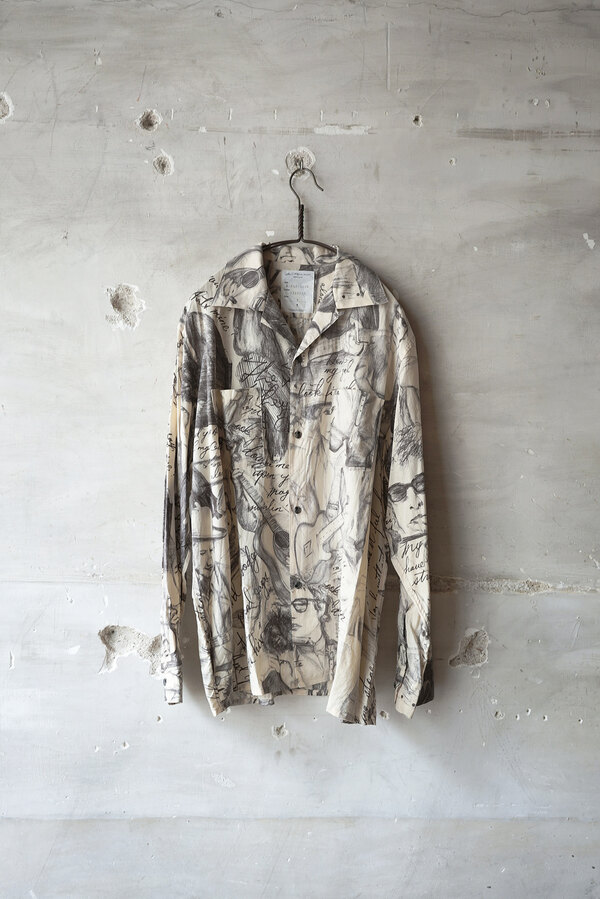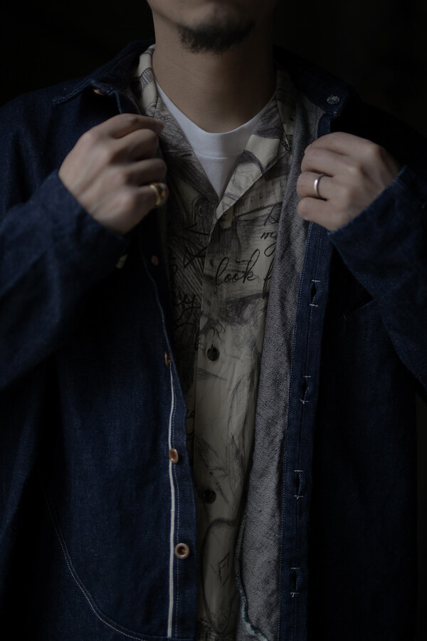 お客様とこの洋服を見上げて、模様に見えるわけでもなく、しっかりと描かれているのにごちゃごちゃしていないというか、なんというか….?と眺めていた。きっと色を使っていなかったり筆圧だったり全てのバランスとかなのかな?”好き”って最強だなと思って私も眺めた。すっごく心地よい生地はコットンとシルクが混ざっていて、柔らかい。オープンカラーなところが緊張感の無さみたいなところもそのバランスに混ざっている。