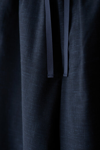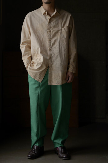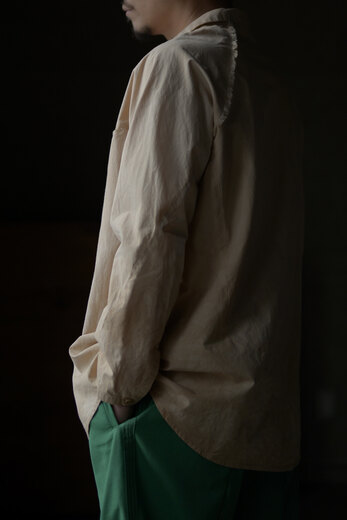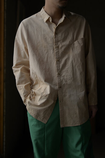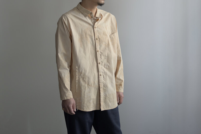 PROJECTbyH.の洋服を見る度に作る事も楽しんでいる事が伝わってくる。新作のシャツはいくつもの大胆なカーブで形成されたパターンが面白い。全く頭の中では想像が出来ない程複雑で、形になっている事が不思議に思えてくる。生地は肌に触れるとヒヤッとして滑らか、高密度に織られたコットンポプリン。染めには彼らが普段飲んでいるお茶の出涸らしを使っている。少しオレンジがかった生成り色。色の薄い部分や濃い部分があり、狙っては出来ないムラが美しい。