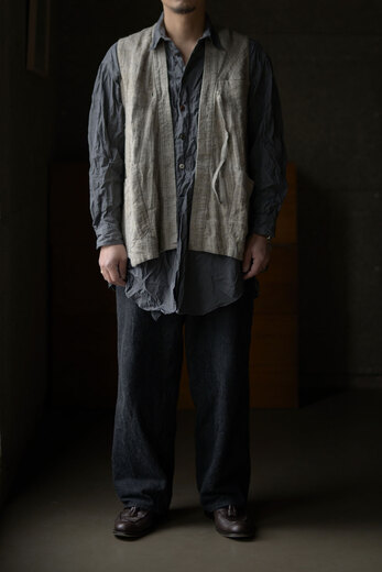 定期的に気分が回ってくるのか、長らく着ていなかったけど最近よくベストを着るようになった。ちょっと物足りない時に付け加えて、色々な洋服との組み合わせを試してみたり。それも楽しい。リネンとラミーのヘリンボーン素材で、インクとお茶で染められている。ほんのりの茶味がかった良い色。そして麻とは思えない程ニットみたいに柔らかく素肌に着たいくらい気持ちが良い。これから入ってくるCOMOLIやun/unbient、Kota GushikenのノースリーヴやOmar Afridiのタンクトップを中に着て夏を過ごすのも良さそう。