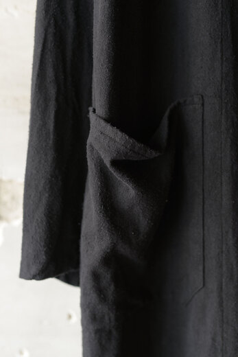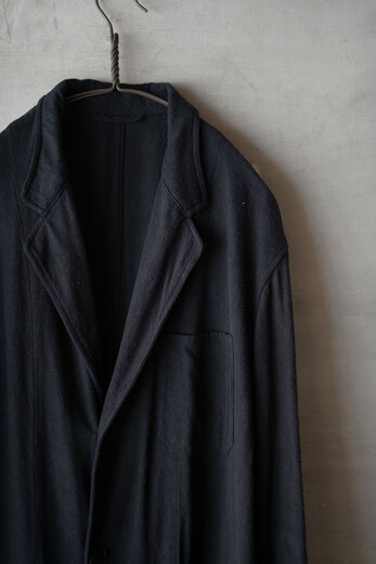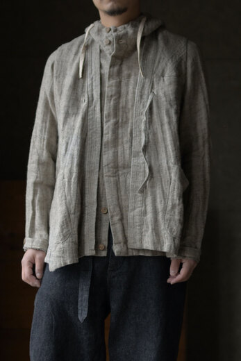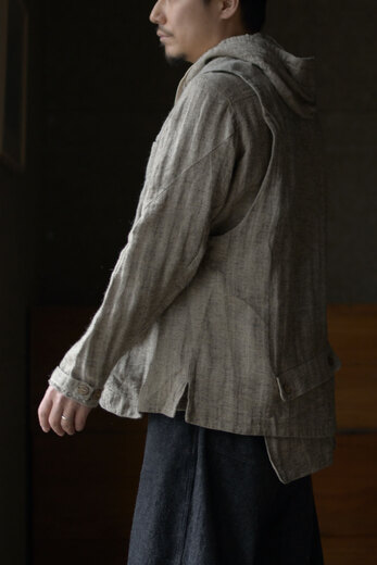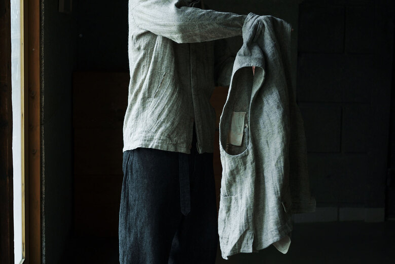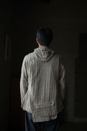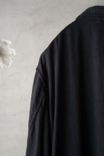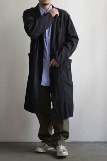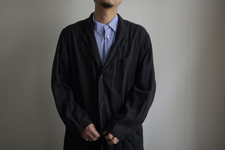 コットンでもなく、リネンでもなく、シルクが使われているのが面白いコモリのワークコート。コモリの代表的な素材であるシルクネップはシルク特有の光沢はなく荒々しい。一見シルクとは思えない生地だ。着心地も軽く、風通しも良く涼しい。ネップは着ていく内に取れていきシルク自体の柔らかさが増していく。長年着るとどんな風に変化するのか、きっと古い時代のイギリスやフランスのワークコートの様な趣になるのではないでしょうか。