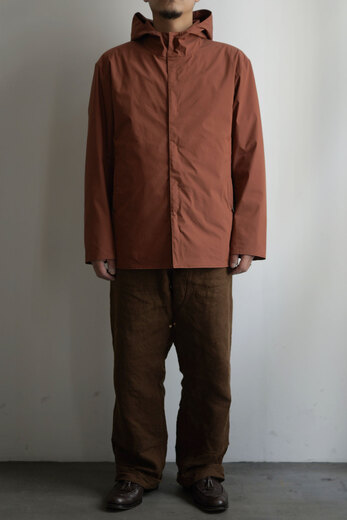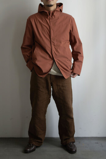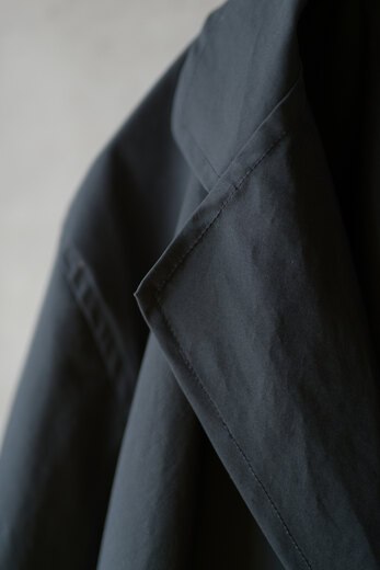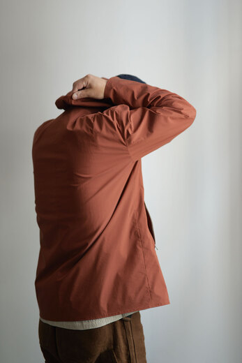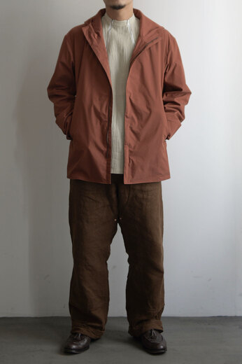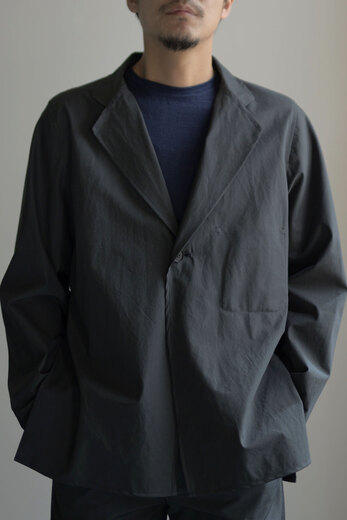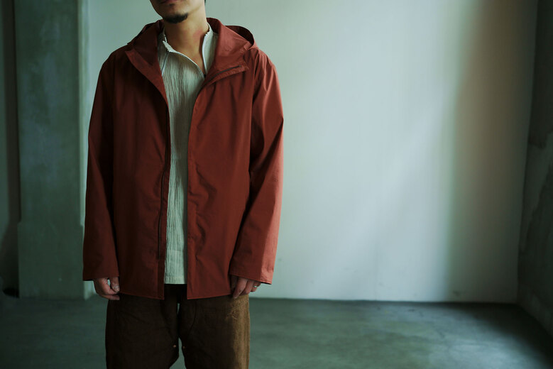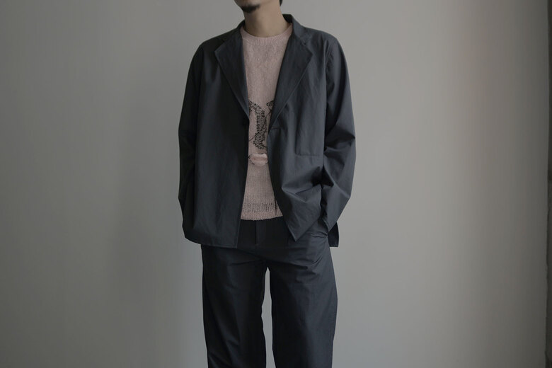 動いていると暑くなるし、じっとしていると体が冷えてくる。気温の変化が激しい春は脱いだり着たりする回数が増えるから軽くてパッと羽織れて、小さく畳める洋服があると便利だ。それはアウトドアウェアが1番近いかもしれないが、天然素材に拘る山内が提案するのはストレッチコットンに超塩縮加工と撥水加工を施した素材。それはまるで化繊と間違えてしまう位シャカシャカっとしていて塩縮とは思えない表面の滑らかさに驚いた。そしてミニマムなデザインと丁寧な作りも良い。山内のシャカシャカは品があって都会的だ。