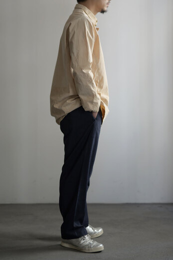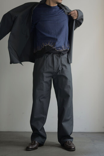 初めてseya.の洋服を見た時から瀬谷さんの作るパンツがとても好きで、穿きやすくて、大切にしているけど頻繁に穿いてしまう。ゆとりがあるけどスッキリ見えて品のあるパンツだ。ちょっと土臭い洋服(良い意味で)でも合うし、キレイにまとめても合う。革靴とだって相性が良い。ZERO JACKETやCORTと同素材のPANTS。同じく軽やかでパリッとした感触が気持ちの良いパンツで真夏も快適に使えそう。イージー仕様で腰回りは程良くフィット感があり、真っ直ぐなシルエット。ジャケットとセットアップも決まり過ぎないバランスが本当に丁度良くて、食事の時にも様になるし日常にも使い易いのではないでしょうか。