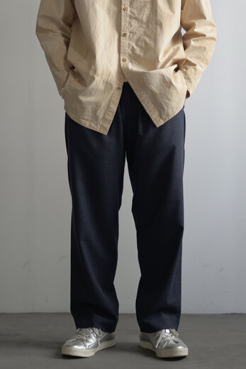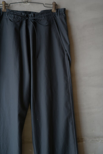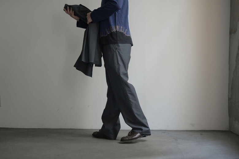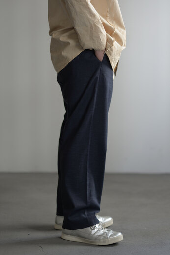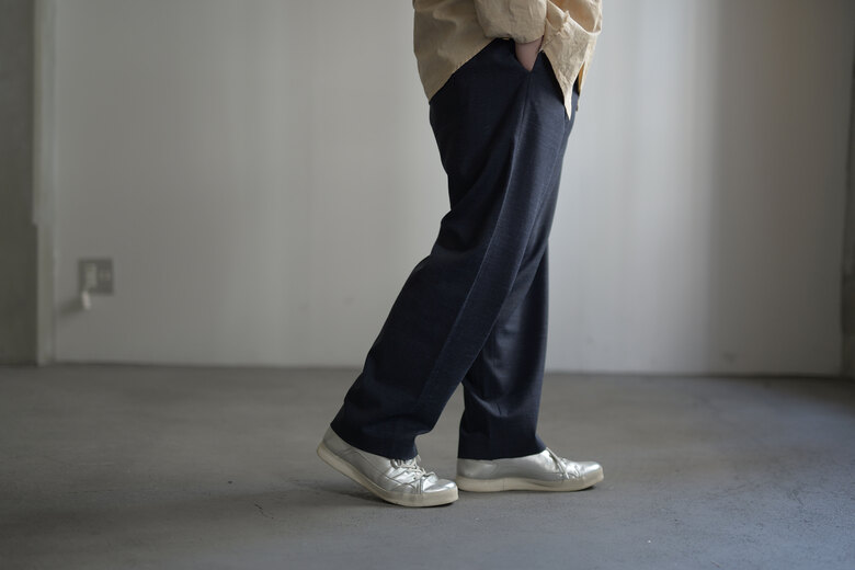 ジャージーパンツの様ような穿き易さとトラウザーズの綺麗さ、どちらもあったら嬉しい。でも探すと中々見つからない。堅牢でもなく繊細でもない。アンはそんな丁度良い洋服を作るのがいつも良いなと思う。そしてやっと暖かくなってきたから軽やかなパンツが穿きたい気分になって。ウールリネンポプリン、とても心地の良い素材だ。スニーカーでも革靴でも、シャツでもTシャツでも。気兼ねなく使えて、より良く見えるパンツ。ついつい穿いてしまいそうだ。