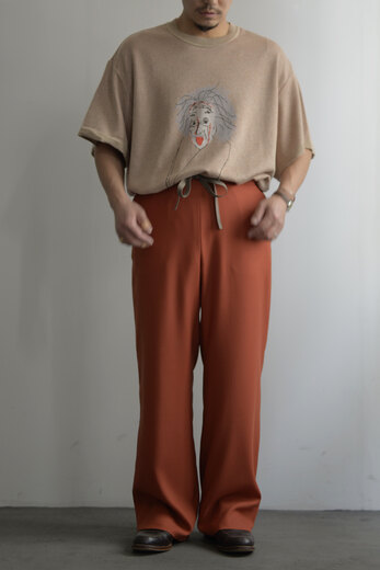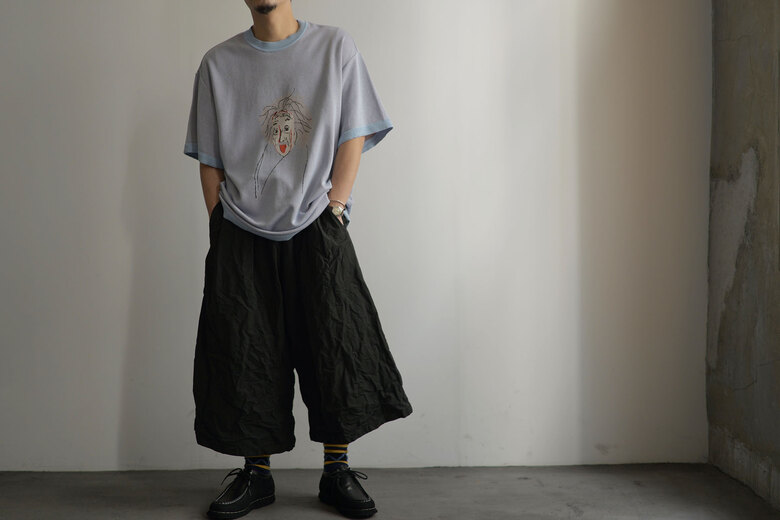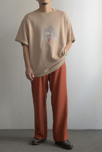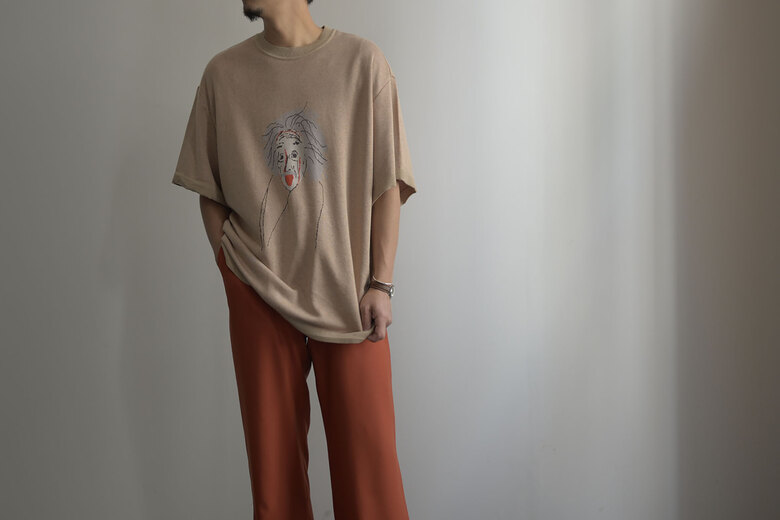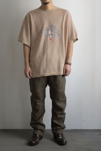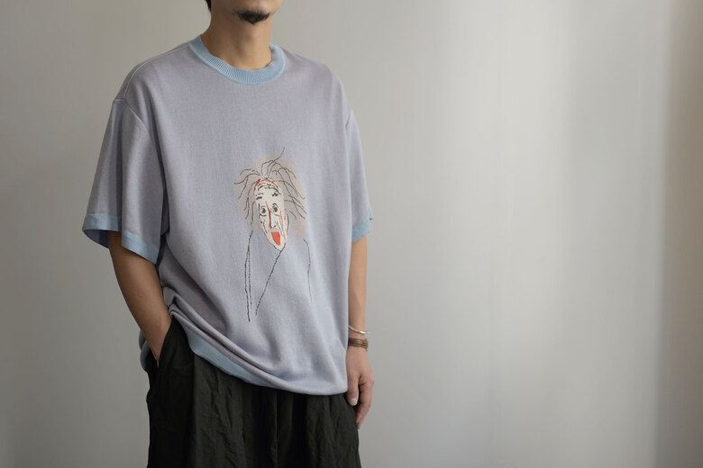 アインシュタインが描かれた背景は、デザイナーの具志堅くんがChristoper Nolanの映画を見てその映画をより深く知りたいと本を読み色々リサーチしていくとアインシュタインの名前が度々登場し、彼の偉大さを強く感じたそうです。具志堅くんは、”Christoper Nolanもアインシュタインも言葉は悪いですがばかばかしい程にまじめに本気で映画作りや研究に没頭していた方だと思いその態度に最大のリスペクトと愛を込めてニットTを作りました。”と。で、で、私たちも本気でこのニットTをカッコよく合わせてきどってみませんか?前にモナリザのニットを購入くださったお客様が、このニットを着て街を歩いていると、知ってる人はもちろん知らない人にも声をかけられる。可愛い犬の散歩をしている時に『可愛いですね』って声をかけられるあの感覚に似ている。と言っていた。そんな飼い主的な気分になれるニットで、最高に愛おしくなるニットです。糸は本来使われないコットンの産毛部分を再生繊維として生まれ変わったキュプラコットン。土に還る素材で肌触りが気持ち良い生地です。