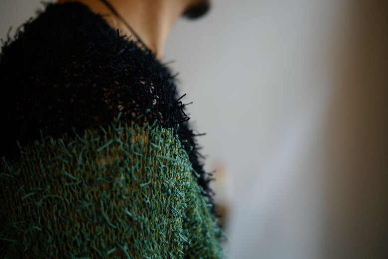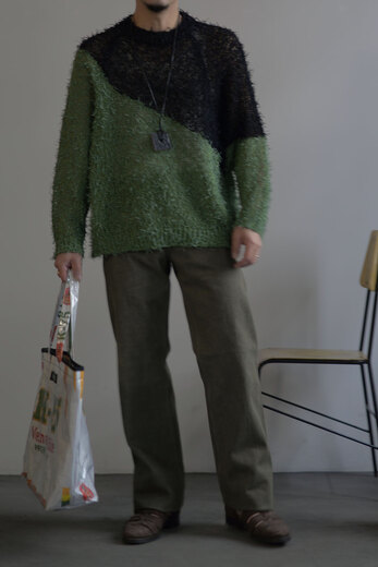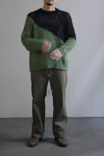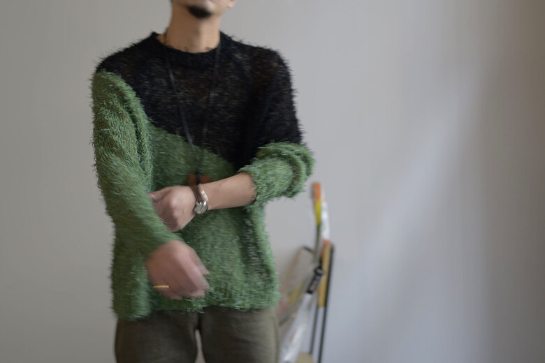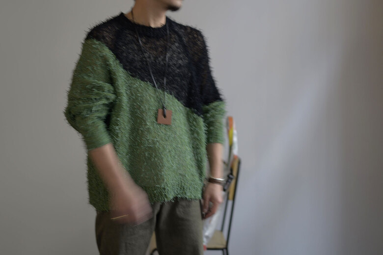 料理が運ばれてきた時に、お皿の上に綺麗に盛り付けられた料理を見て、高揚した事はないでしょうか?ワインのボトルを見てエチケットに心躍らされたりした事はないでしょうか?ガラスに注がれた液体の色目の美しさにうっとりしたり……さぁ!その後口に入れた時……..そこからも、重要なはずです。洋服も同じだと思っている。このCotton Fur Jumperは、色と色が大胆に切り替えられているが決してシャープ過ぎず、優しい。それは色の切り替わる箇所が滑らかで馴染んでいるからだと思う。そして着る側への余白がある。芝生のようにフワフワした糸はよく見ると単色ではない。ボコボコとした立体感は糸の特色と色と色の絡みでテクシュチャーが生まれている。じっくりみると単純ではない。実際手に取り、鏡で合わせた時の高鳴りの次は着心地も最大限に重要だと思っている。最終的に口に入れる行為とそれは同じで、肌触りやディテールなど、着ていて不愉快になっては残念。その2つの要素が完璧に表現されているのがKota Gushikenのニット。そんな料理なら口に入れた後の余韻を楽しむ事が出来き幸福感が得れるのではないでしょうか?