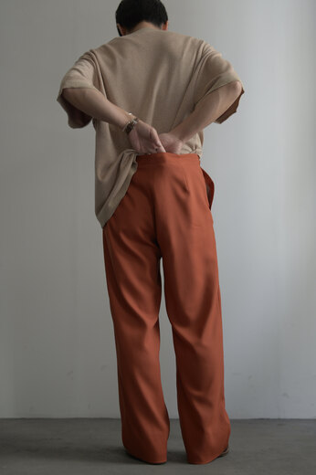 穿いた瞬間に、コレ!(欲しい!)と思わせてくれました。ドレープが美しいウールとポリエステルのトロトロな生地、大きなハトメにウルトラスエードのグレーの紐。丁度良い太さ。そして何だかめでたい気分になれる赤、赤と言っても真っ赤ではなく少しくすんだ朱色に近い色。それらのバランスが絶妙過ぎるのです。ジャージーパンツの様に楽な穿き心地なのにラグジュアリーな雰囲気もあって。洋服は楽しいという事をいつもCLASSは教えてくれているような気がします。