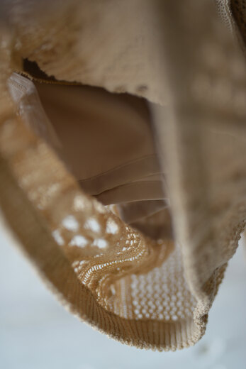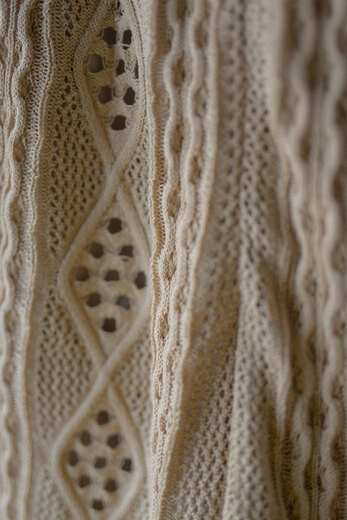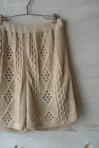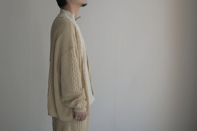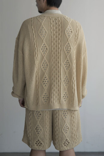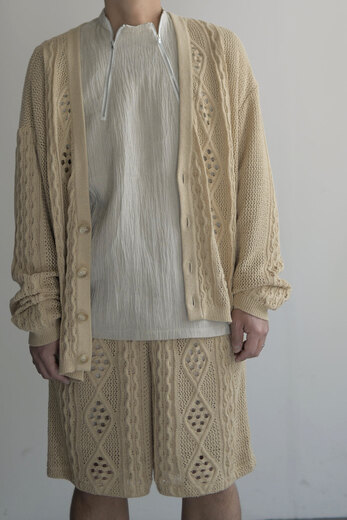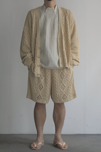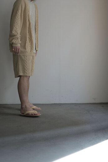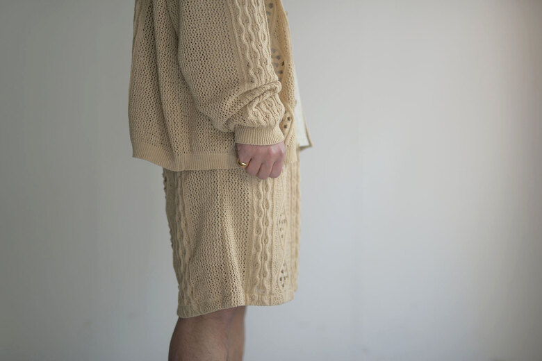 アランニットの柄をゆる〜くあんだレース柄のニット。ガシッガシッとした印象のアランニットとは真逆でダルっとゆる〜い雰囲気はKota Gushikenだからこそという感じがする。セットアップでショーツも存在する。その2つを見た時になんとも優雅でラグジュアリーな感じがした。ゴールドのアクセサリーをして少し背伸びをしたサンダルを履いて、日差しを浴びるバケーションのような日常。そんな映画の中のような世界をしてみたいと。或いは、ネックが伸びきった古着のタンクトップ なんかと合わせてもまた違った印象で面白いんじゃないか?と撮影しながらまた想像していた。”大人”だからこそ遊んで洋服を楽しむ術をもう1度教えてくれている気がする。